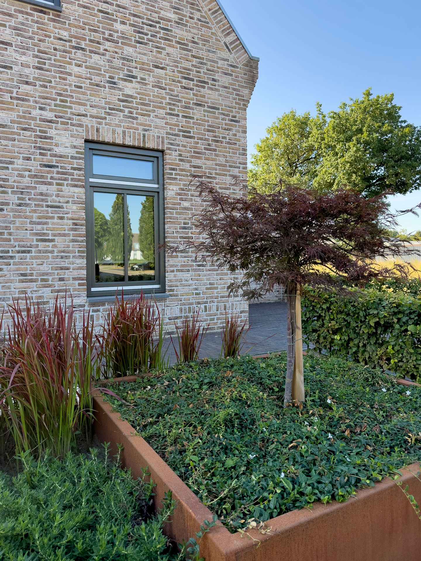 - Voor- en achtertuin onder architectuur aangelegd met bewateringssysteem en drain bij oprit-