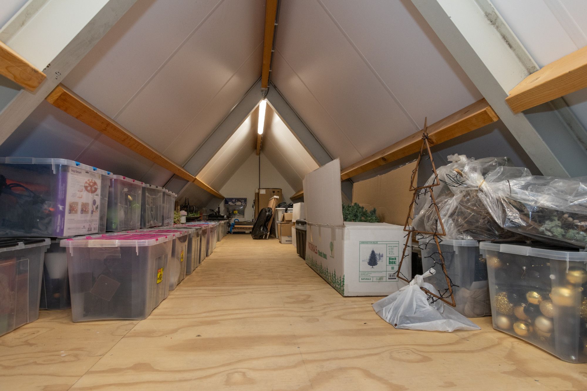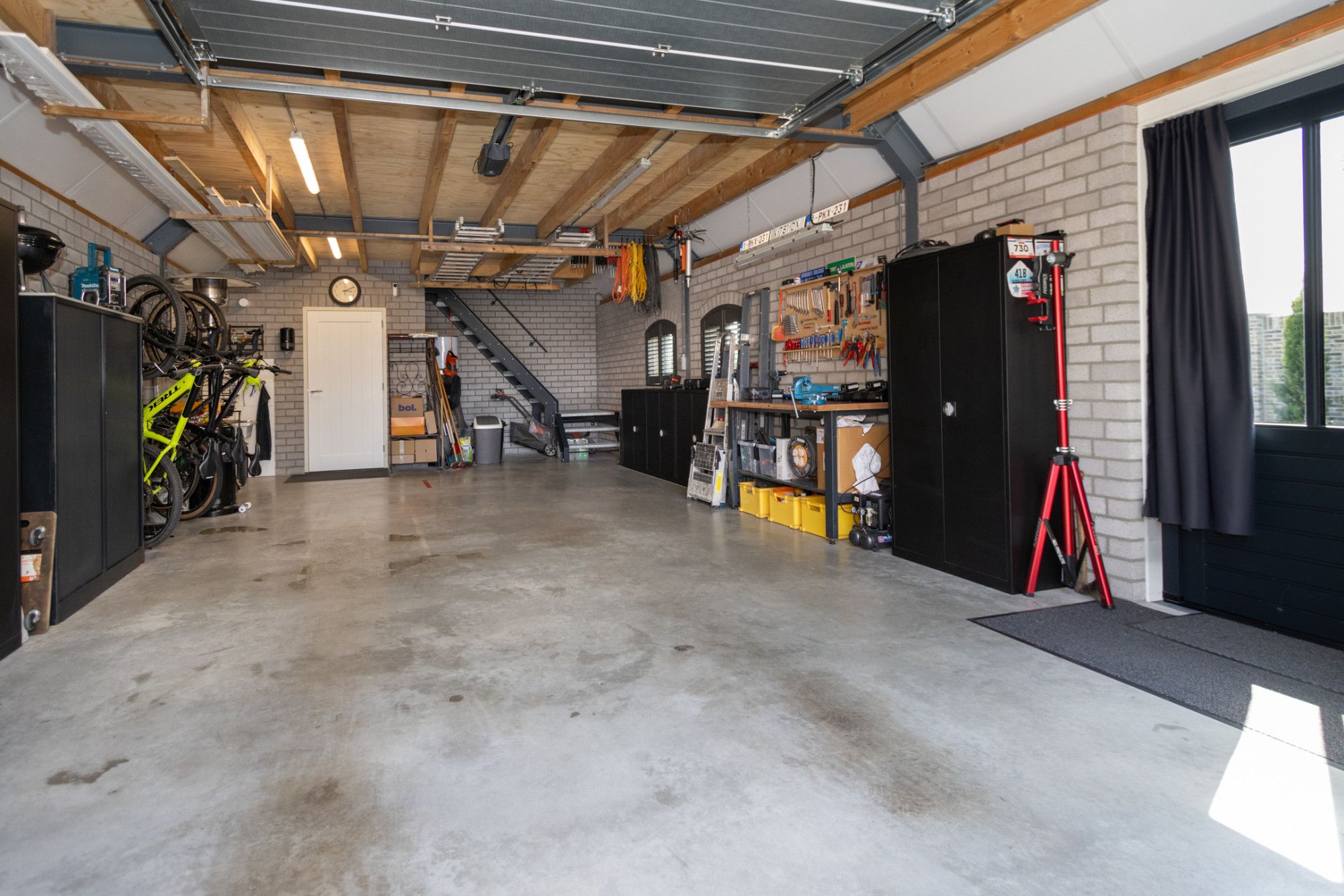 De vrijstaande garage is in spouw gebouwd, volledig geïsoleerd en voorzien van een ruime vliering, bereikbaar via een vaste stalen trap. De garage beschikt over een elektrische kantelpoort, een eigen doucheruimte en toilet, een aparte boiler, vloerverwarming en een aansluiting op de centrale AstroVac-stofzuiginstallatie. Daarnaast is er een eigen meterkast, waarin ook de omvormer van de 16 zonnepanelen is ondergebracht. Net als de woning is ook de garage uitgerust met een alarmsysteem van Verisure.