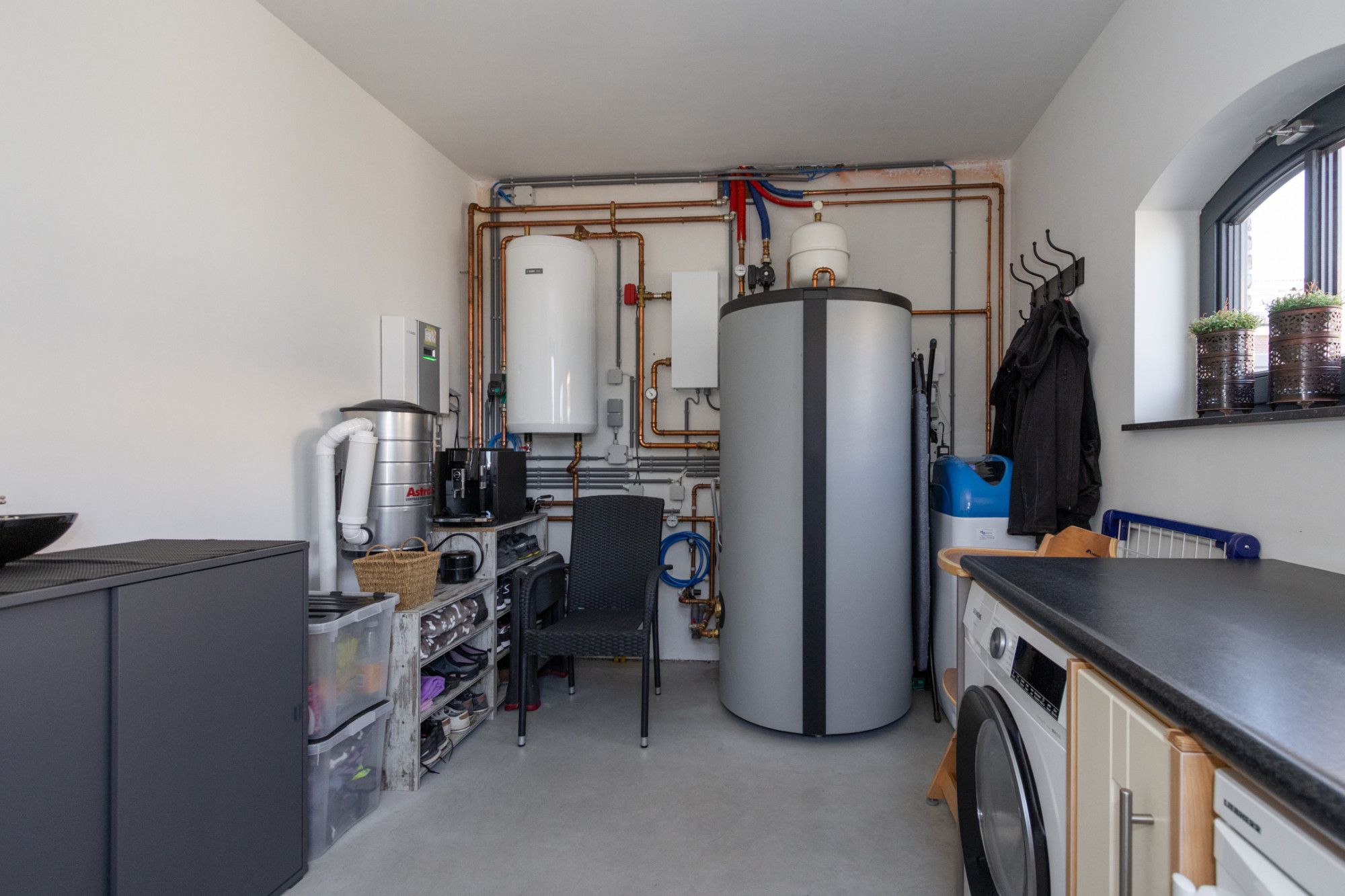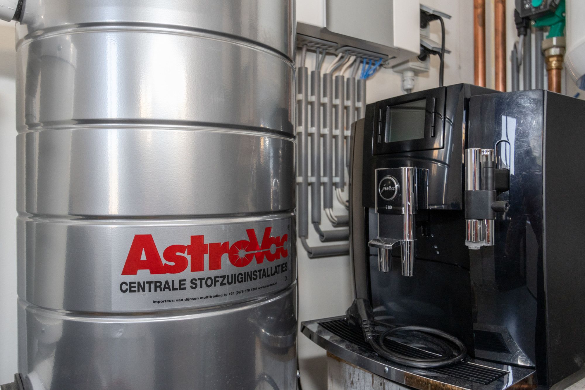 In de aangrenzende berging bevinden zich de technische installaties, waaronder de warmtepomp, boiler en waterontharder. Daarnaast zijn hier de witgoedaansluitingen te vinden, met daarboven een praktisch werkblad. Ook de centrale stofzuiginstallatie van AstroVac is hier geplaatst, met meerdere aansluitpunten verspreid door de woning en garage, wat zorgt voor extra comfort in het dagelijks huishouden.