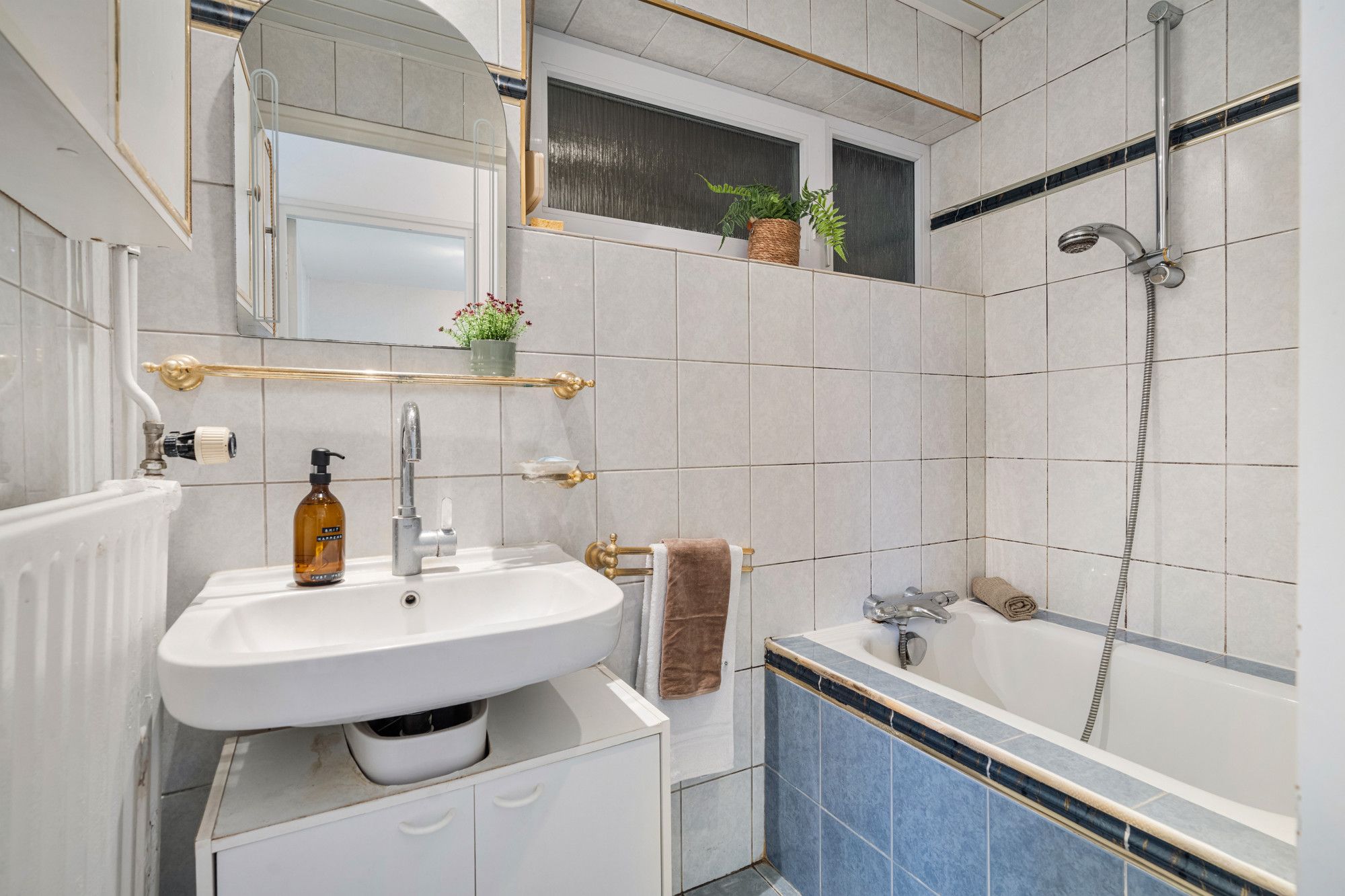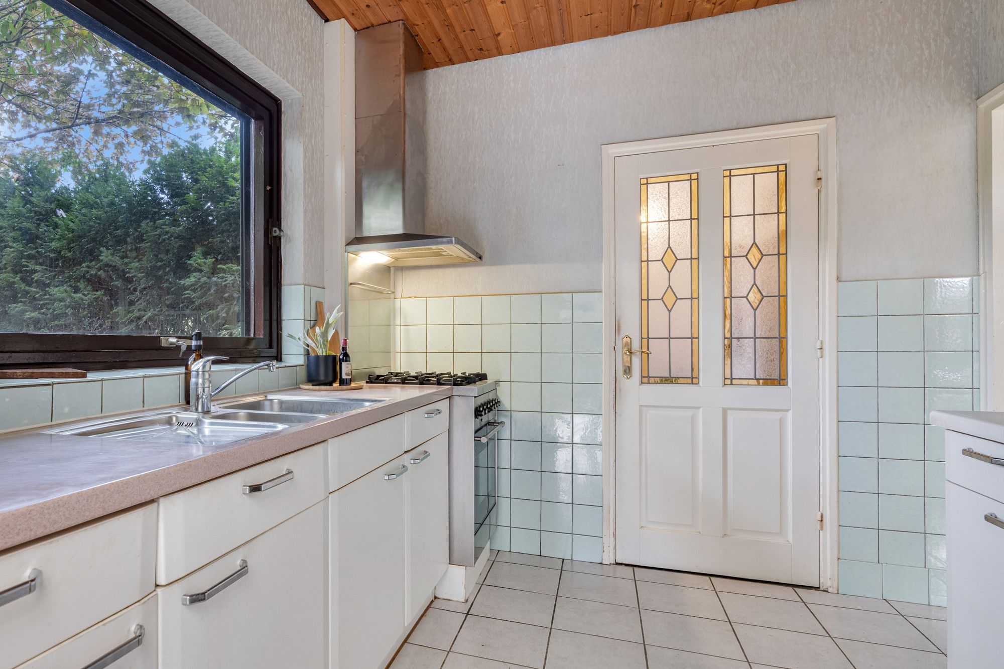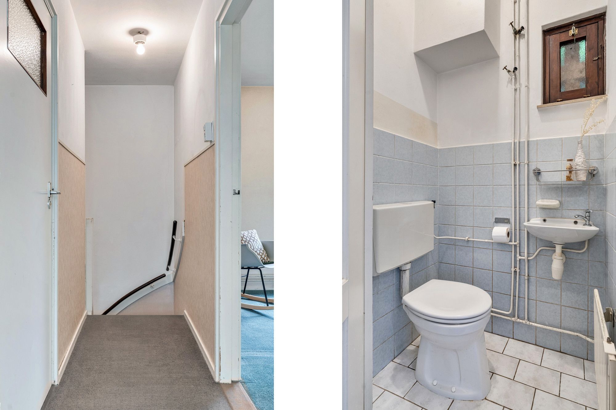 Je betreedt de woning via een betegelde hal met binnenbrievenbus, kapstok, meterkast en een praktische opbergkast. Rechts van de entree bevindt zich het toilet met fonteintje. Vanuit de hal leidt een sfeervolle glas-in-looddeur naar de gesloten keuken.