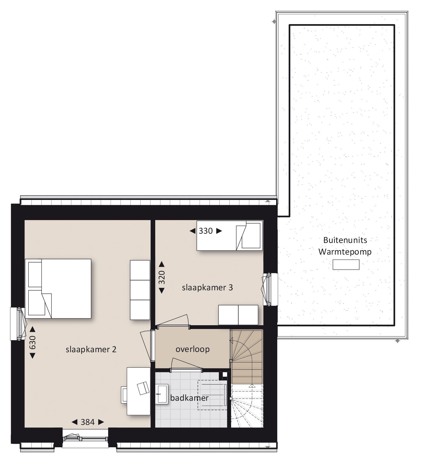 Op de eerste verdieping bevinden zich optioneel twee riante slaapkamers. Ideaal als extra slaapkamer voor gasten, hobbyruimte of werkplek. Erg comfortabel is zonder twijfel ook de aangrenzende badkamer met wastafel en inloopdouche.