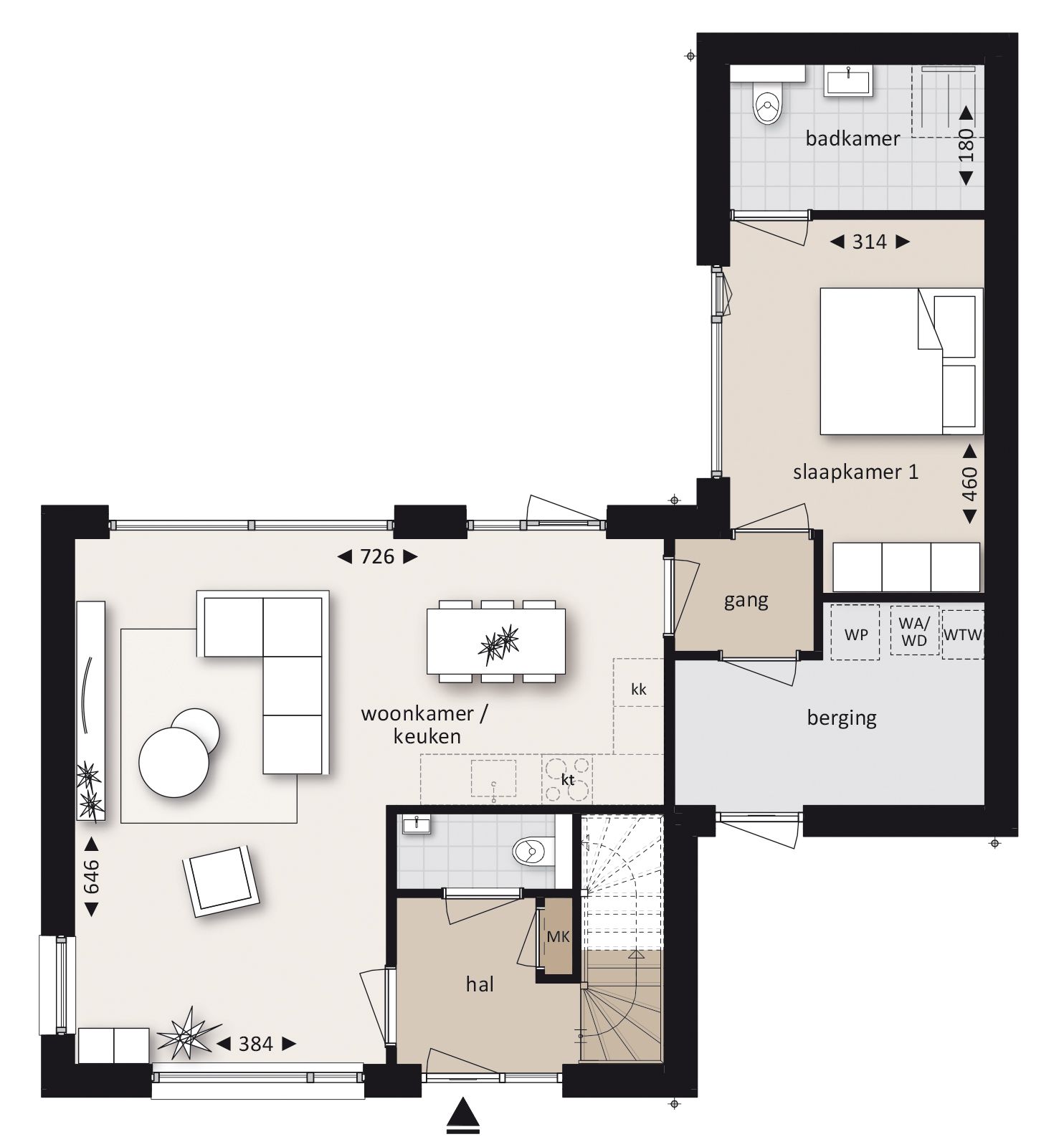 De riante leefruimte bestaat uit een zitgedeelte en een eetgedeelte met open keuken. Grote raampartijen zorgen voor veel daglicht en een directe verbinding met de aangrenzende tuin, waardoor binnen en buiten naadloos op elkaar aansluiten. Via de woonkamer heeft u toegang tot de hoofdslaapkamer op de begane grond. Deze heeft de beschikking over een eigen badkamer met onder meer een inloopdouche, een wastafel en tweede toilet. De badkamer is betegeld tot plafondhoogte en voorzien van sanitair van Villeroy & Boch.