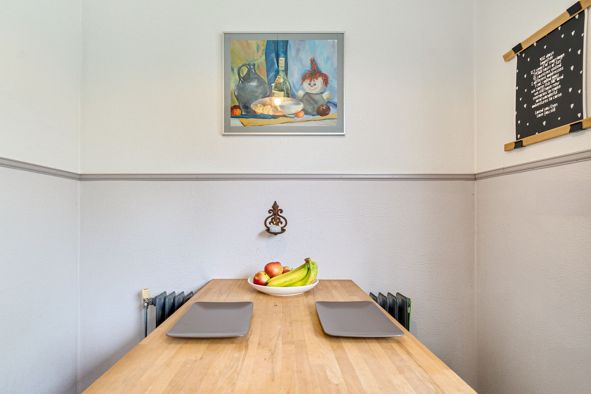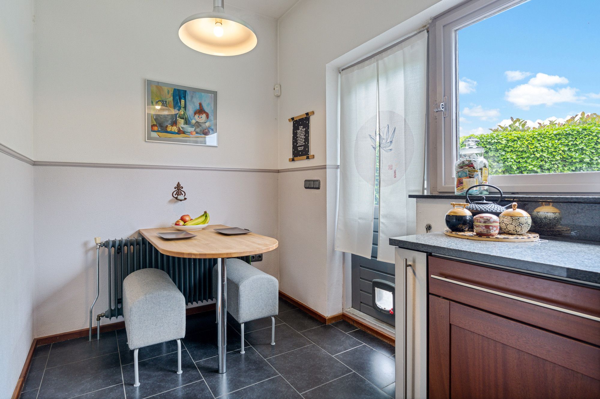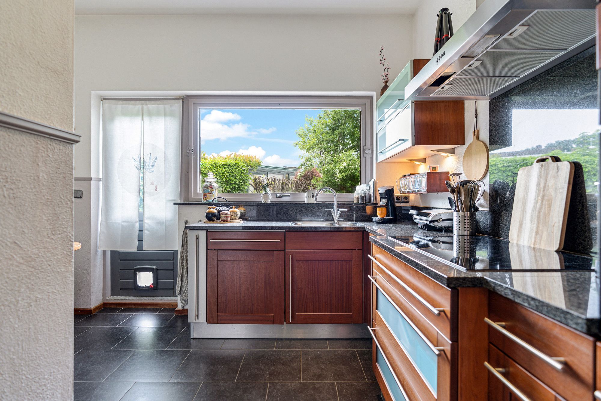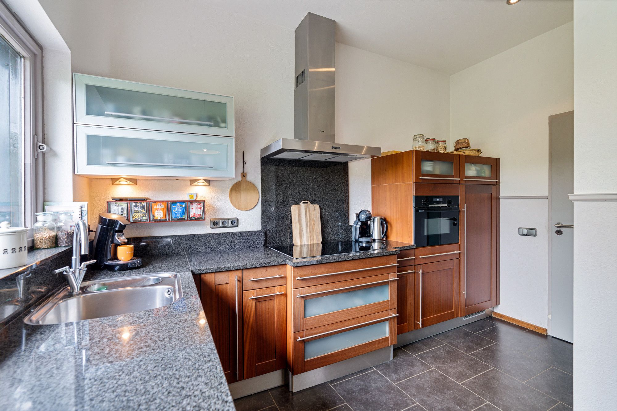 De keuken is betegeld en uitgerust met moderne apparatuur: inductiekookplaat, afzuigkap, koelkast, combimagnetron en vaatwasser. Ook vanuit de keuken is er toegang tot de tuin via een aparte buitendeur.