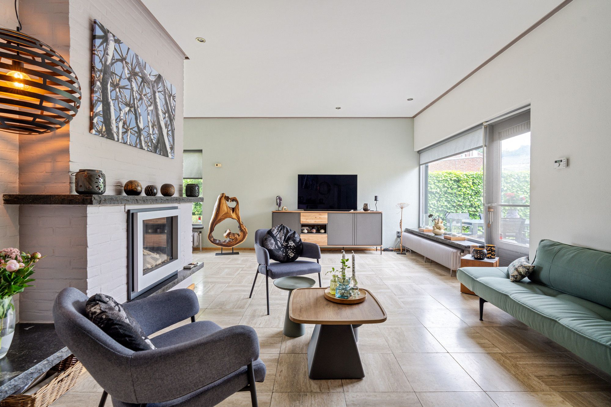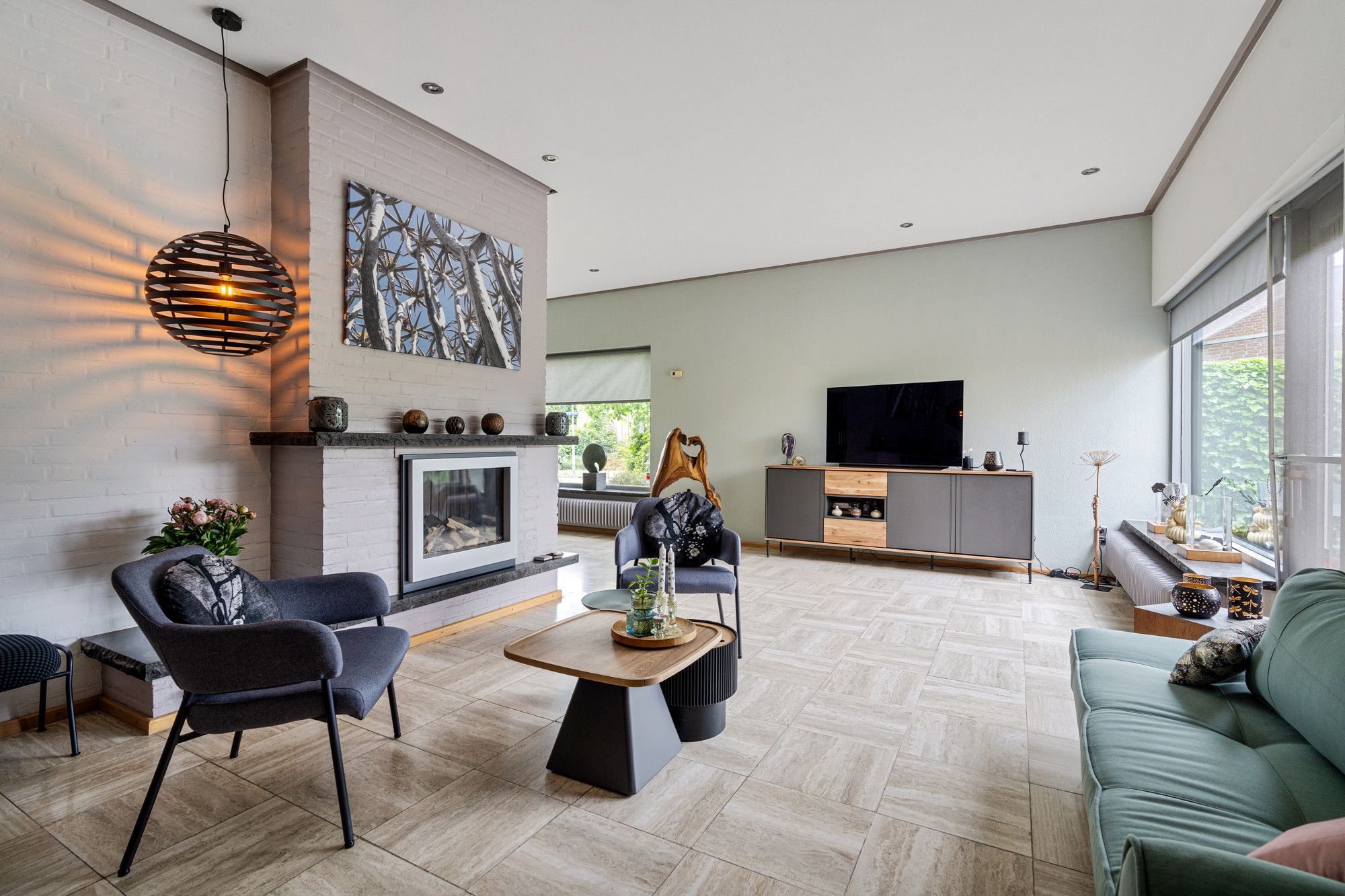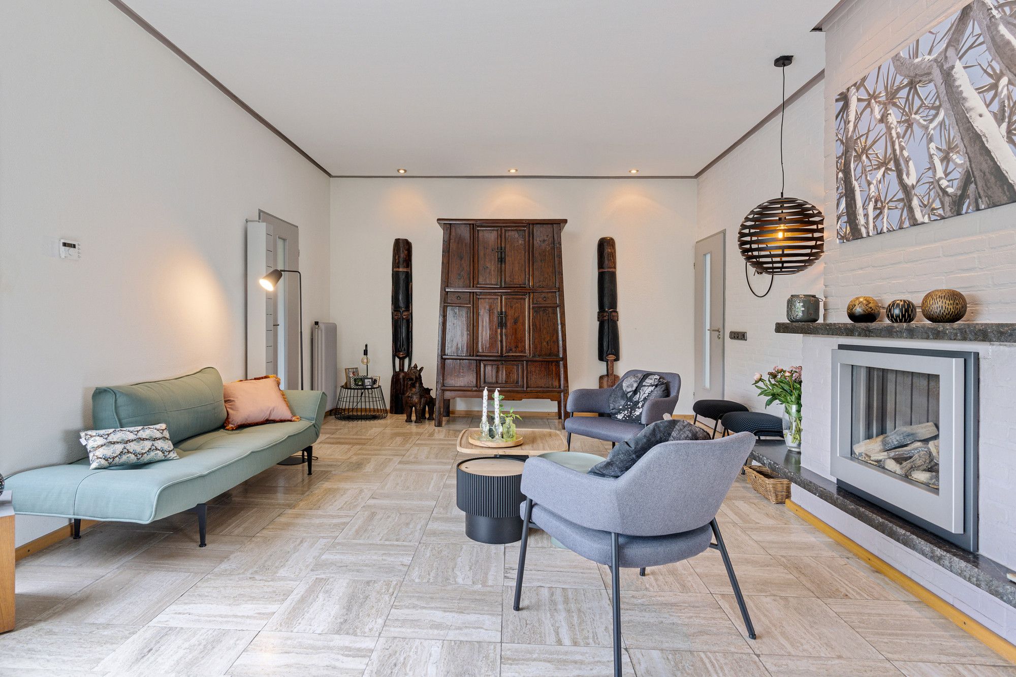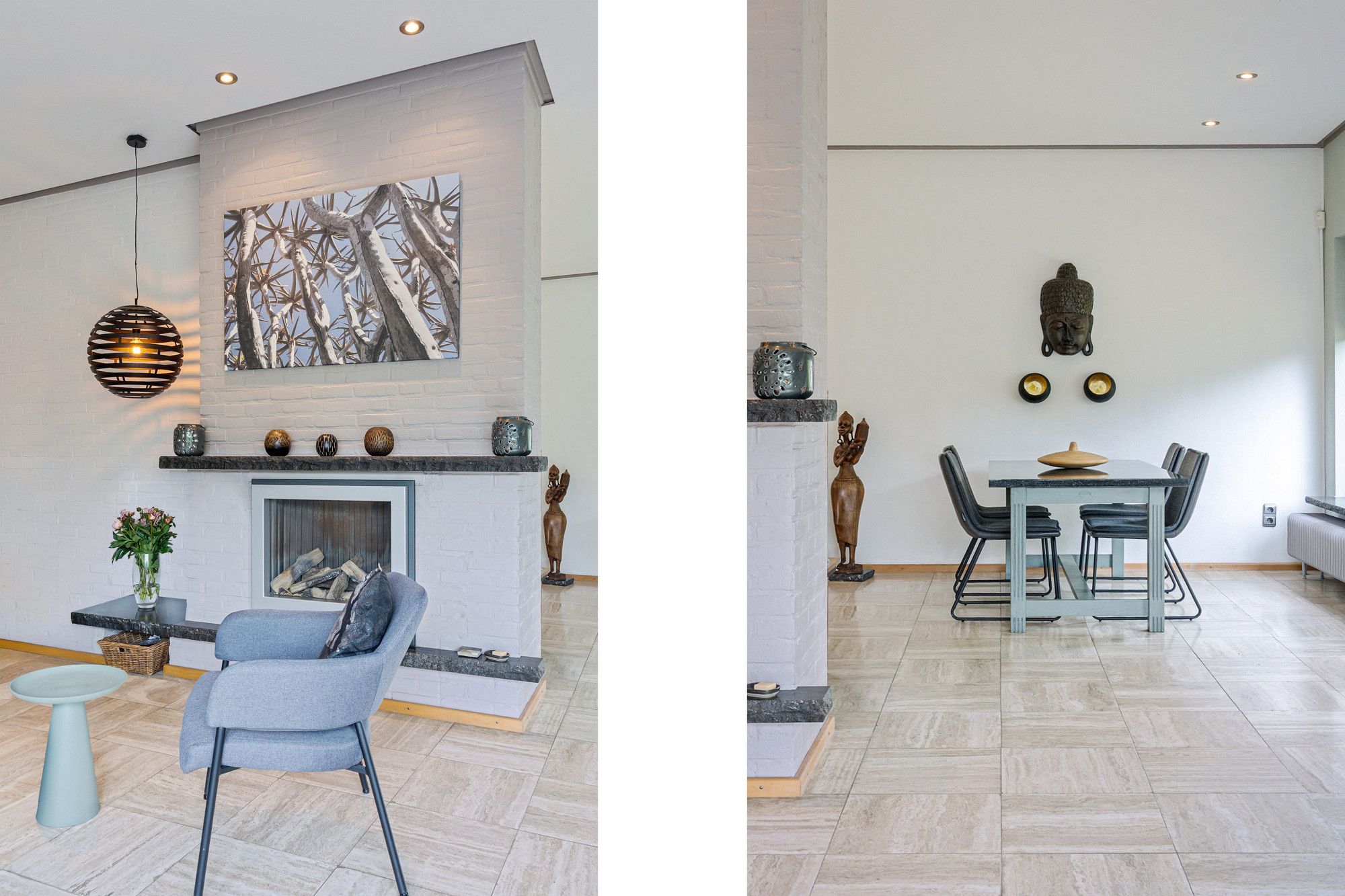 De woonkamer is speels ingedeeld in een gezellige U-vorm met een betegelde vloer en sfeervolle spotverlichting. In het zitgedeelte zorgt de open haard voor een warme ambiance. Vanuit de woonkamer is er een directe doorgang naar de achtertuin via een tuindeur – ideaal voor wie binnen en buiten graag met elkaar verbindt.