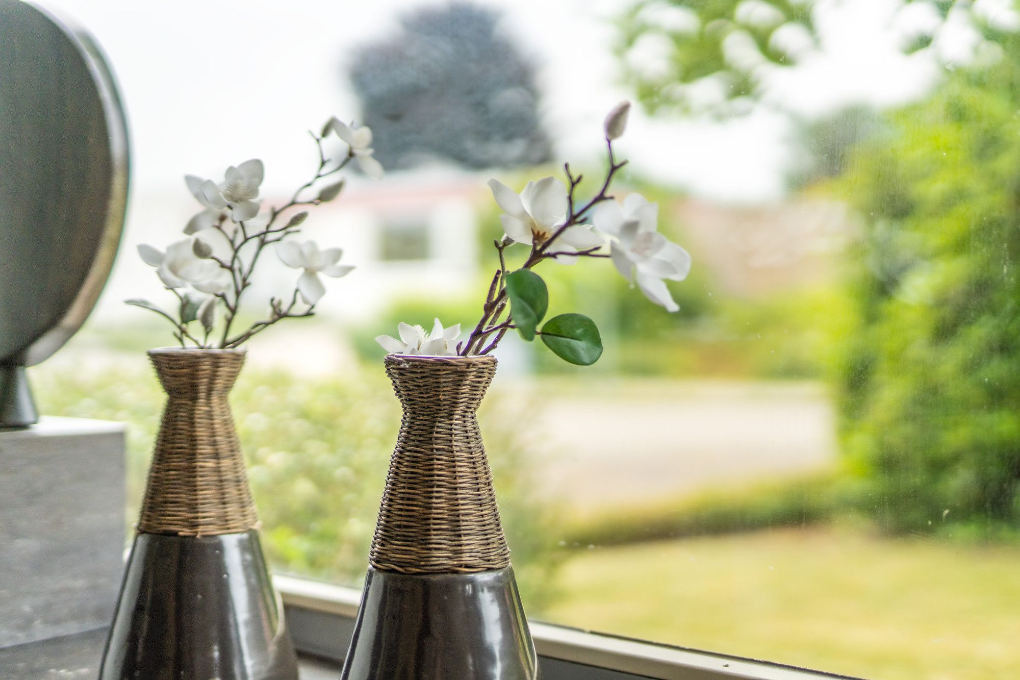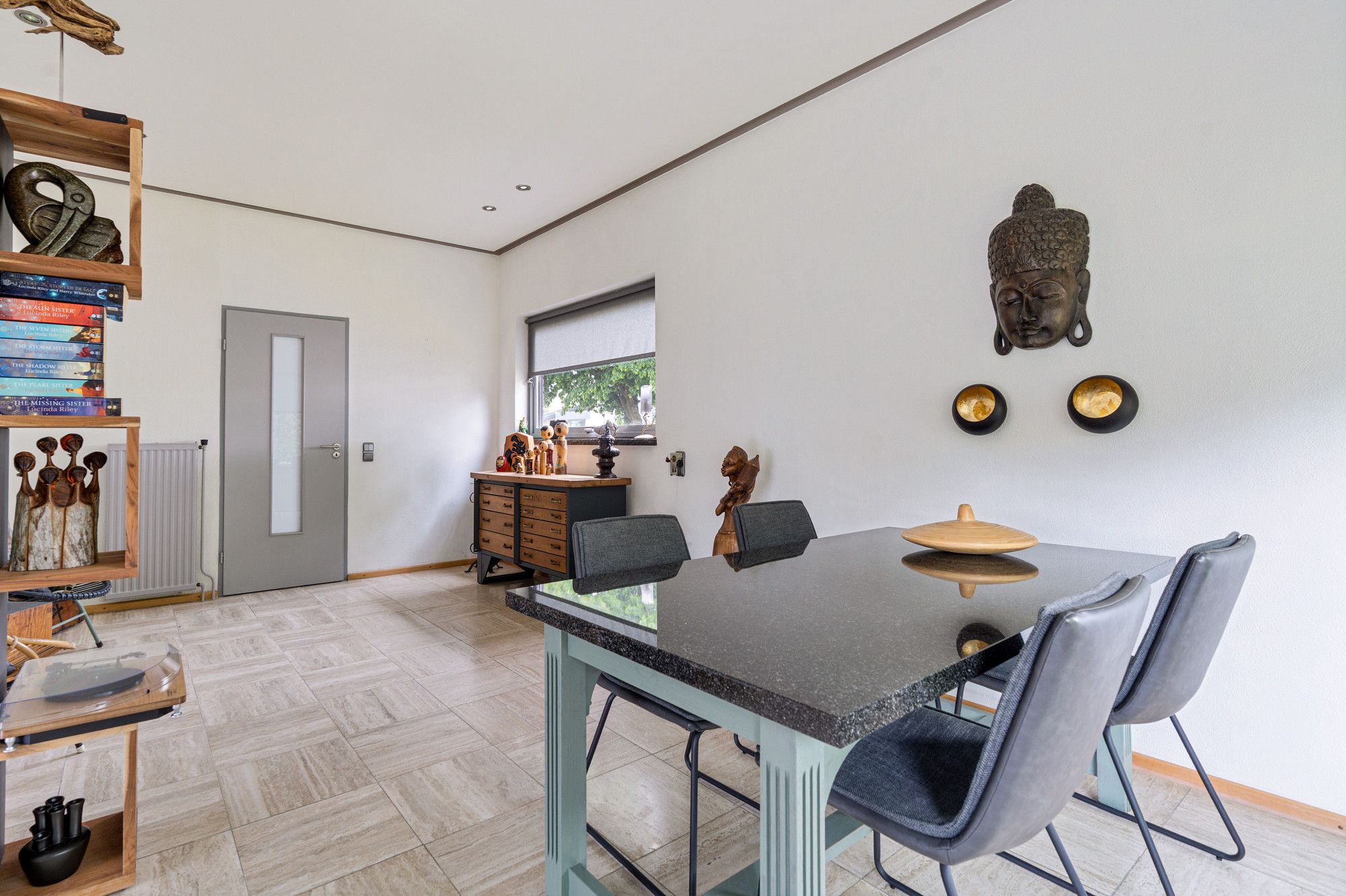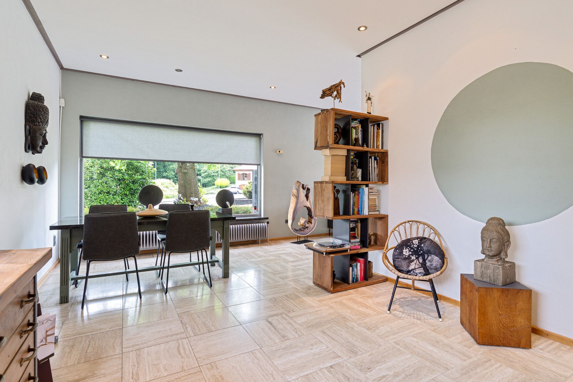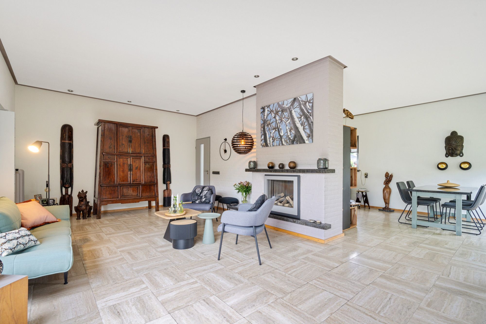 De woonkamer is speels ingedeeld in een gezellige U-vorm met een betegelde vloer en sfeervolle spotverlichting. In het zitgedeelte zorgt de open haard voor een warme ambiance. Vanuit de woonkamer is er een directe doorgang naar de achtertuin via een tuindeur – ideaal voor wie binnen en buiten graag met elkaar verbindt.