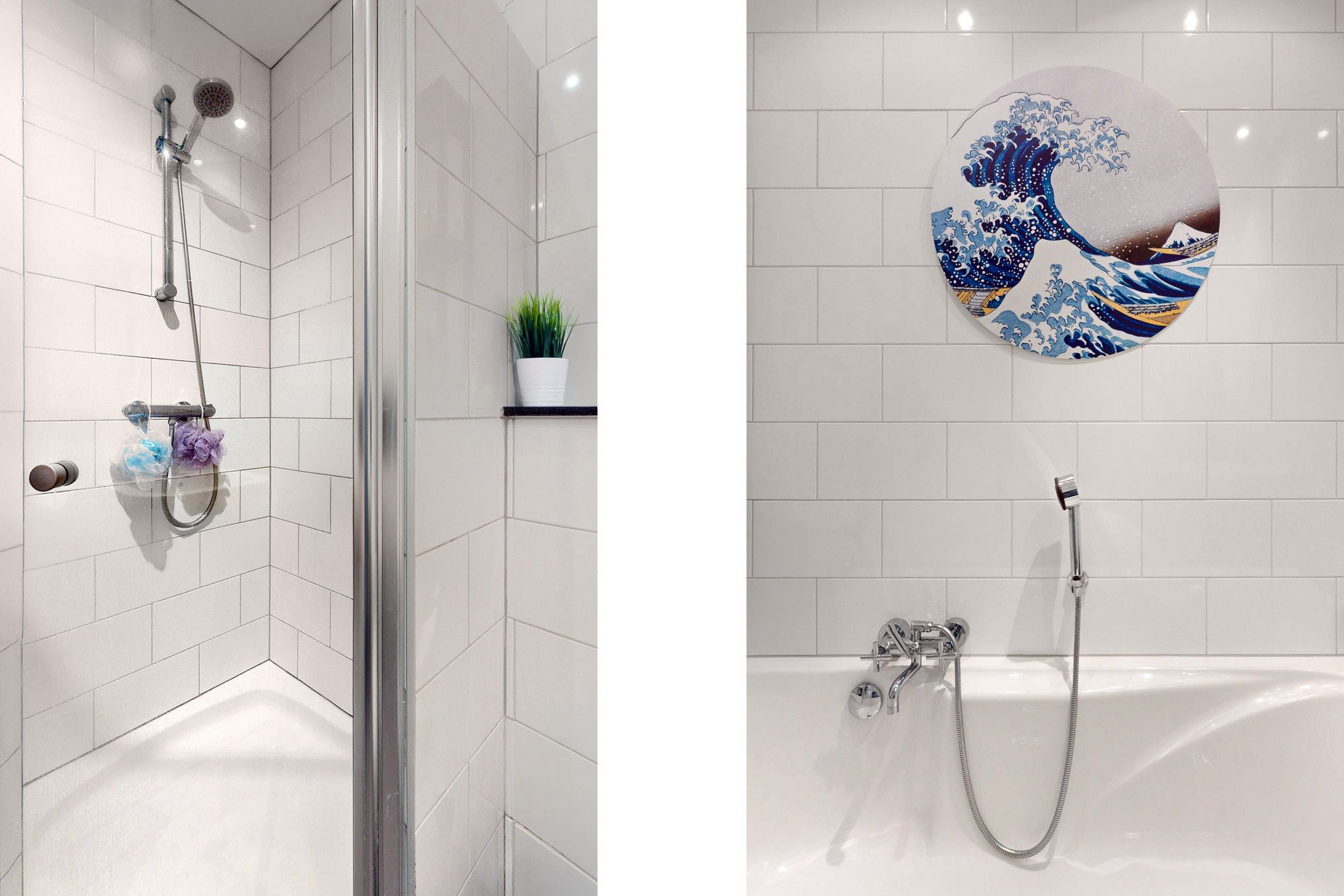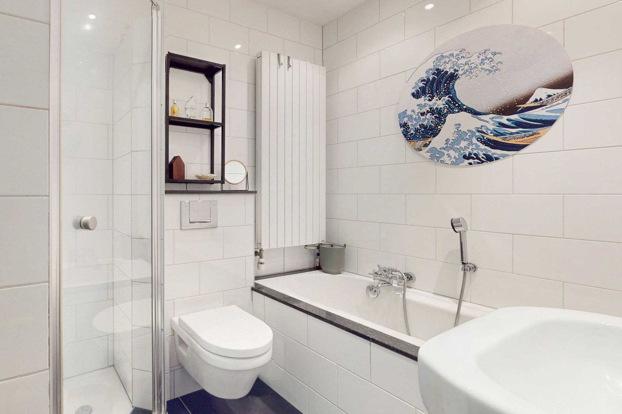 Via een klein tussenportaal bereik je de badkamer, de keuken en de trap naar boven. De badkamer is voorzien van een ligbad met doucheaansluiting, aparte douche, tweede toilet en wastafel.