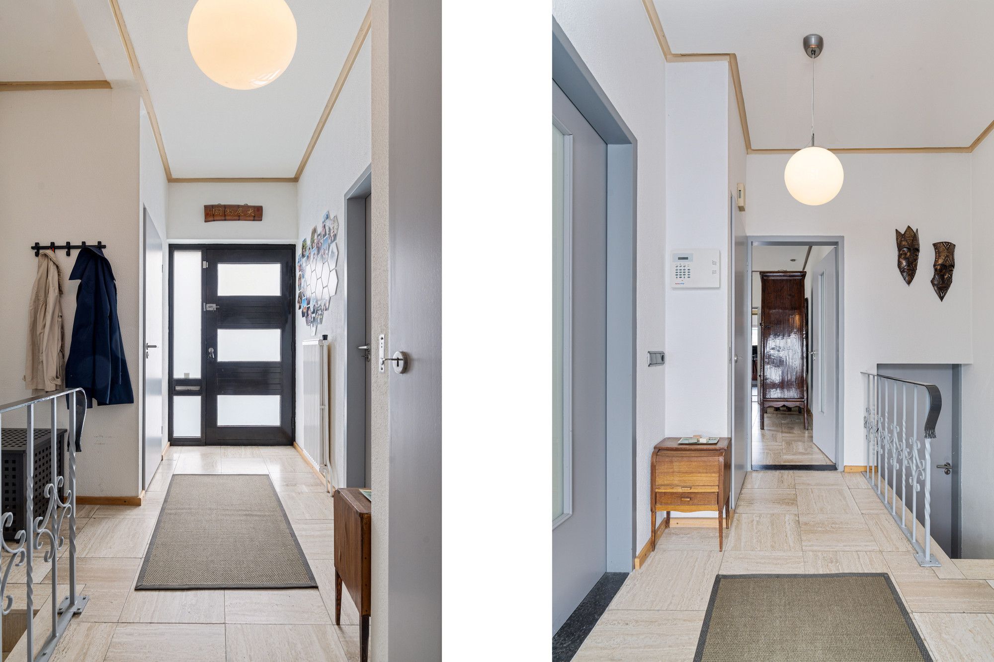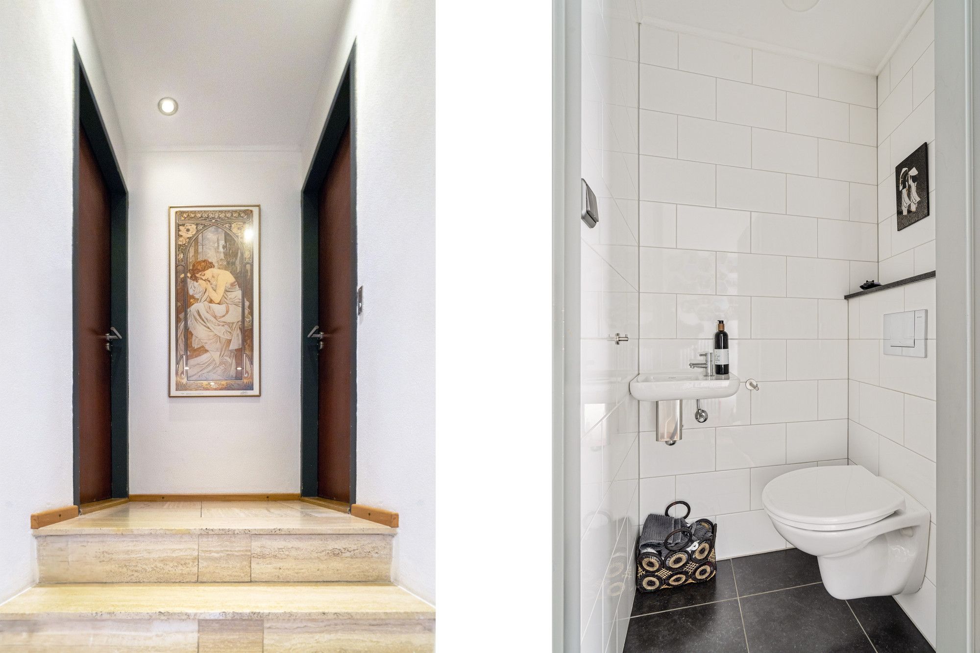 Via een trappetje aan de voorzijde bereik je de overdekte entree van de woning. In de hal tref je rechts het betegelde toilet met wastafeltje, ernaast een garderobenis met kapstok. Aan de linkerzijde bevinden zich de meterkast (vernieuwd begin 2025) en het alarmkastje. Vanuit de hal heb je toegang tot alle belangrijke leefruimtes.