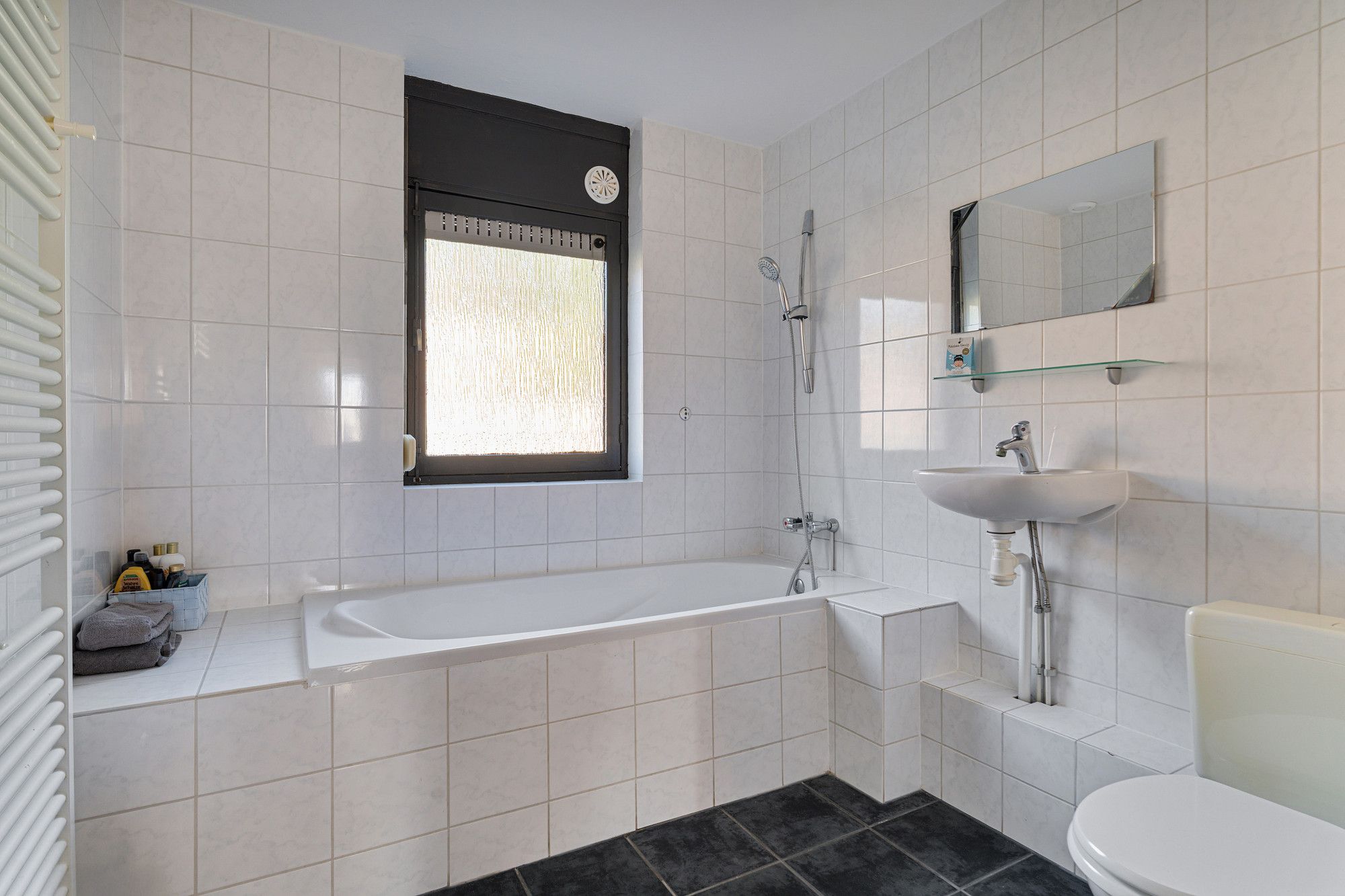De badkamer is volledig betegeld en beschikt over een ligbad met douche, tweede toilet, wastafel met kraan en een handdoekradiator.