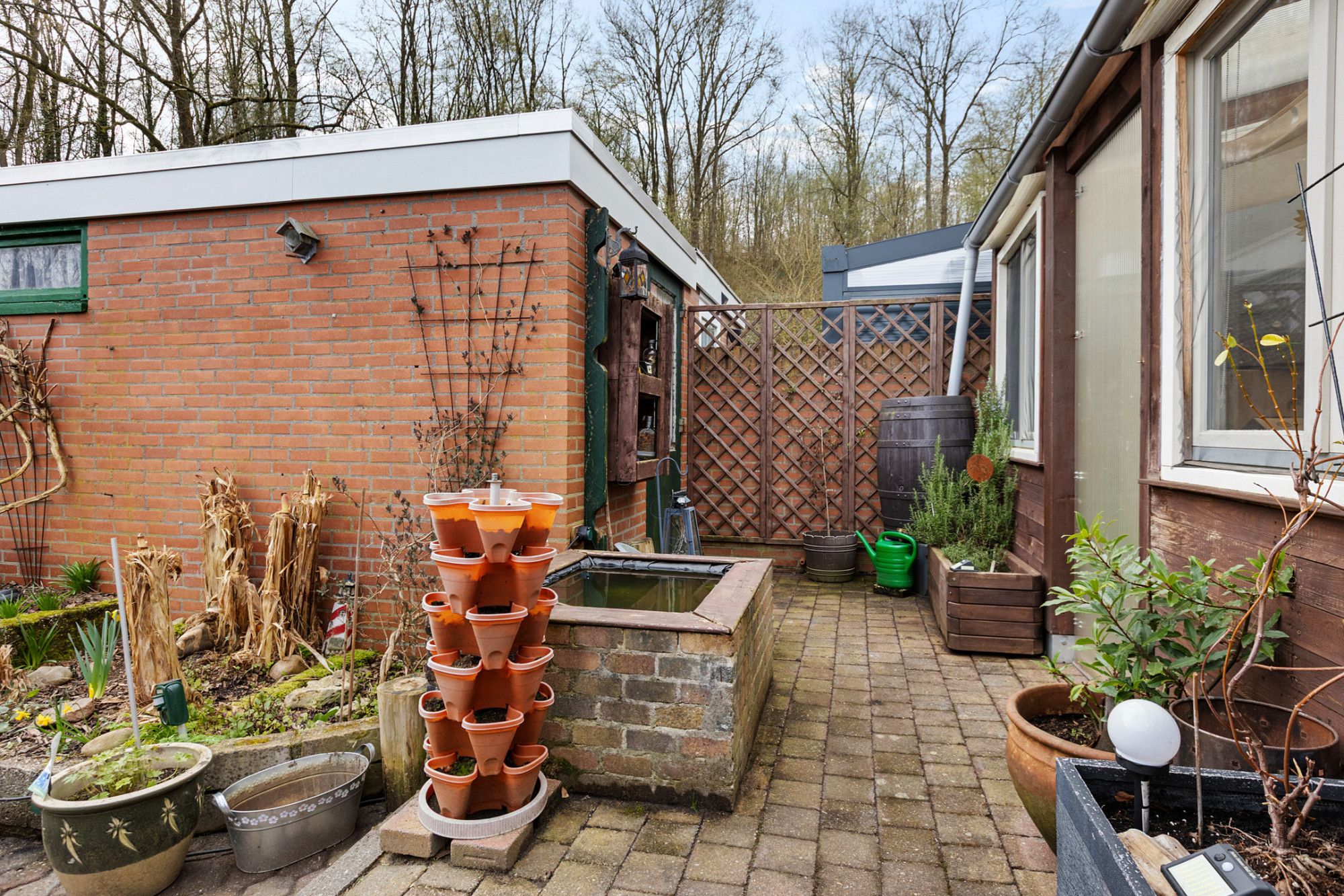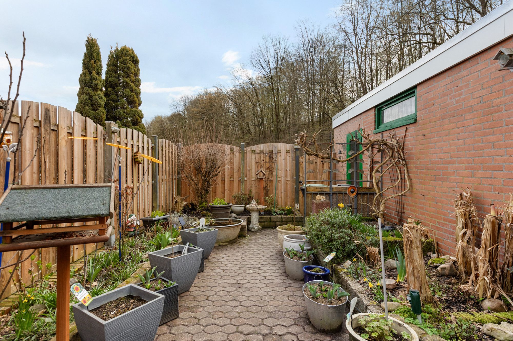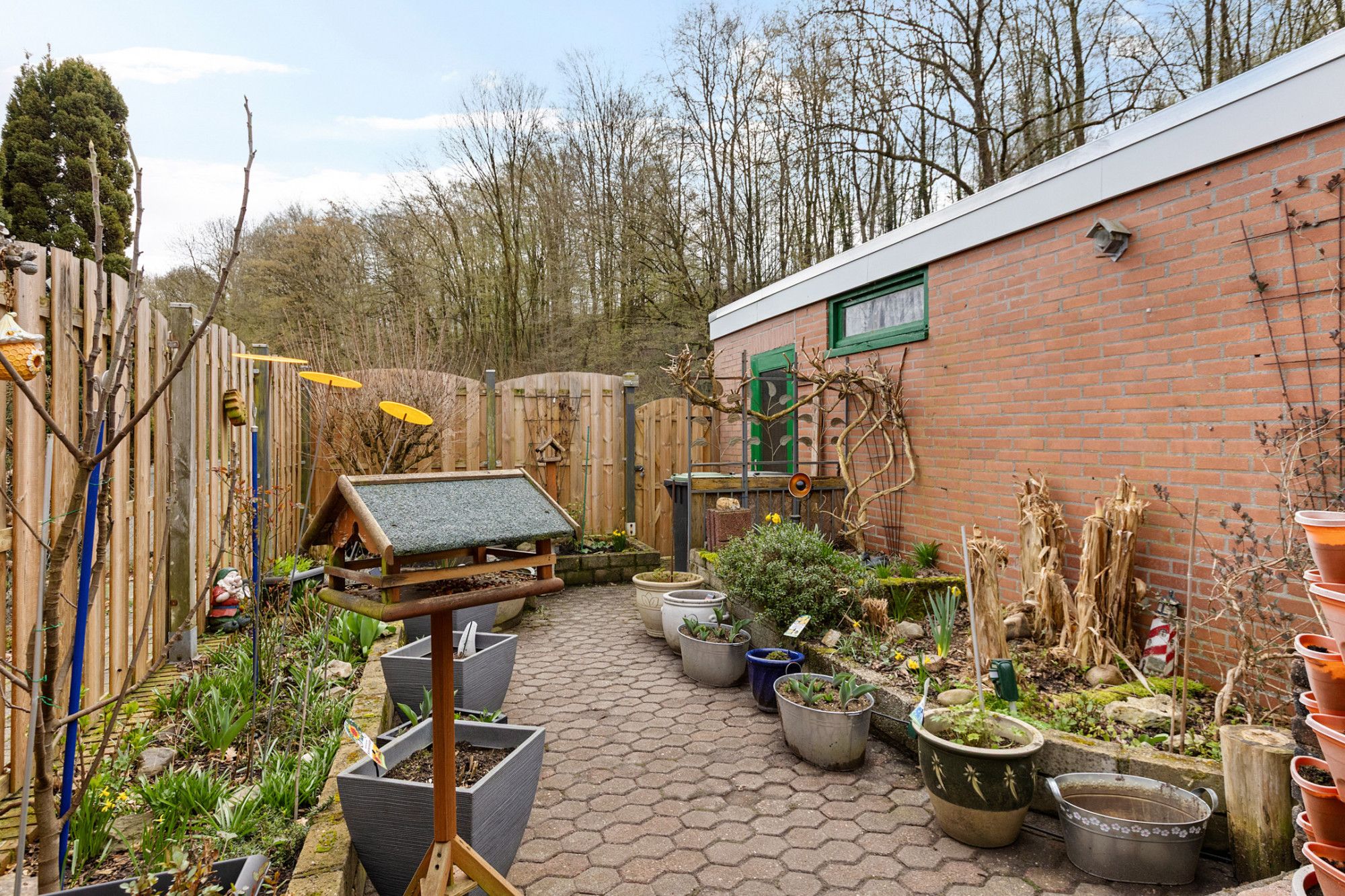De tuin is onderhoudsvriendelijk aangelegd met sierbestrating en beschikt over een achterom. Door de ligging aan de rand van een groenzone met bosachtige omgeving is er sprake van een rustige en vrije ligging aan de achterzijde.
