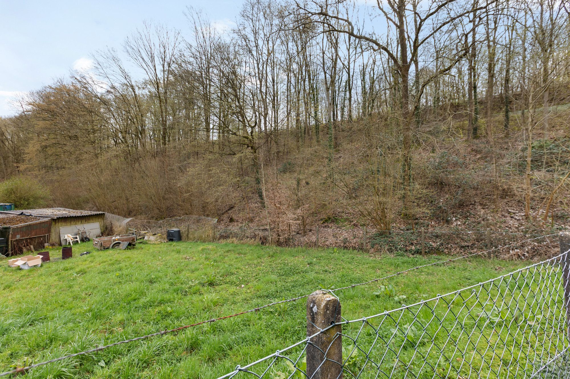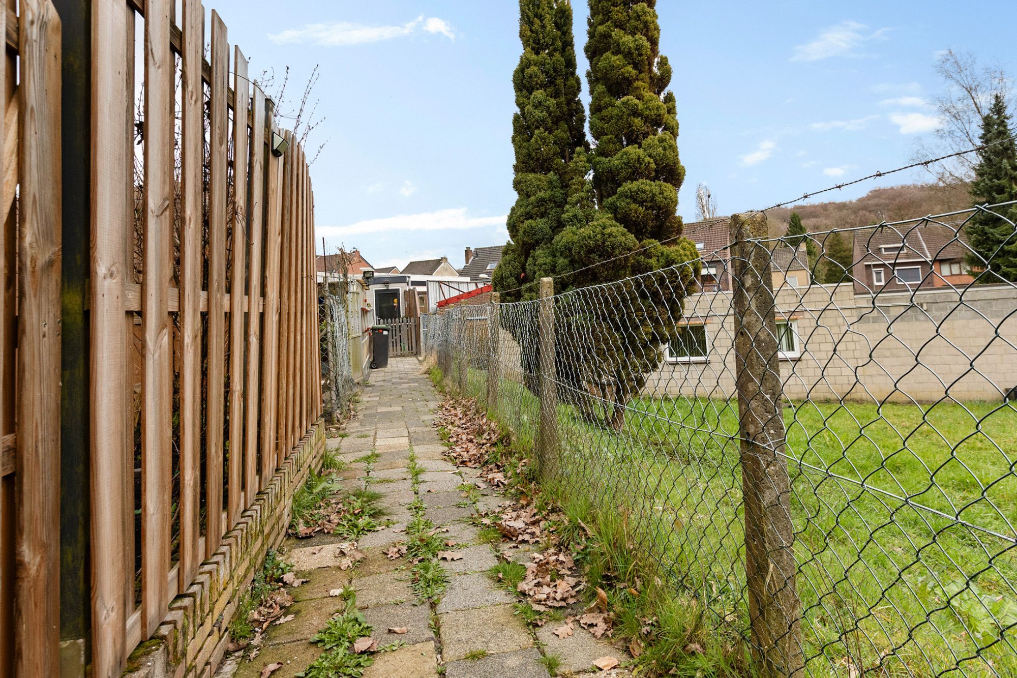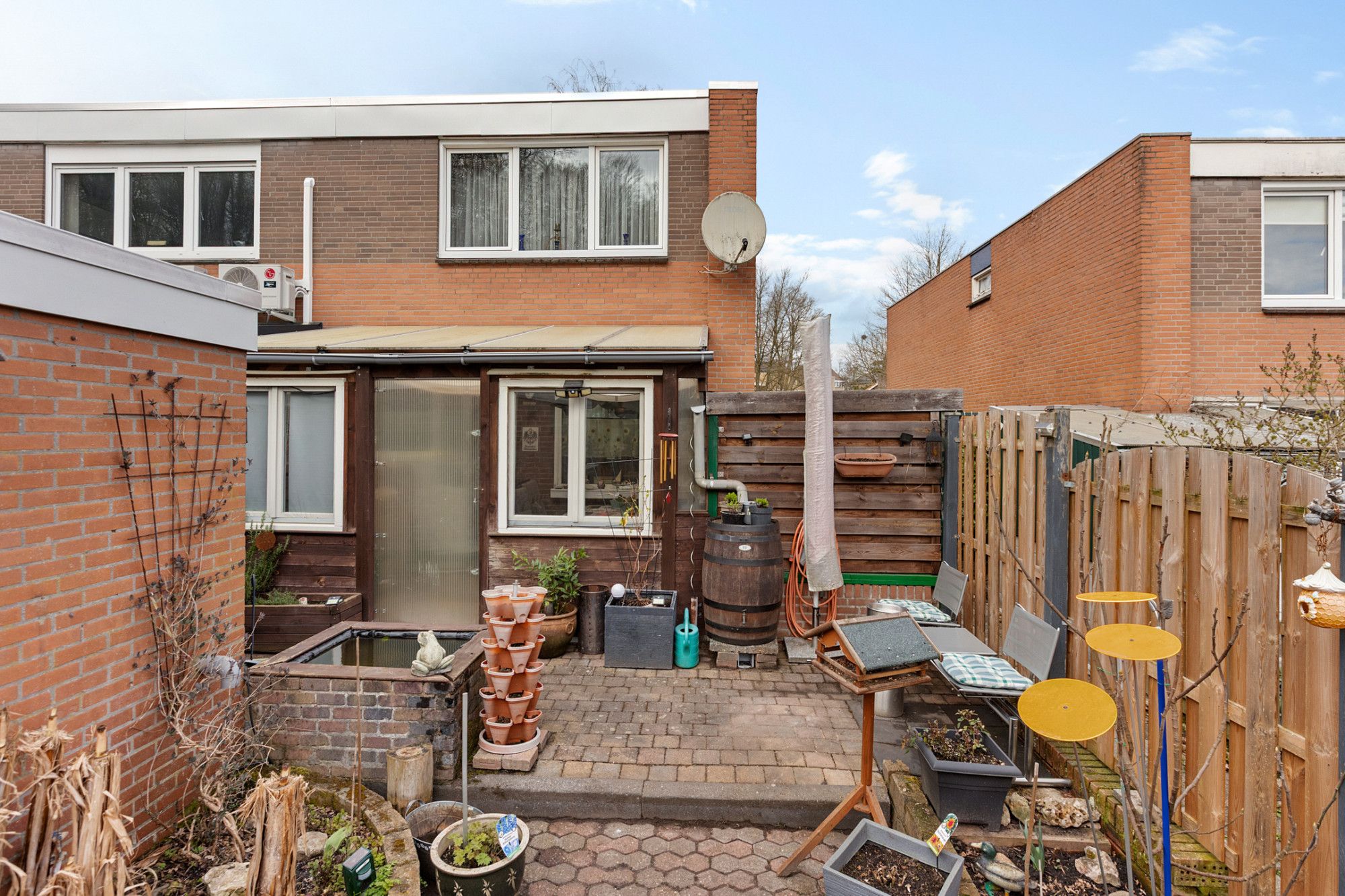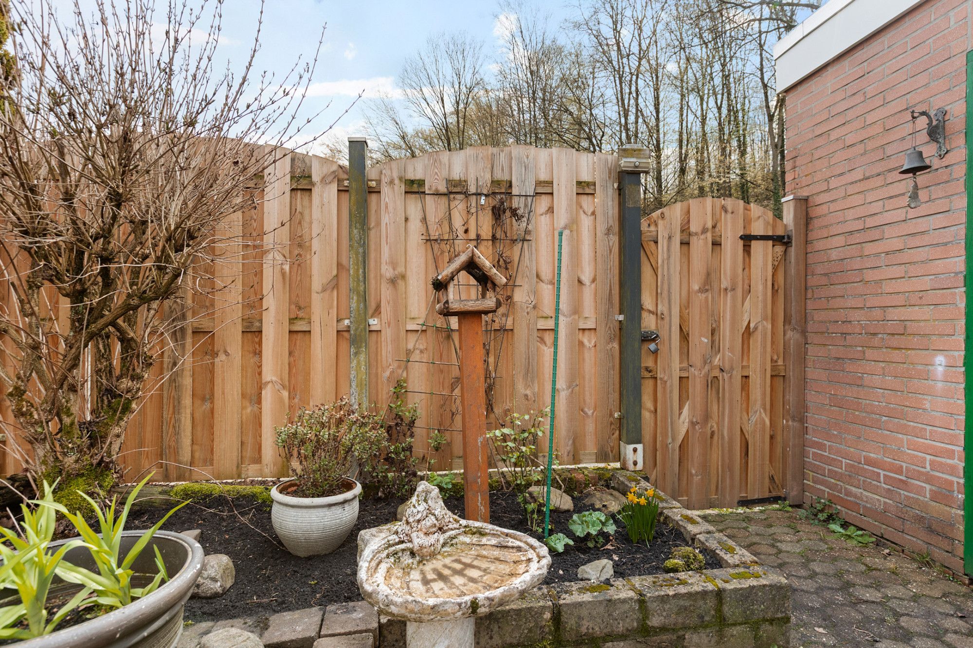 De tuin is onderhoudsvriendelijk aangelegd met sierbestrating en beschikt over een achterom. Door de ligging aan de rand van een groenzone met bosachtige omgeving is er sprake van een rustige en vrije ligging aan de achterzijde.