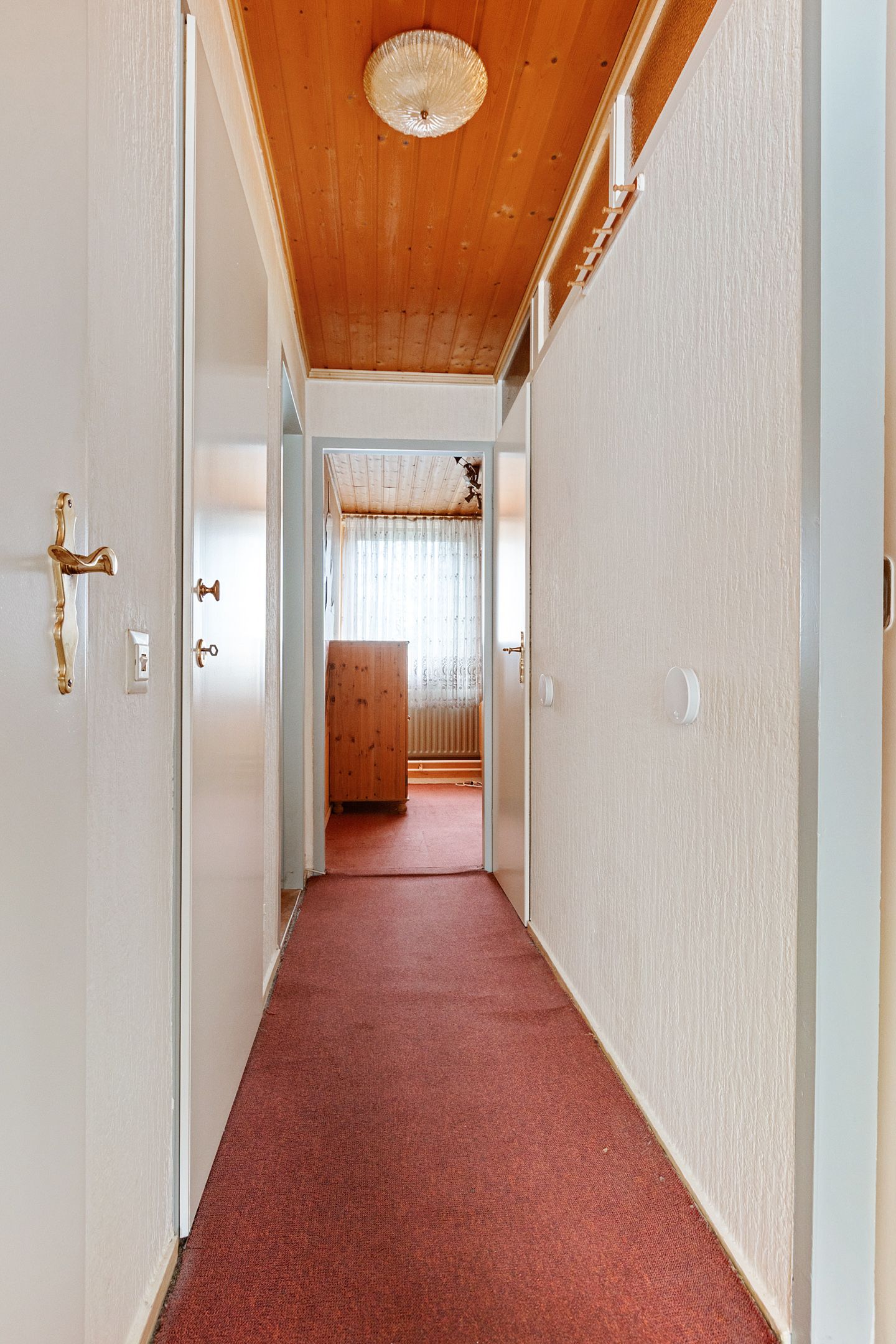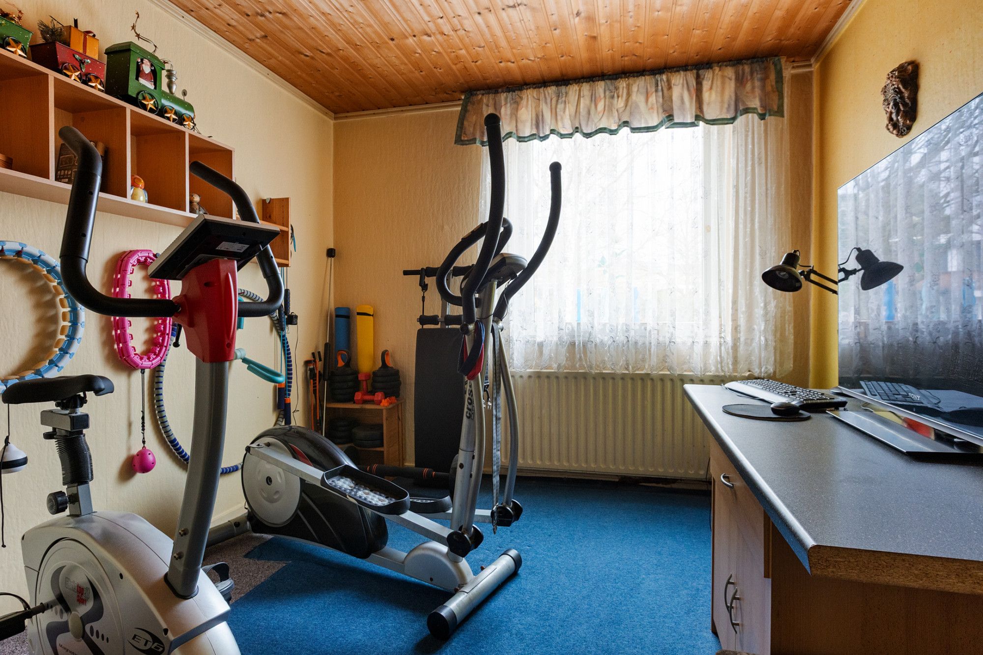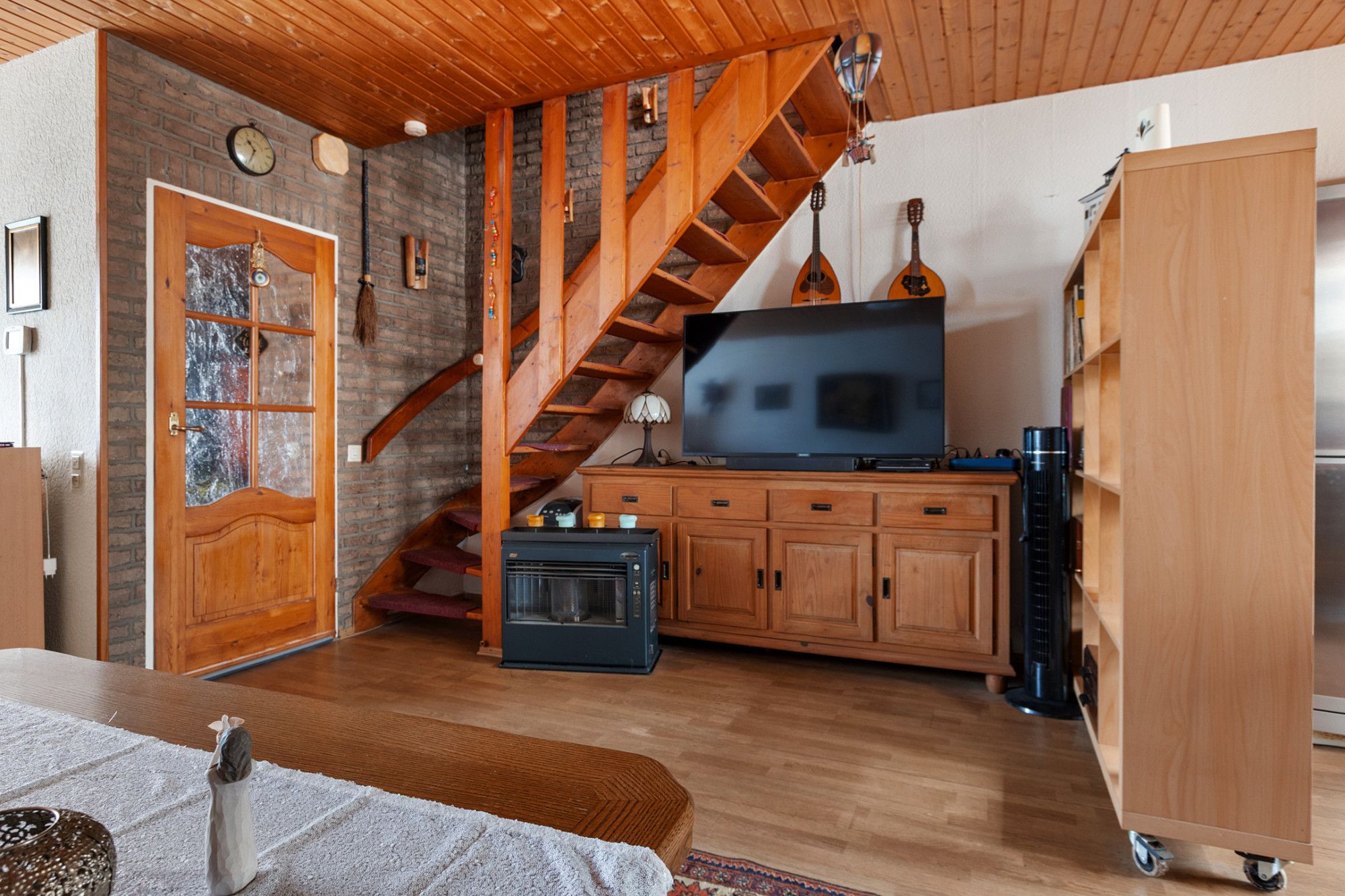 De begane grond beschikt over een L-vormige woonkamer met voldoende lichtinval en een functionele indeling. De afwerking is gedateerd, maar de ruimte biedt diverse mogelijkheden voor aanpassing naar hedendaags wooncomfort.