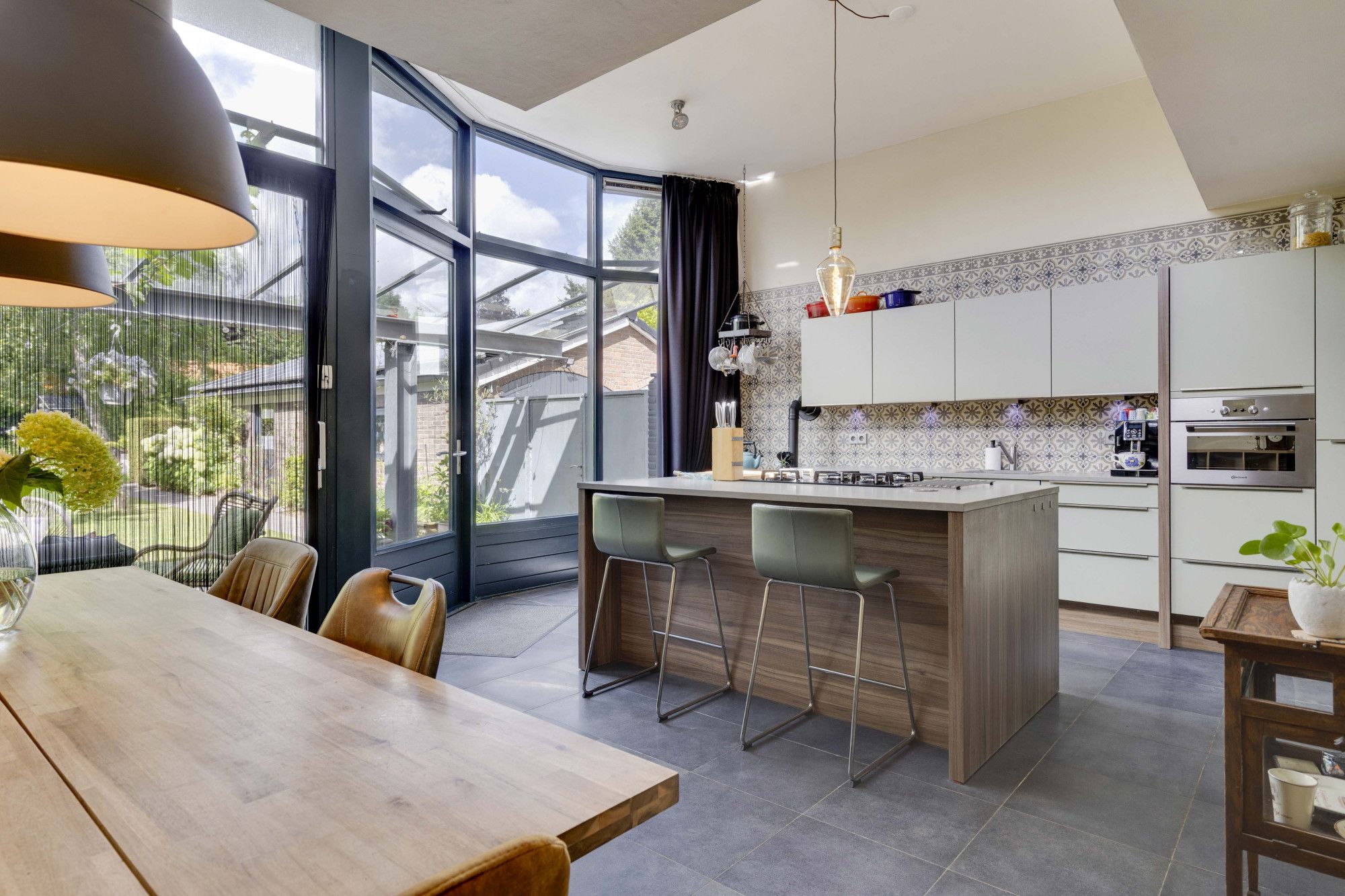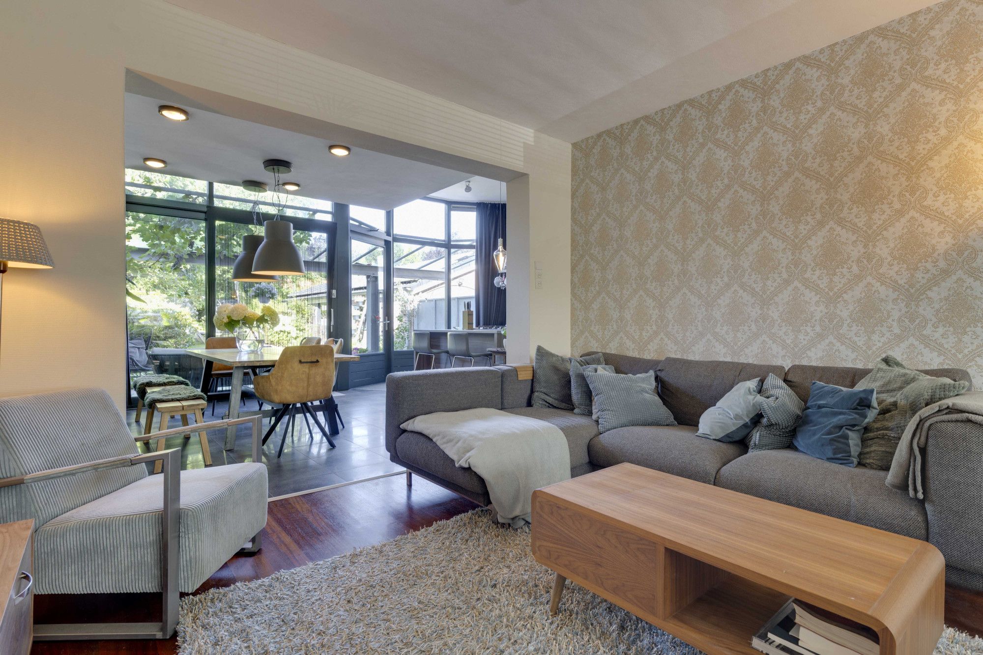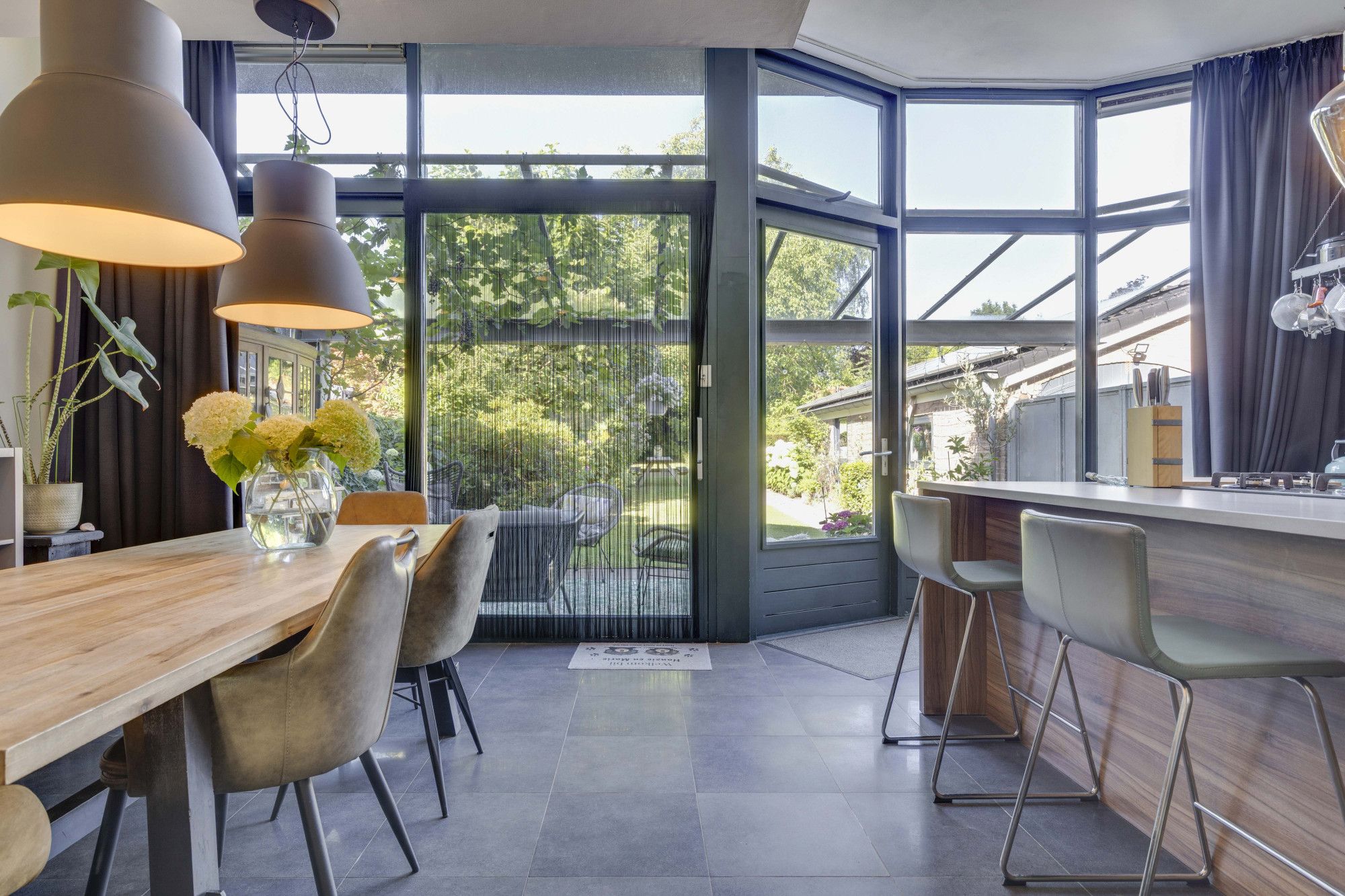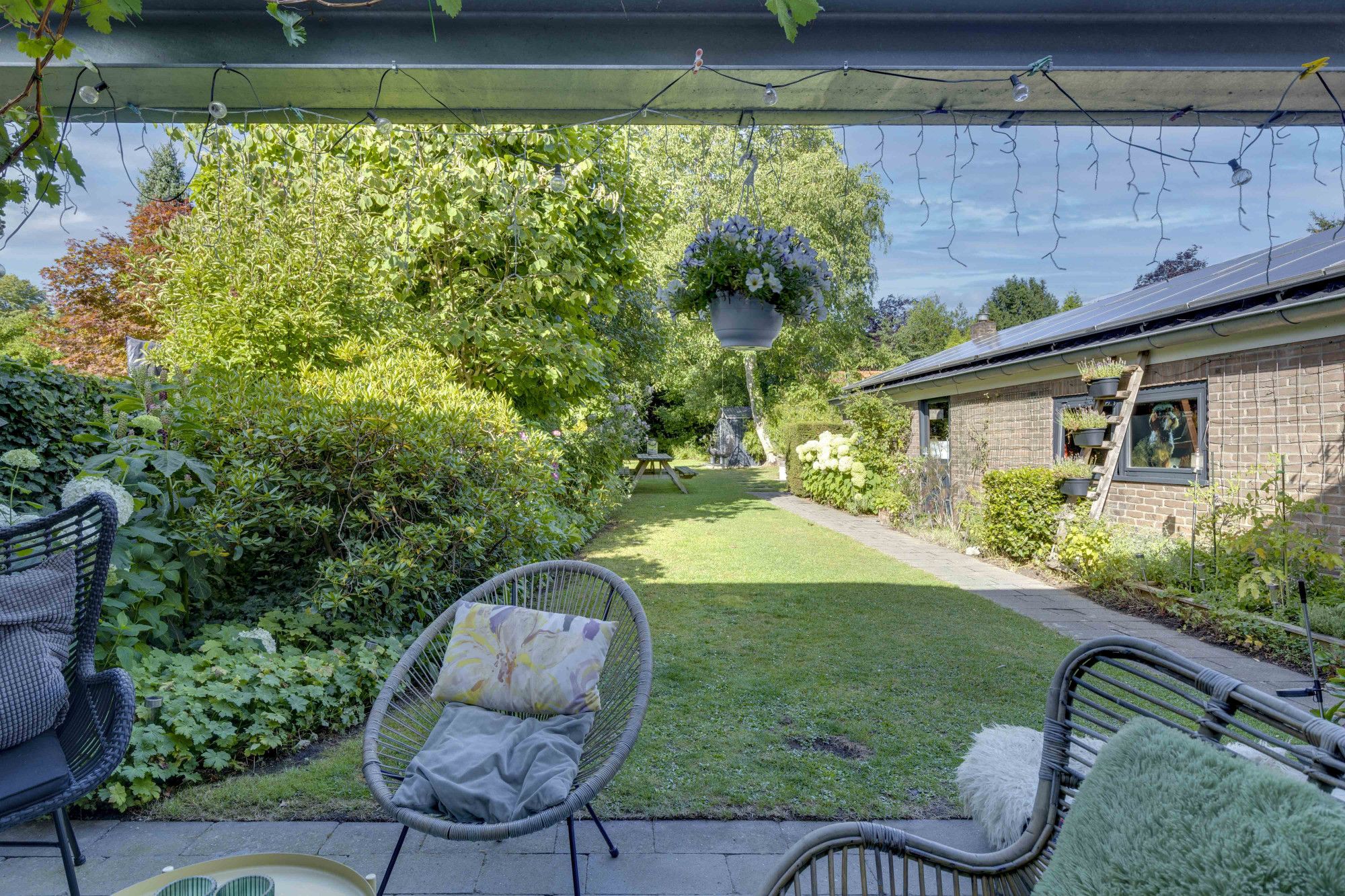 Entree via de hal met moderne toiletruimte (zwevend closet en fonteintje) en meterkast. De sfeervolle woonkamer is afgewerkt met een parketvloer en staat in open verbinding met een royale aanbouw voorzien van tegelvloer, vloerverwarming en veel lichtinval. Via de schuifpui is er directe toegang tot de diepe, fraai aangelegde tuin met glazen terrasoverkapping en tuinhuis.