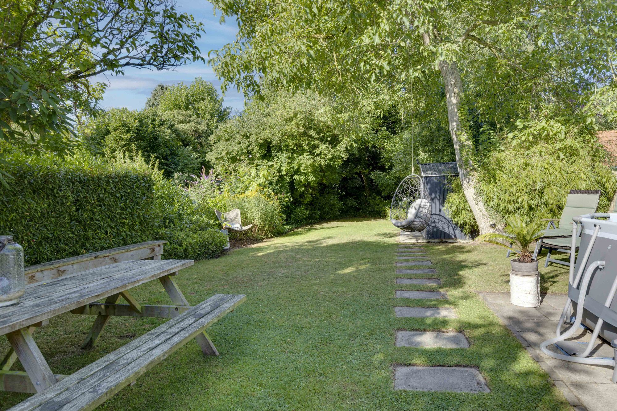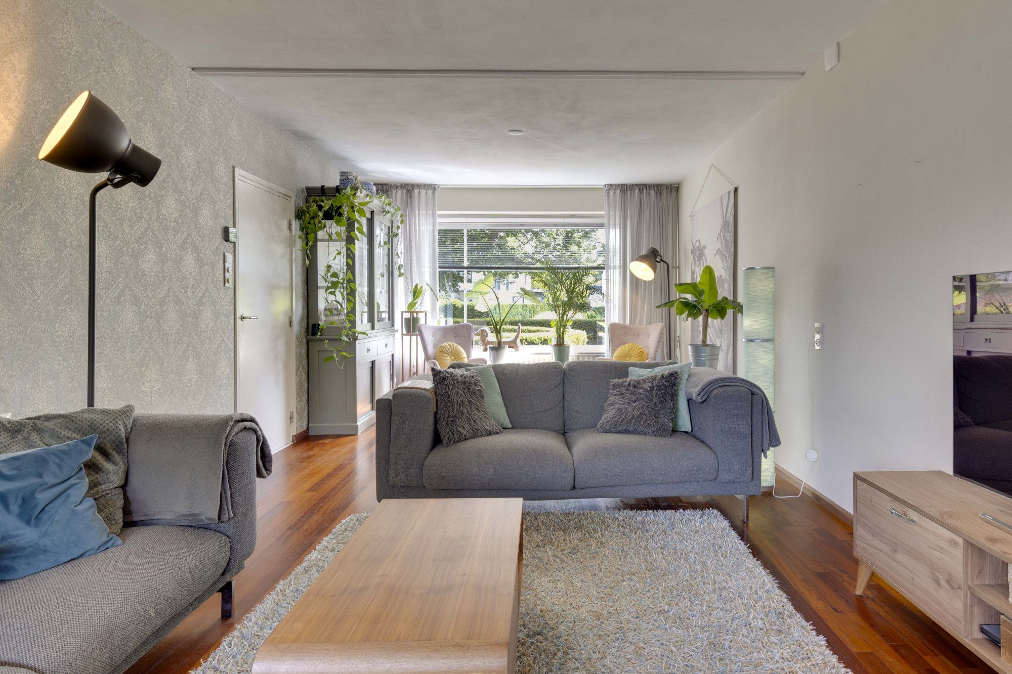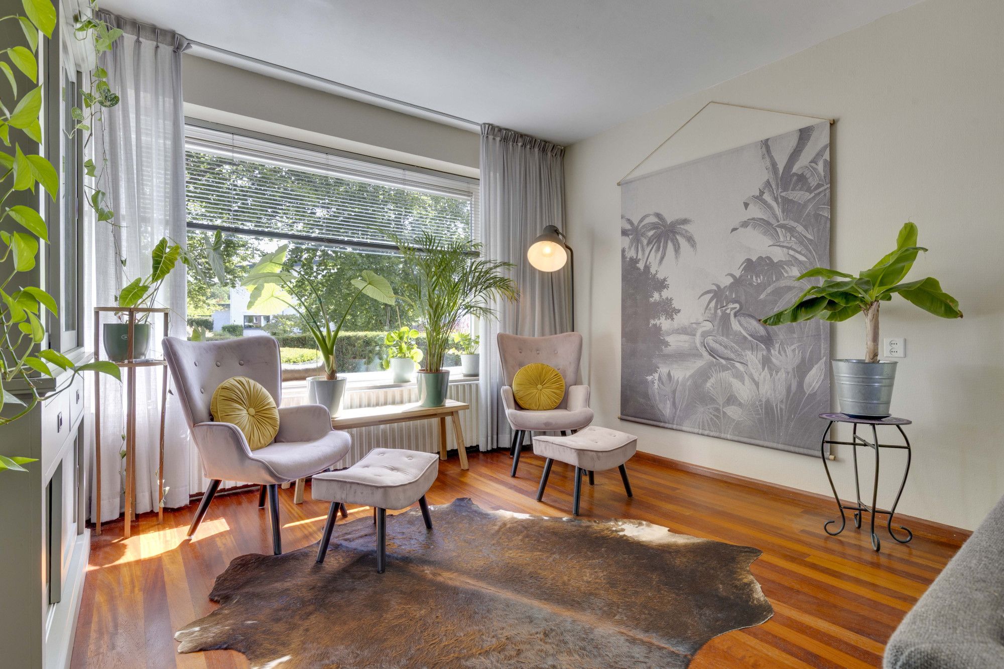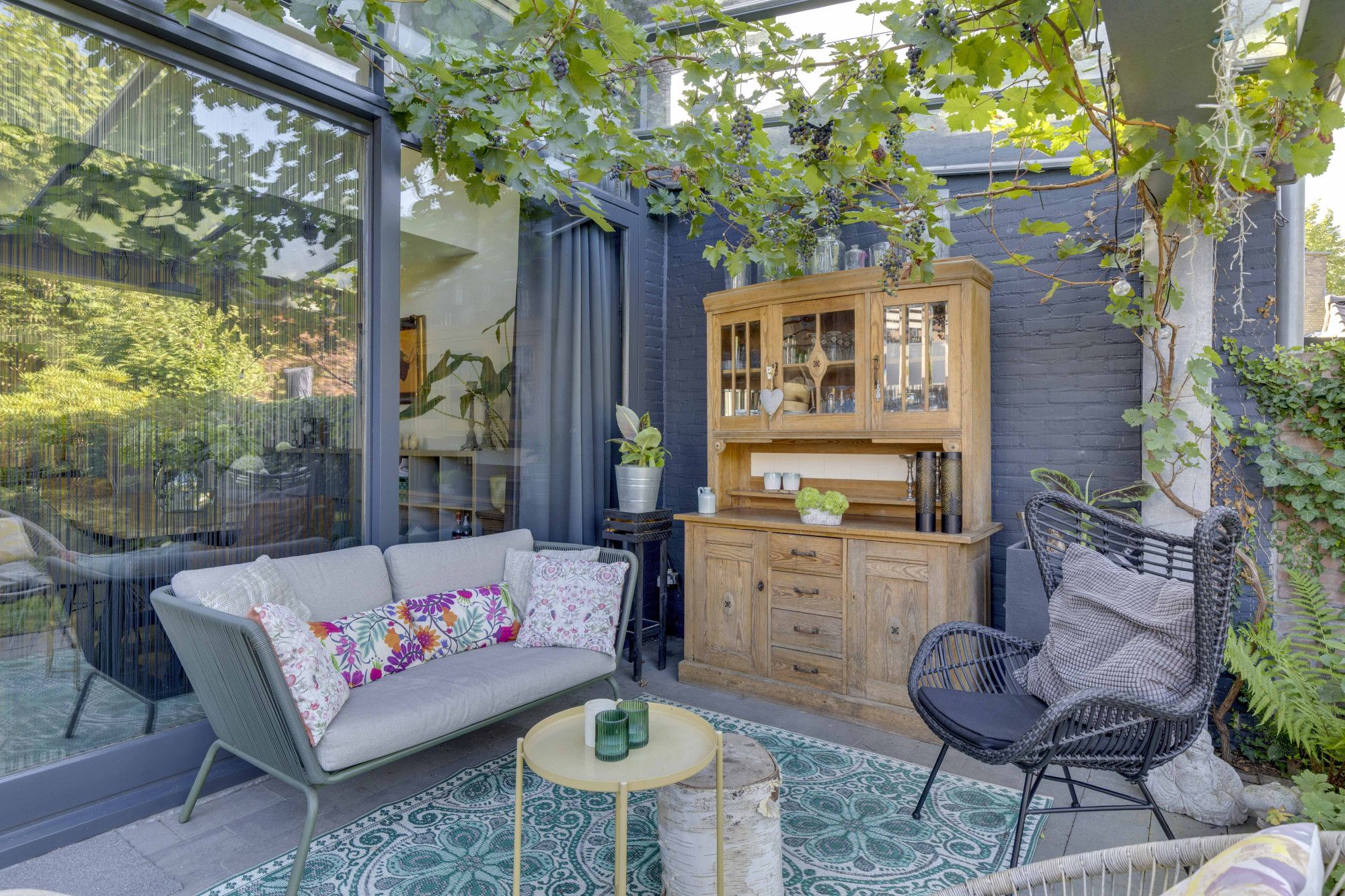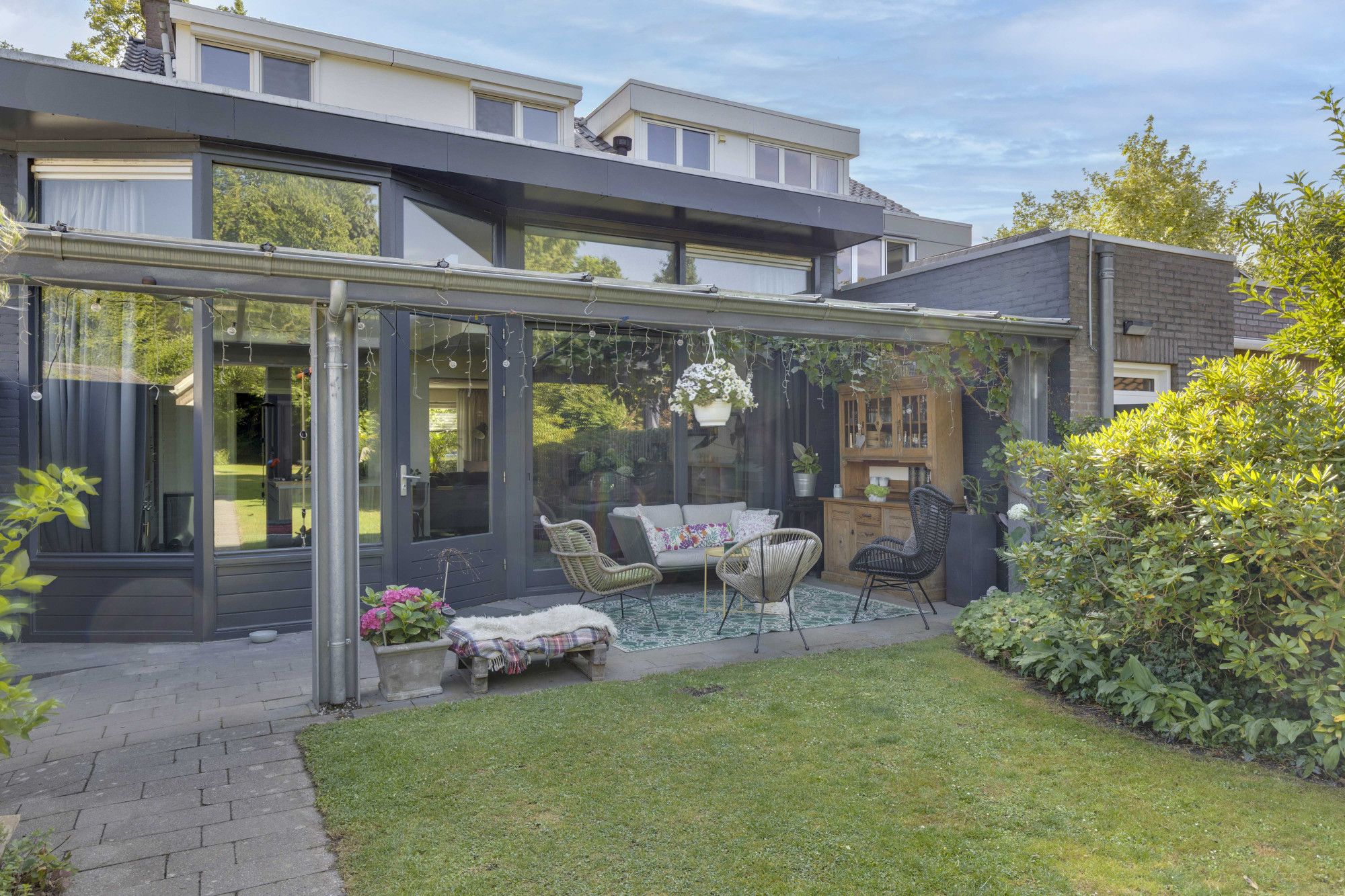 Entree via de hal met moderne toiletruimte (zwevend closet en fonteintje) en meterkast. De sfeervolle woonkamer is afgewerkt met een parketvloer en staat in open verbinding met een royale aanbouw voorzien van tegelvloer, vloerverwarming en veel lichtinval. Via de schuifpui is er directe toegang tot de diepe, fraai aangelegde tuin met glazen terrasoverkapping en tuinhuis.