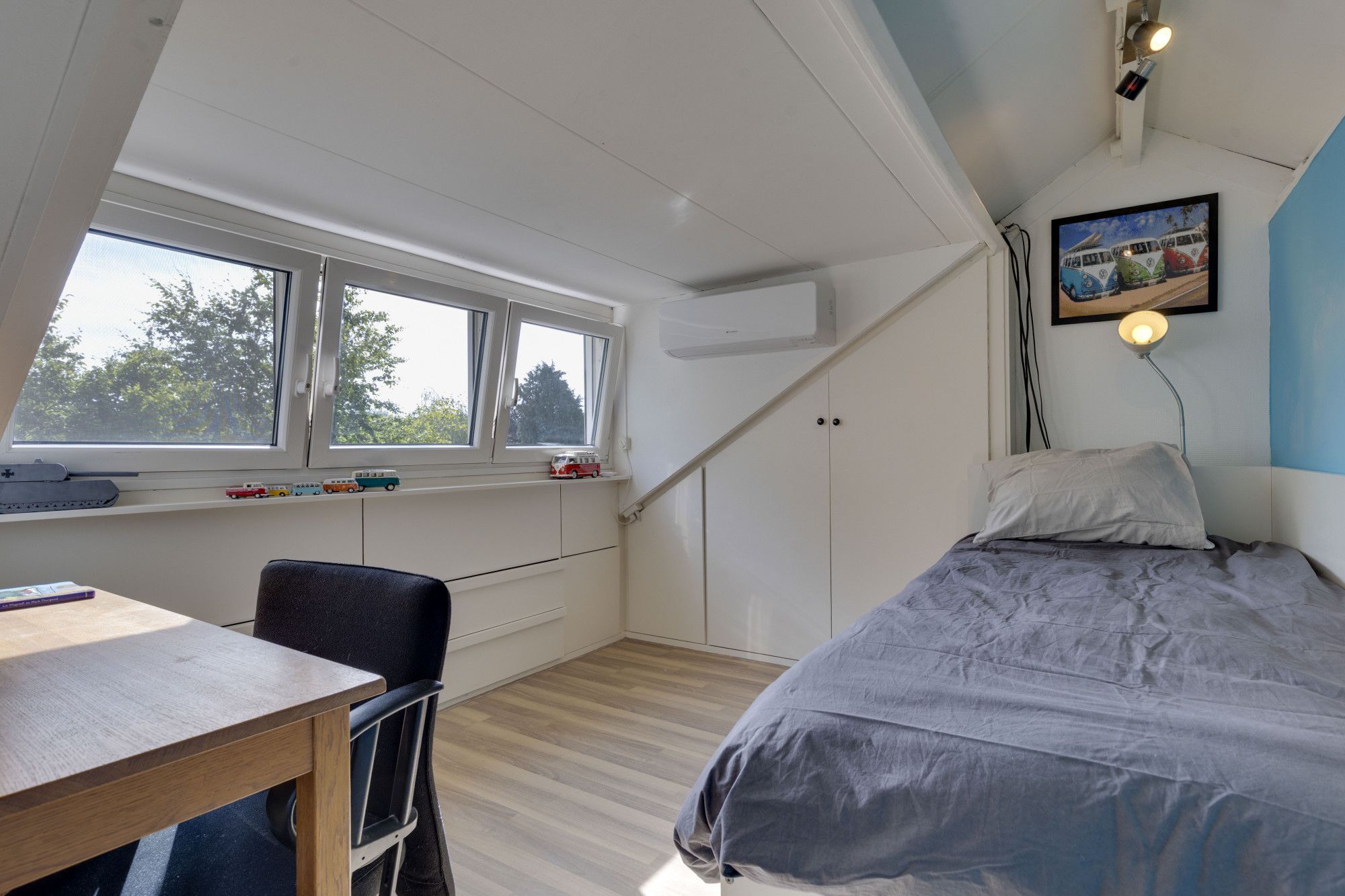 Overloop met bergruimte en toegang tot twee ruime slaapkamers, beide met dakkapel, laminaatvloer en airconditioning: