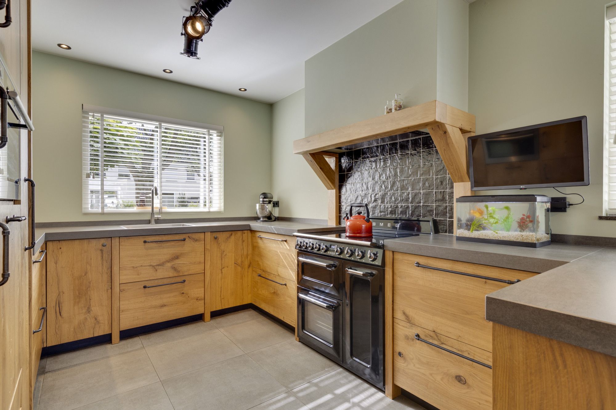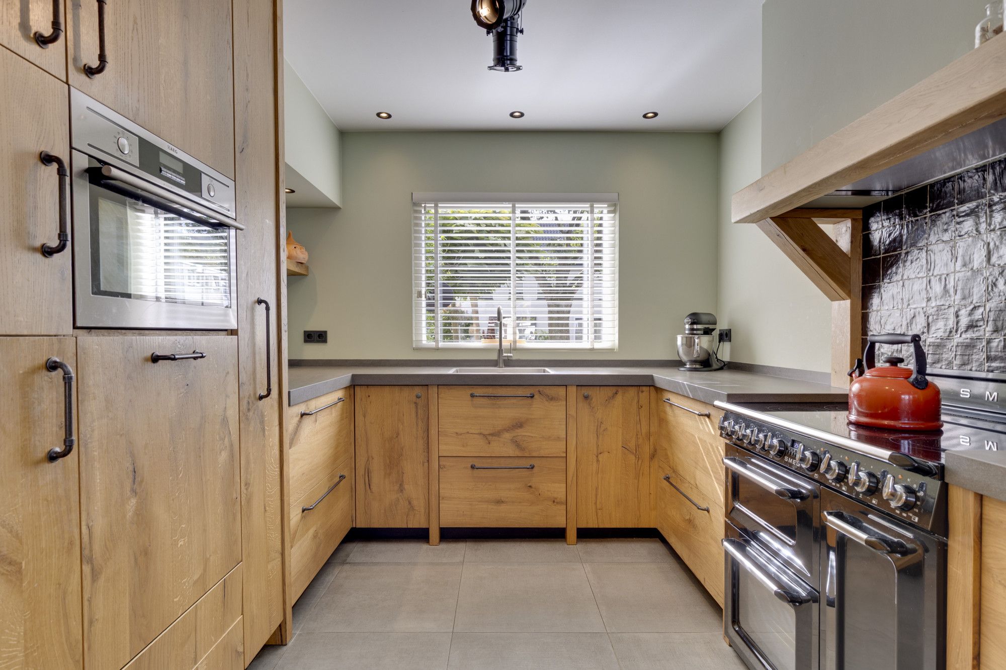 De luxe leefkeuken is een echte blikvanger, voorzien van een stijlvolle tegelvloer, Smeg fornuis met 5-pits inductiekookplaat, meerdere ovens, combi-magnetron, vaatwasser, koelkast en een eikenhouten schouw met geïntegreerde afzuigkap. Vanuit de keuken is er toegang tot de tuin en de praktische bijkeuken met gootsteen, aansluiting voor witgoed en de cv-installatie (Nefit HR, 2019, eigendom).