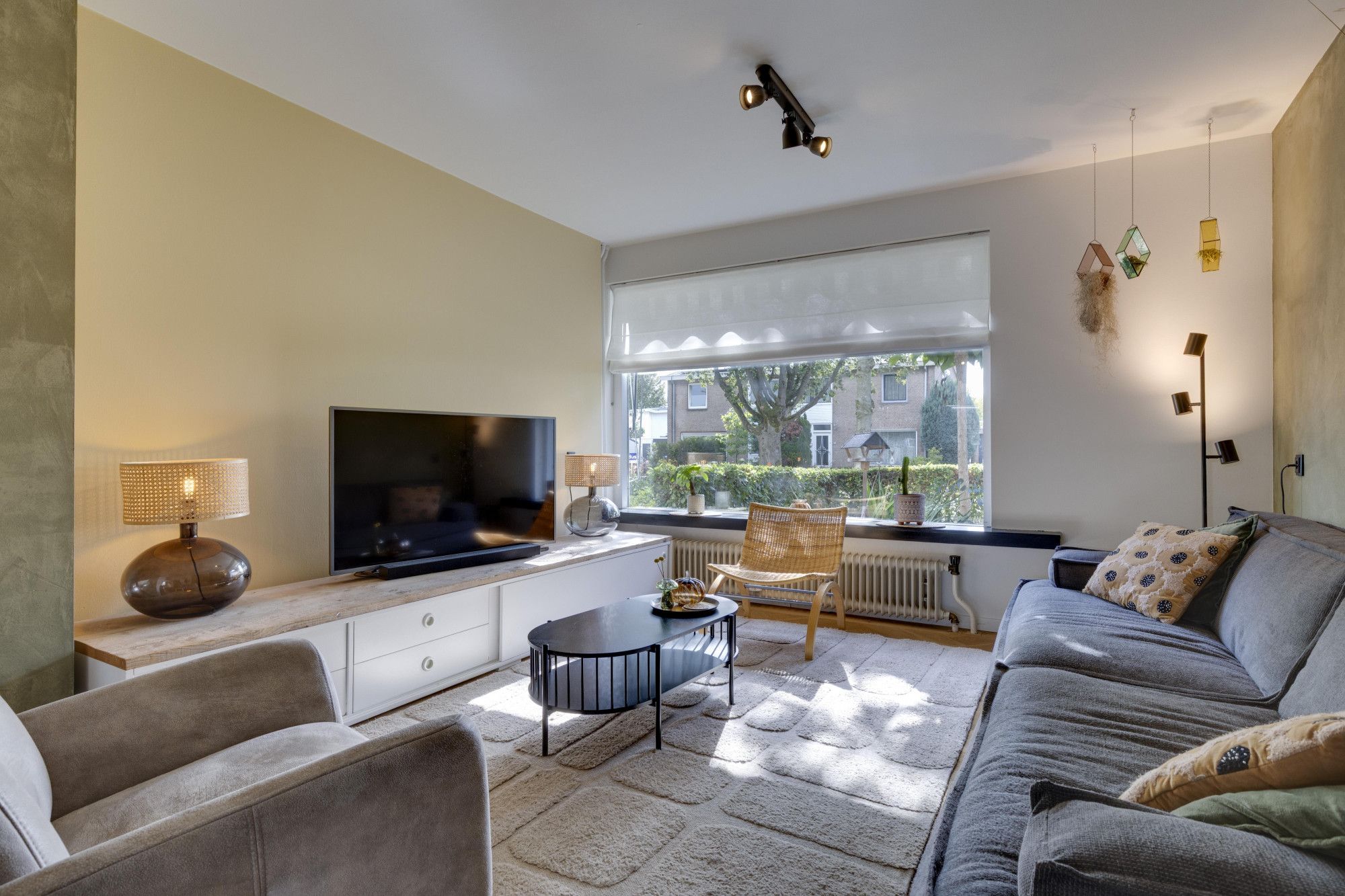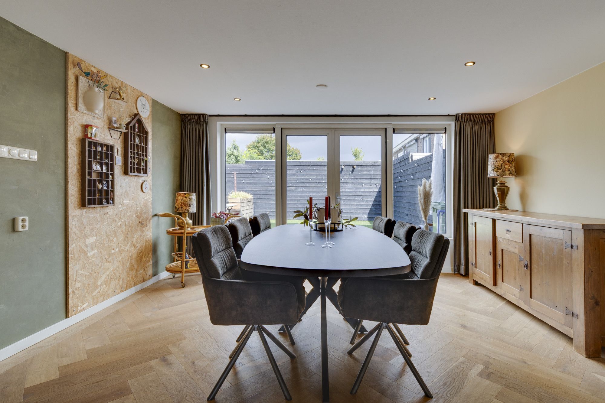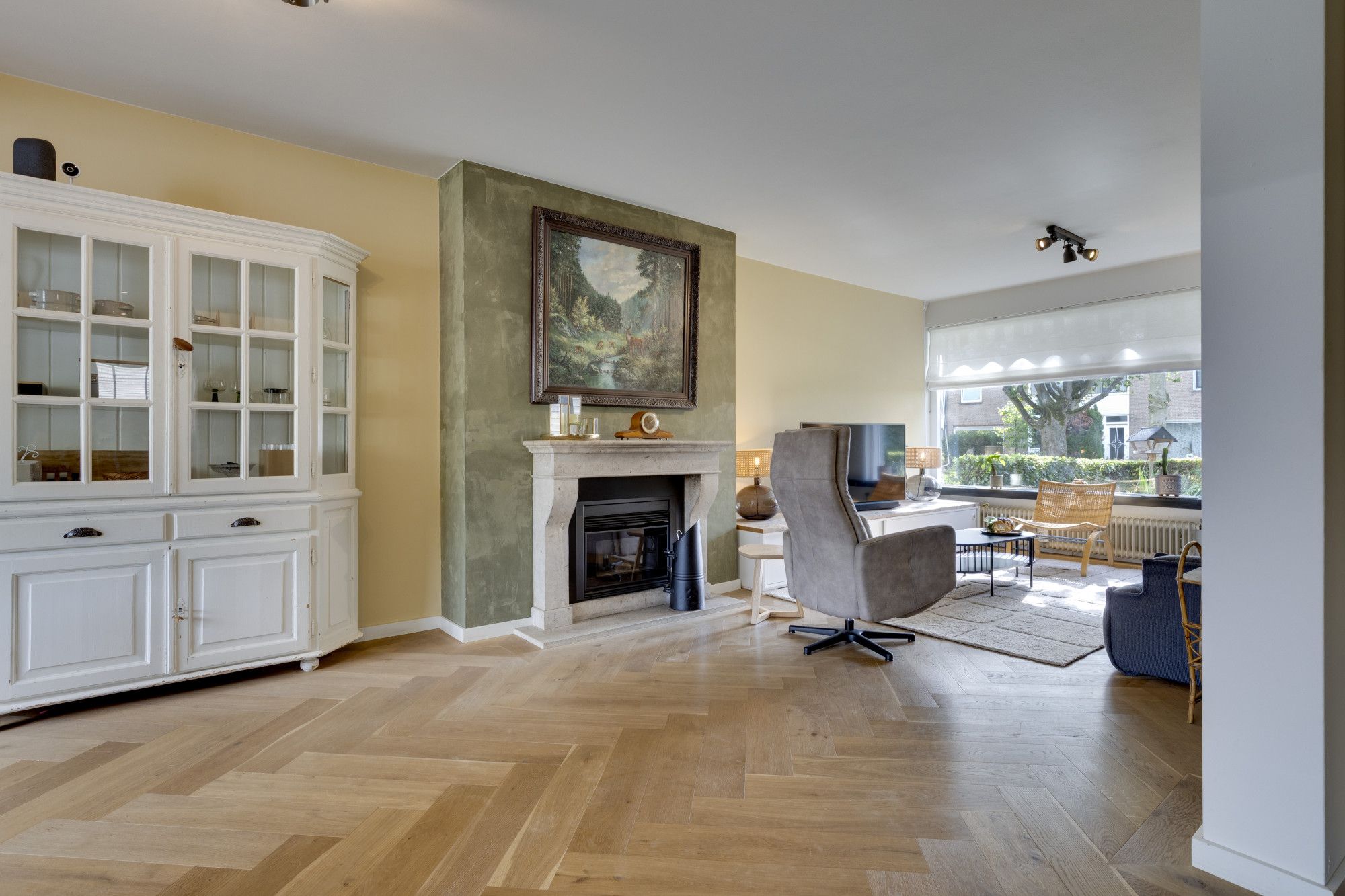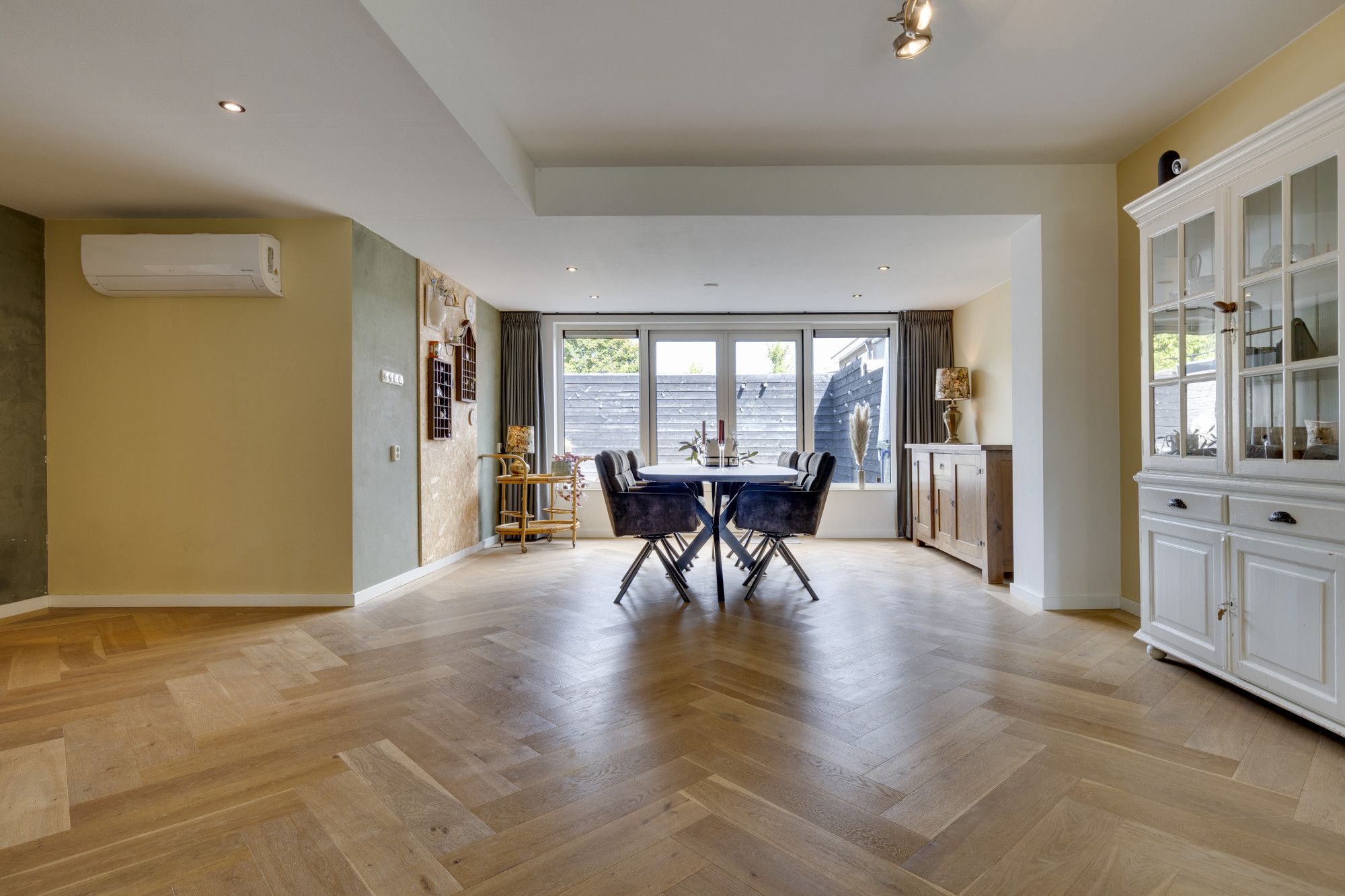 Een lichte en zeer royale woonkamer met visgraat parketvloer (2022), pelletkachel, airconditioning en dubbele openslaande tuindeuren.