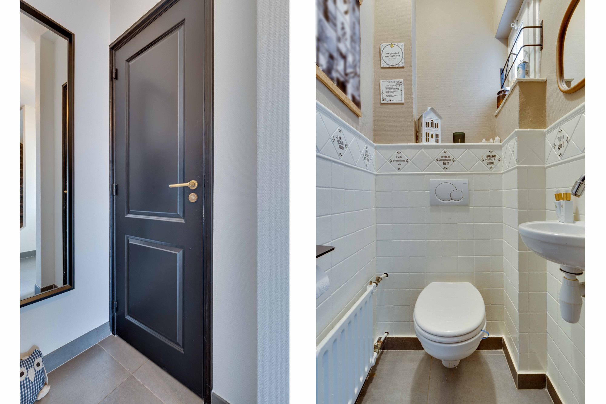 Ruime hal/entree met trapopgang en modern toilet met zwevend closet en fonteintje.