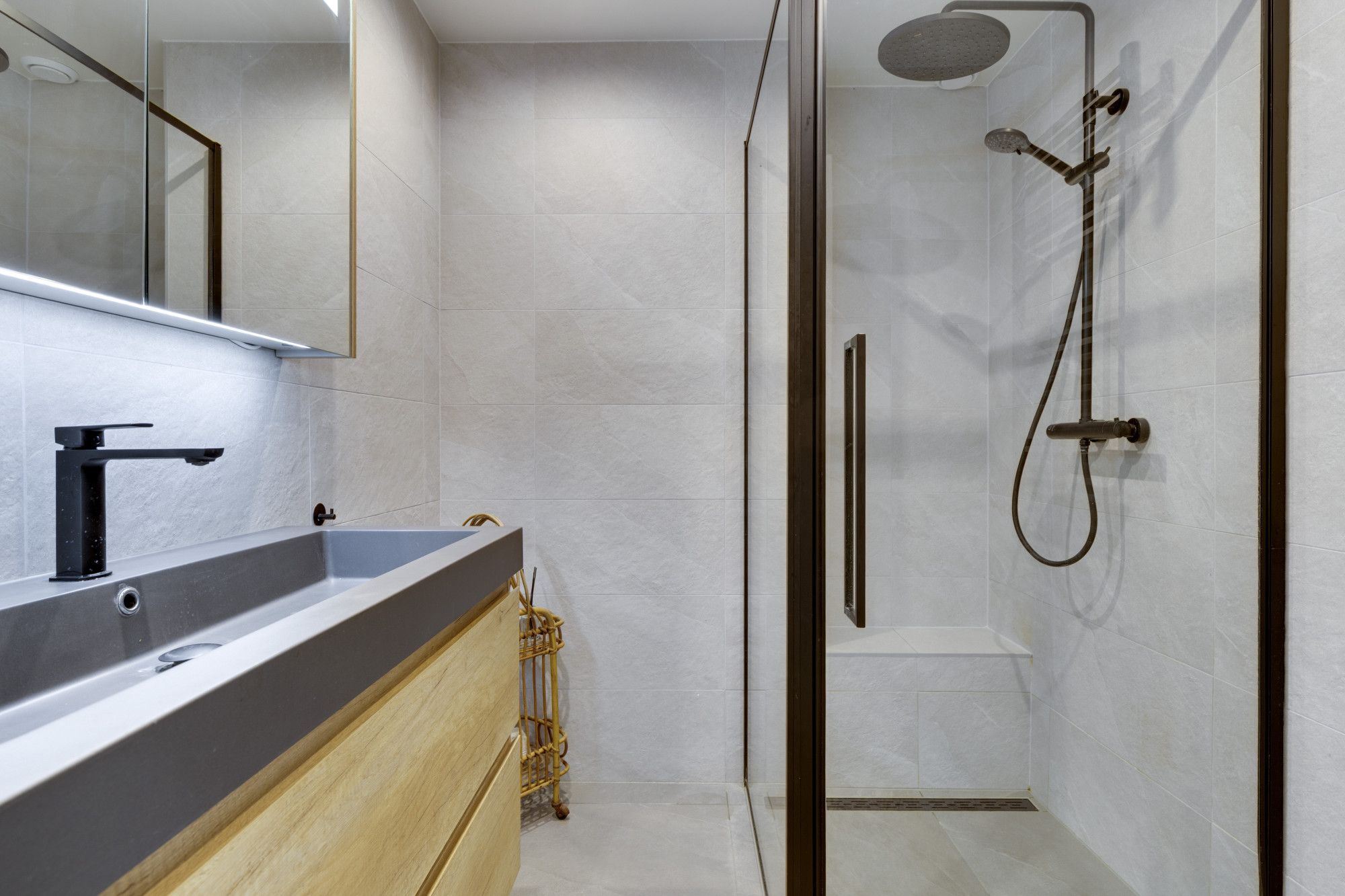 Badkamer 1: (2023): inloopdouche, dubbele wastafel en designradiator.