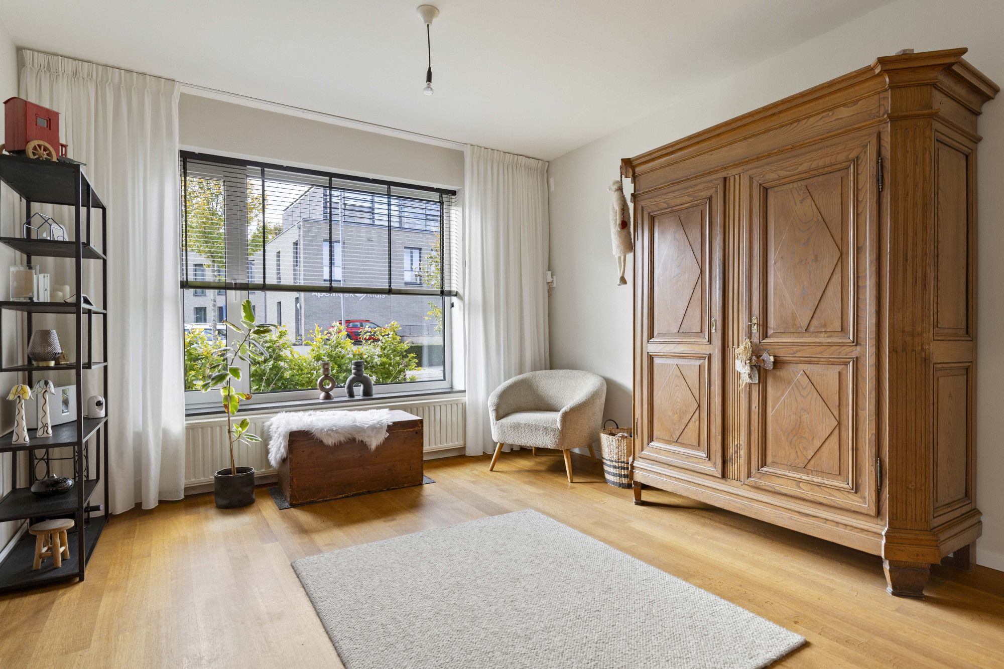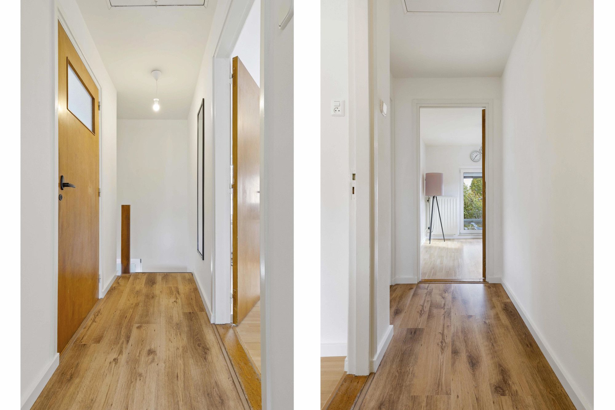 Via de ruime hal met tegelvloer, moderne meterkast en trapopgang bereikt u de royale woonkamer met parketvloer, airconditioning en openslaande tuindeuren naar de sfeervolle, omsloten tuin.