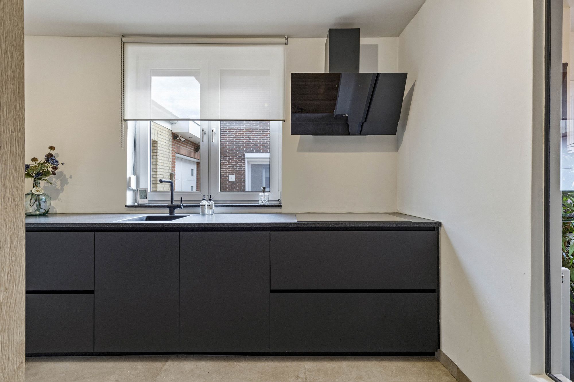 De semi-open keuken is modern ingericht en voorzien van een 4-pits inductiekookplaat, afzuigkap, koelkast en combi-oven.