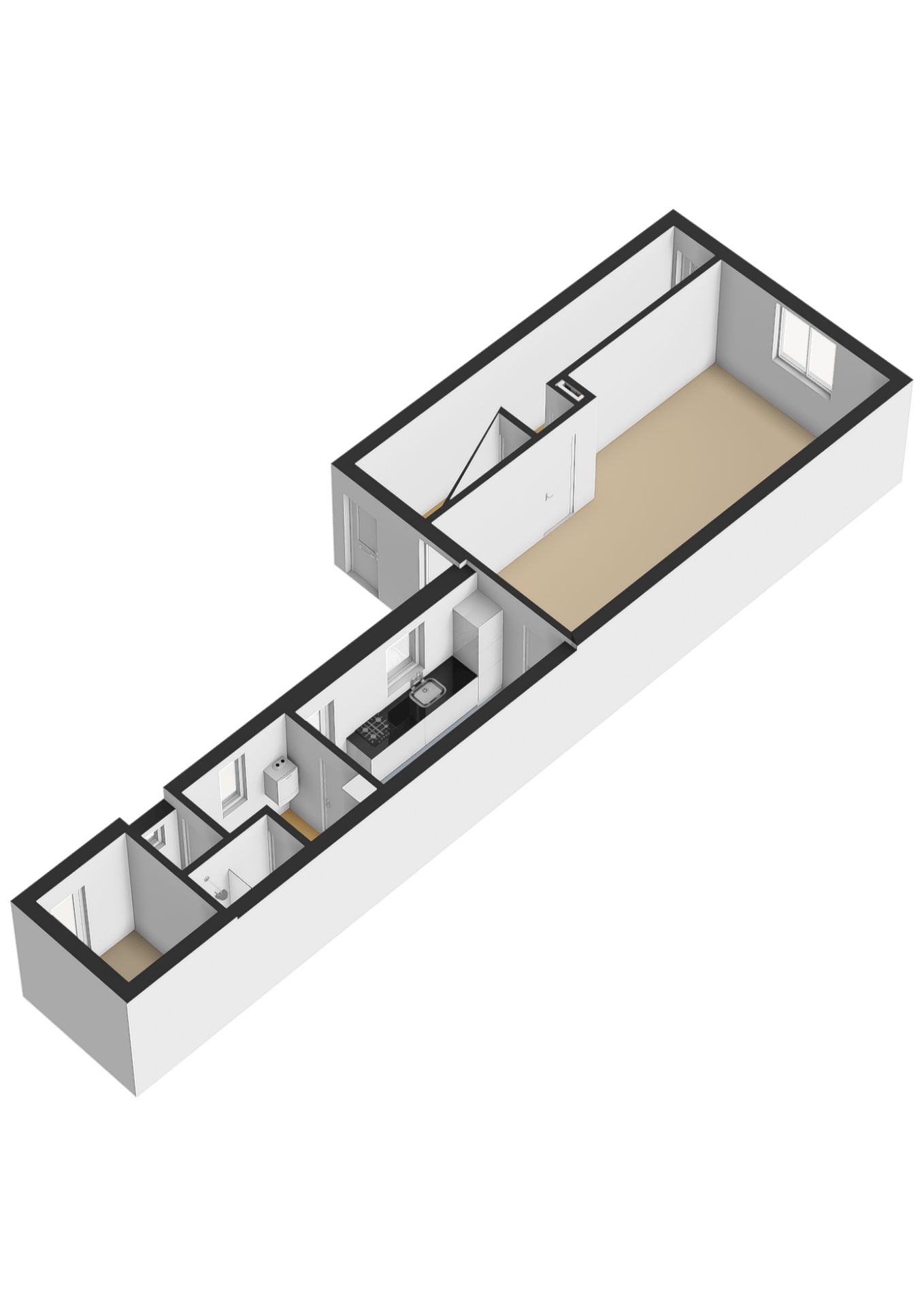 Ruime doorzonwoonkamer met toegang tot de gesloten keuken. De keuken is voorzien van de navolgende inbouwapparatuur: 4 pits gaskookplaat en afzuigkap. Via de keuken is er toegang naar de toiletruimte, de badkamer en berging.
