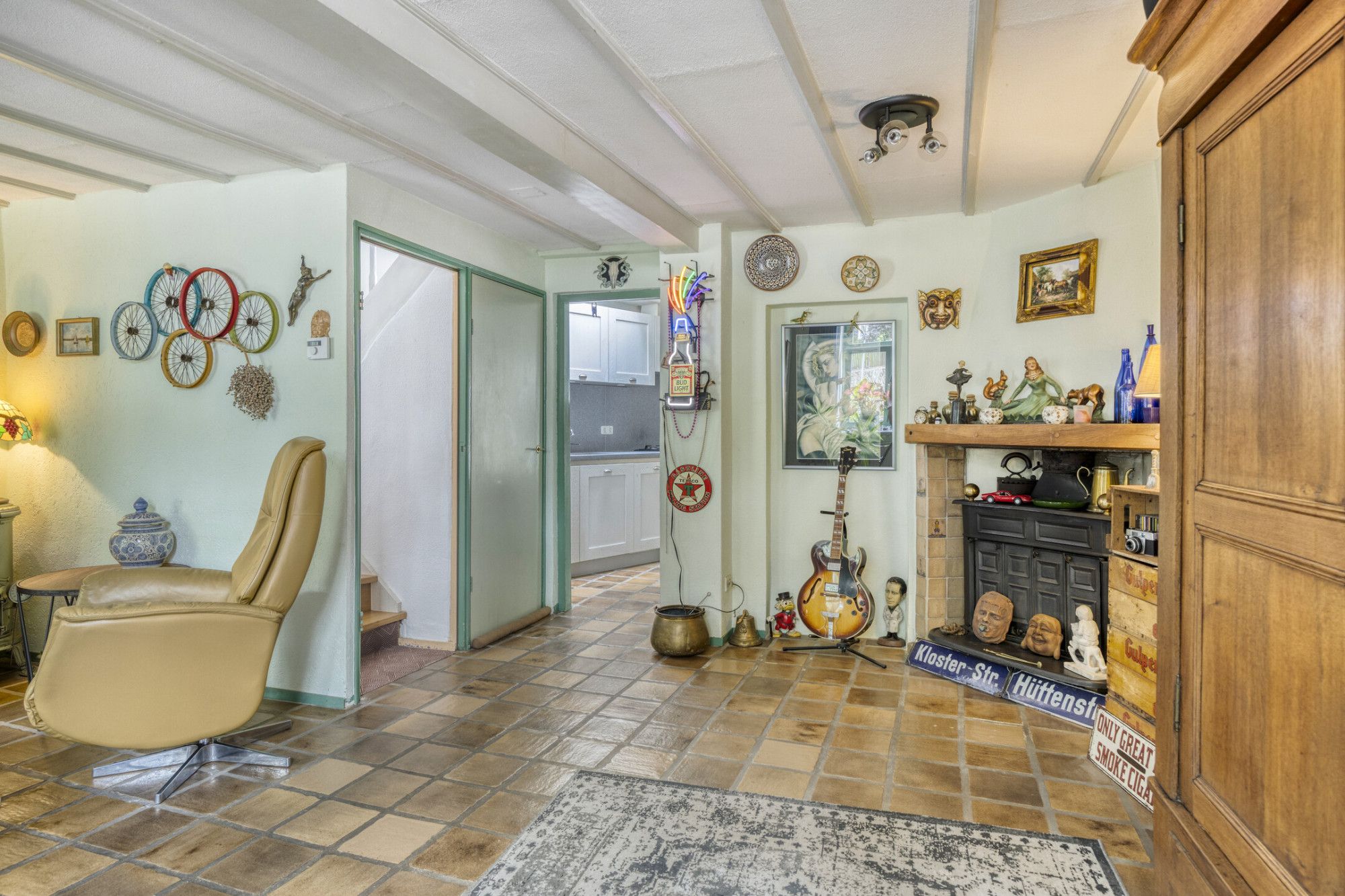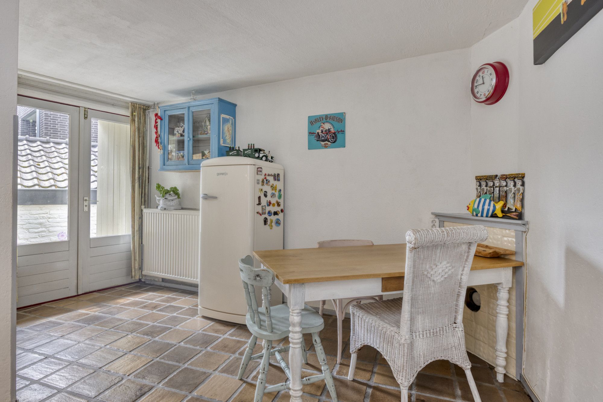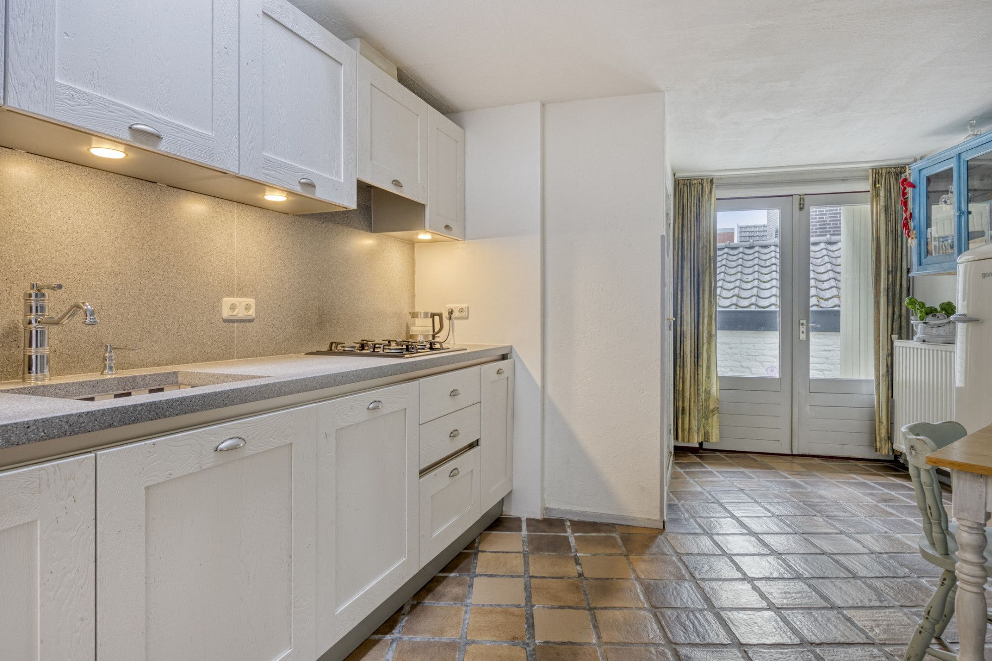 Via de hal, met meterkast, in het midden van de woning bereikt u de woonkamer. De woonkamer van ca. 27 m² is voorzien van een karakteristieke tegelvloer en houtkachel zorgt voor extra sfeer. De half open keukenruimte van ca. 10 m² is voorzien van dezelfde karakteristieke tegelvloer en een inbouwkeuken met gootsteen, vaatwasser, 4-pits gaskookplaat, afzuigkap en aansluiting voor witgoedapparatuur. Middels openslaande deuren is toegang tot een achterom met erfdienstbaarheid. De keuken biedt tevens toegang tot de badkamer van ca. 3 m², welke voorzien is van een douchecabine, vaste wastafel in badmeubel, toilet en mechanische ventilatie.