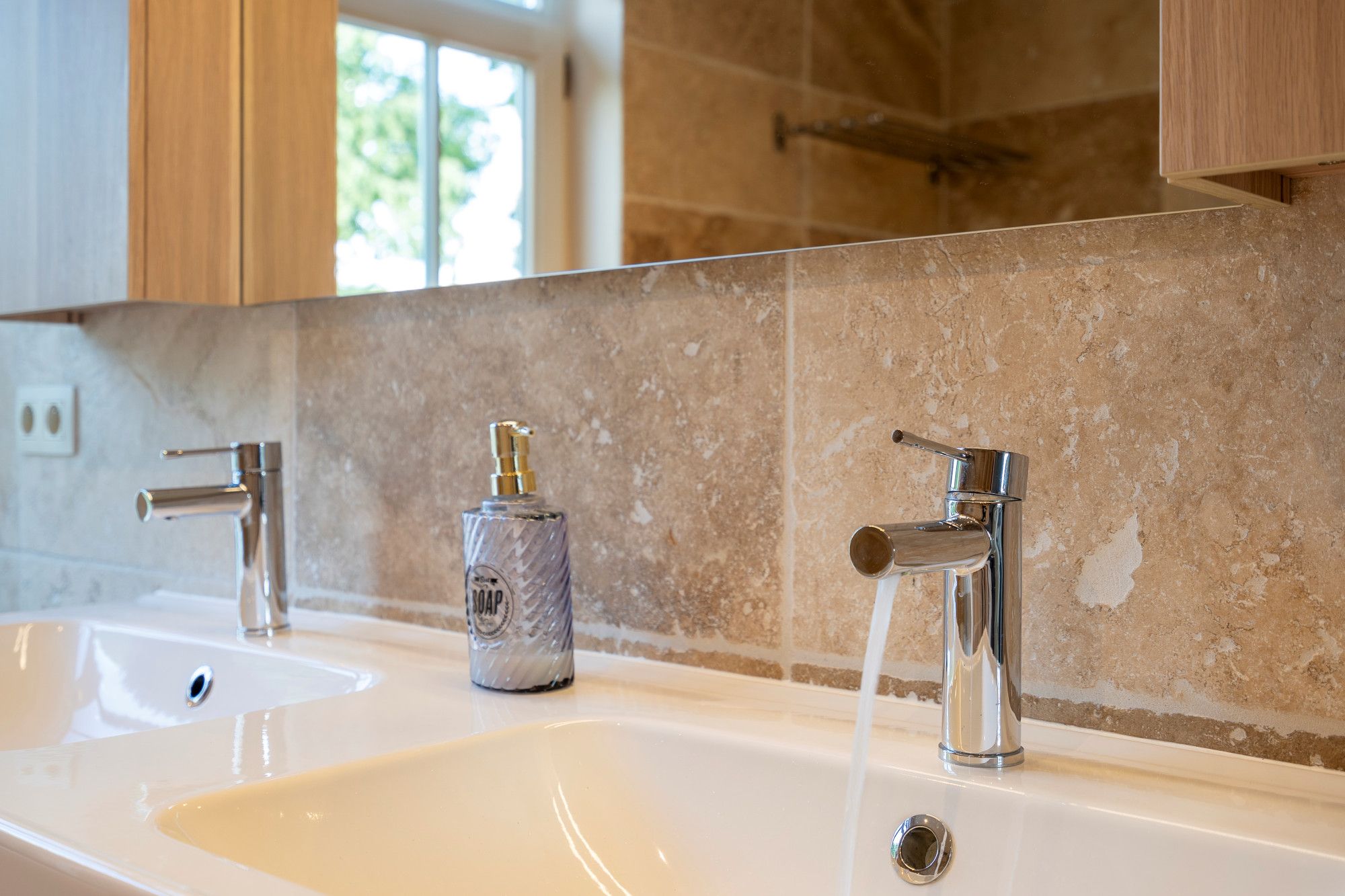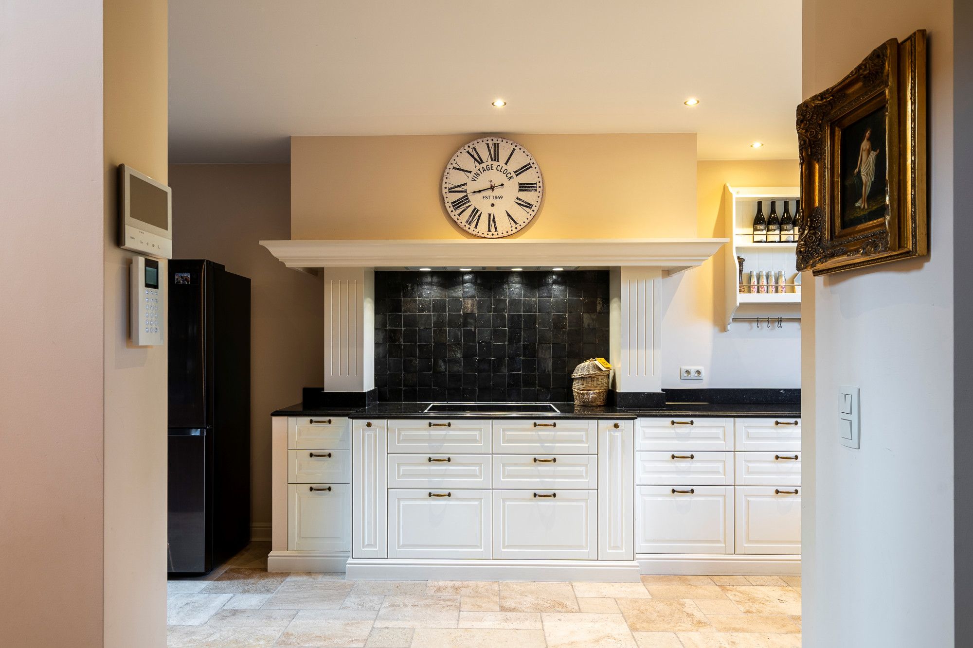 Through the central entrance hall with an elegant staircase, you enter the spacious, country-style kitchen featuring a blue stone countertop and equipped with all modern appliances: induction cooktop, extractor hood, refrigerator, freezer, oven, combi-microwave, dishwasher, double sink, and waste disposal unit.