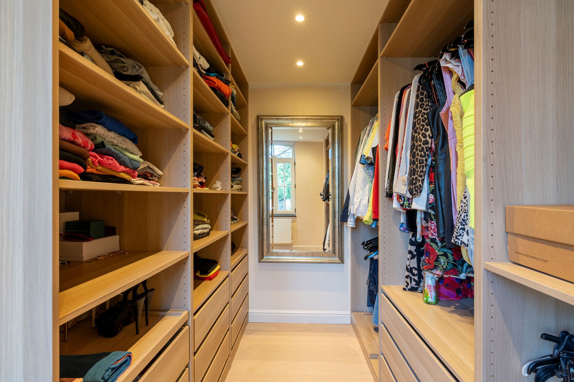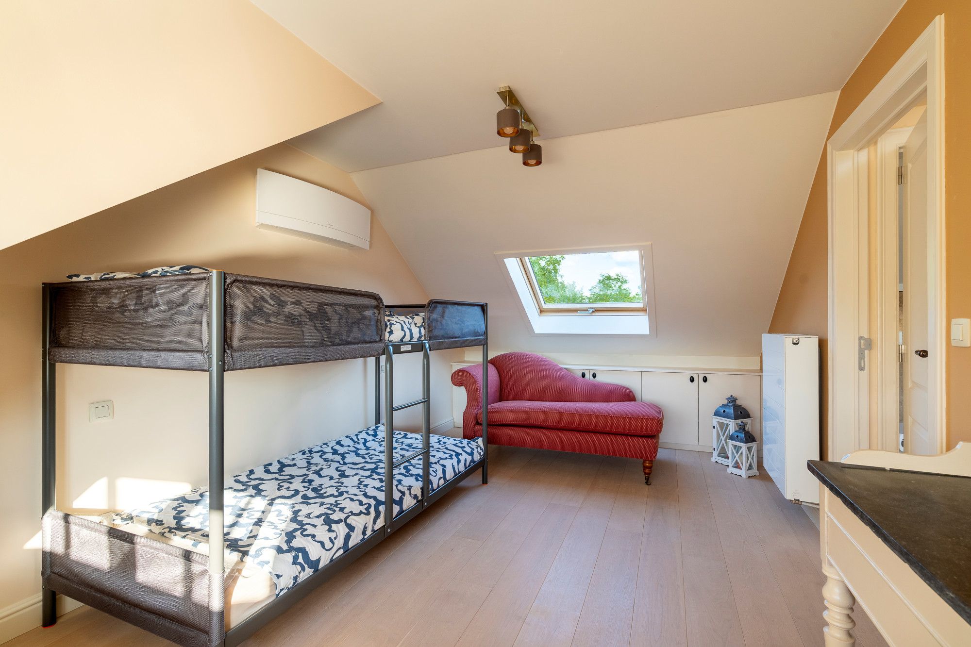 The first floor, finished with oak parquet flooring, comprises two full-sized bedrooms, a spacious walk-in closet, and two luxurious bathrooms. The attic level offers two additional bedrooms with built-in wardrobes – perfect for children, guests, or as hobby rooms.
