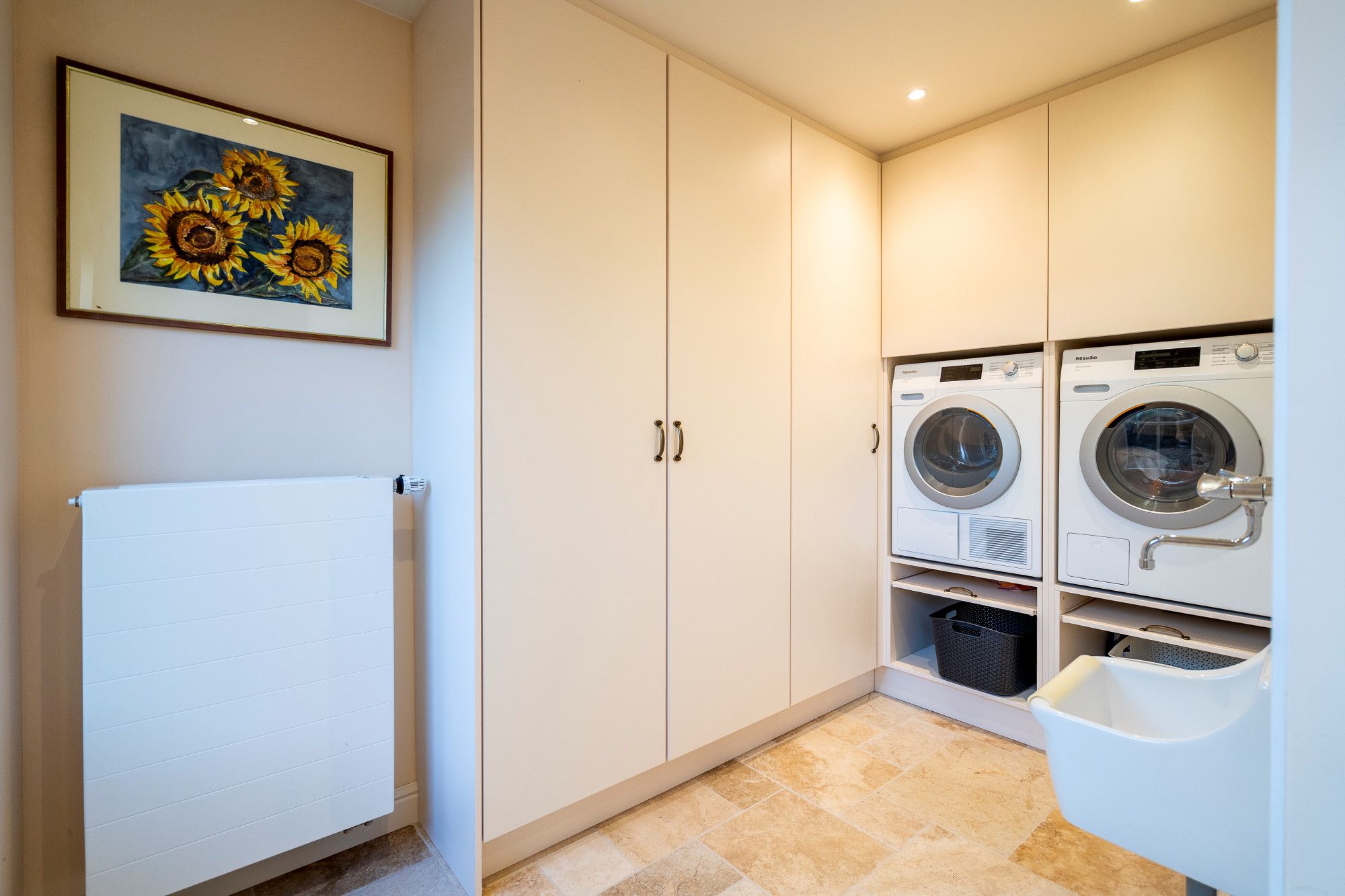 Adjacent to the kitchen is the cozy living room with a dining area, a lounge with an atmospheric gas fireplace, and a practical home office. The ground floor also includes a utility room with custom cabinetry and a guest toilet.