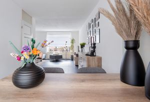 Via de onderhoudsvriendelijke voortuin en oprit bereikt u de woning. Bij binnenkomst in de hal treft u de meterkast, een separate toiletruimte met modern hangcloset en fonteintje, en de trapopgang naar de eerste verdieping.