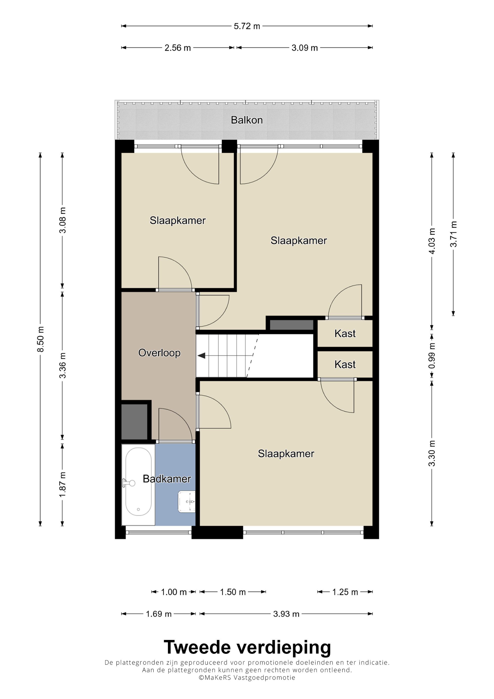 De tweede verdieping biedt maar liefst drie ruime slaapkamers, waarvan twee direct toegang hebben tot een tweede balkon. De badkamer is compleet met een wastafel in een badkamermeubel en een ligbad.