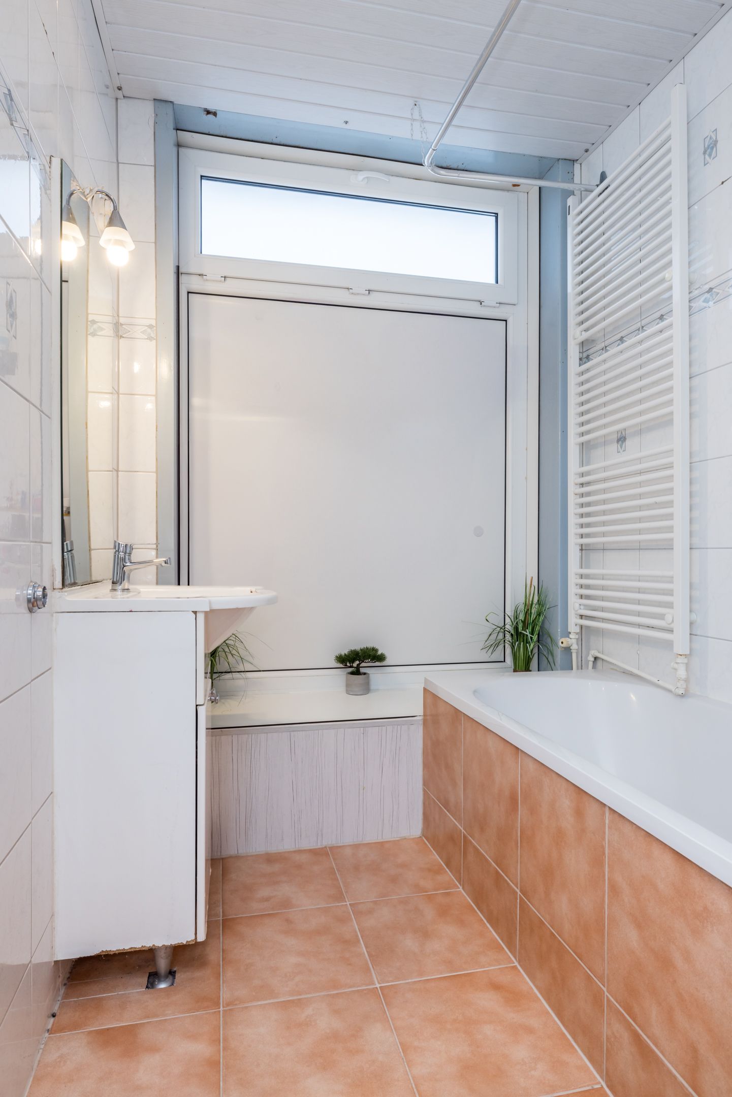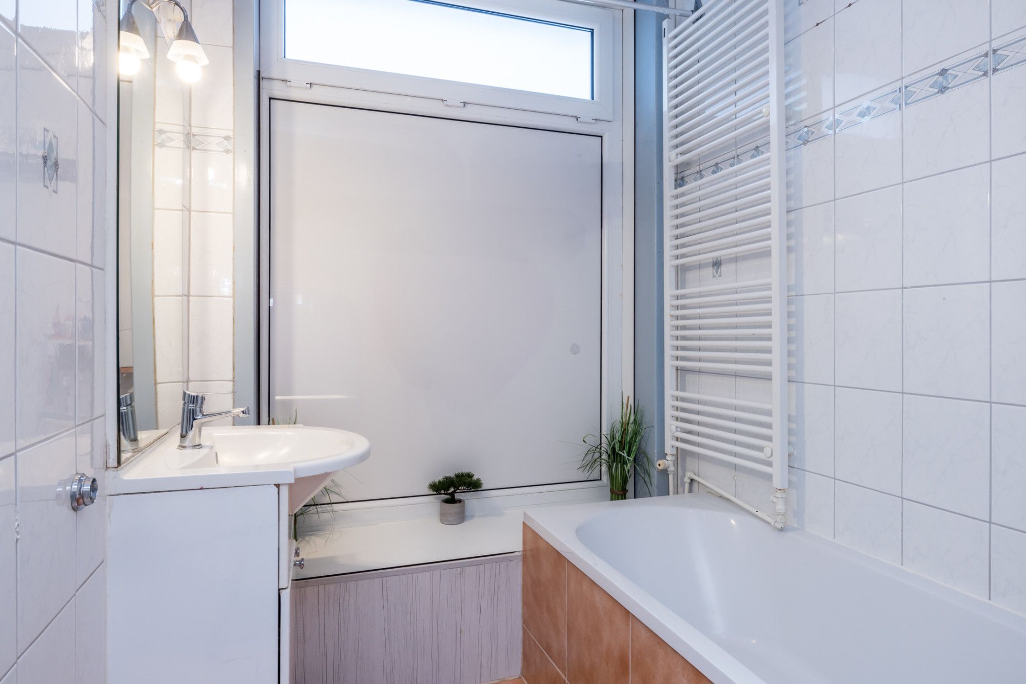 De geheel betegelde badkamer is voorzien van een vaste wastafel in een badkamermeubel / ligbad en een handdoekradiator.