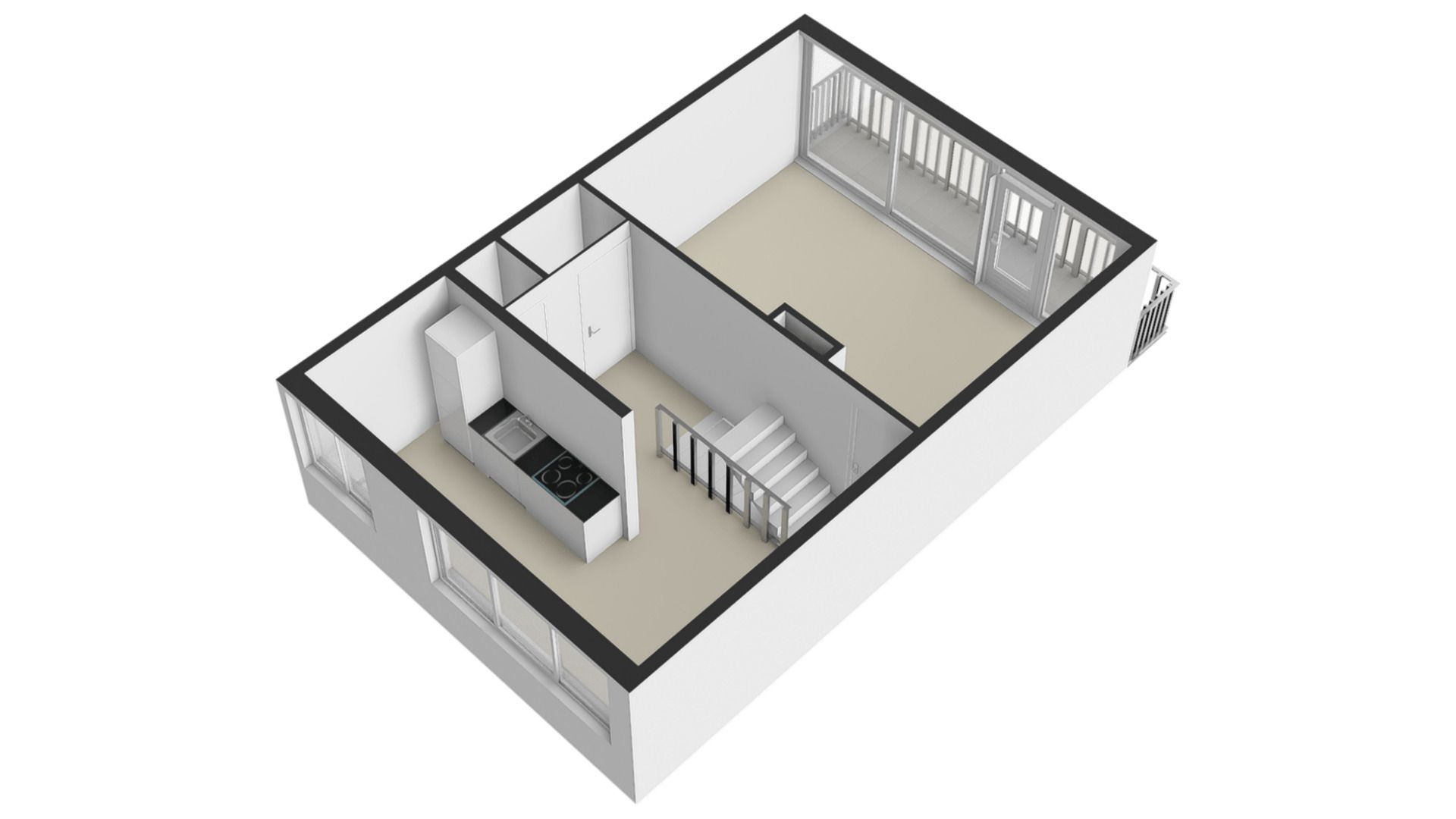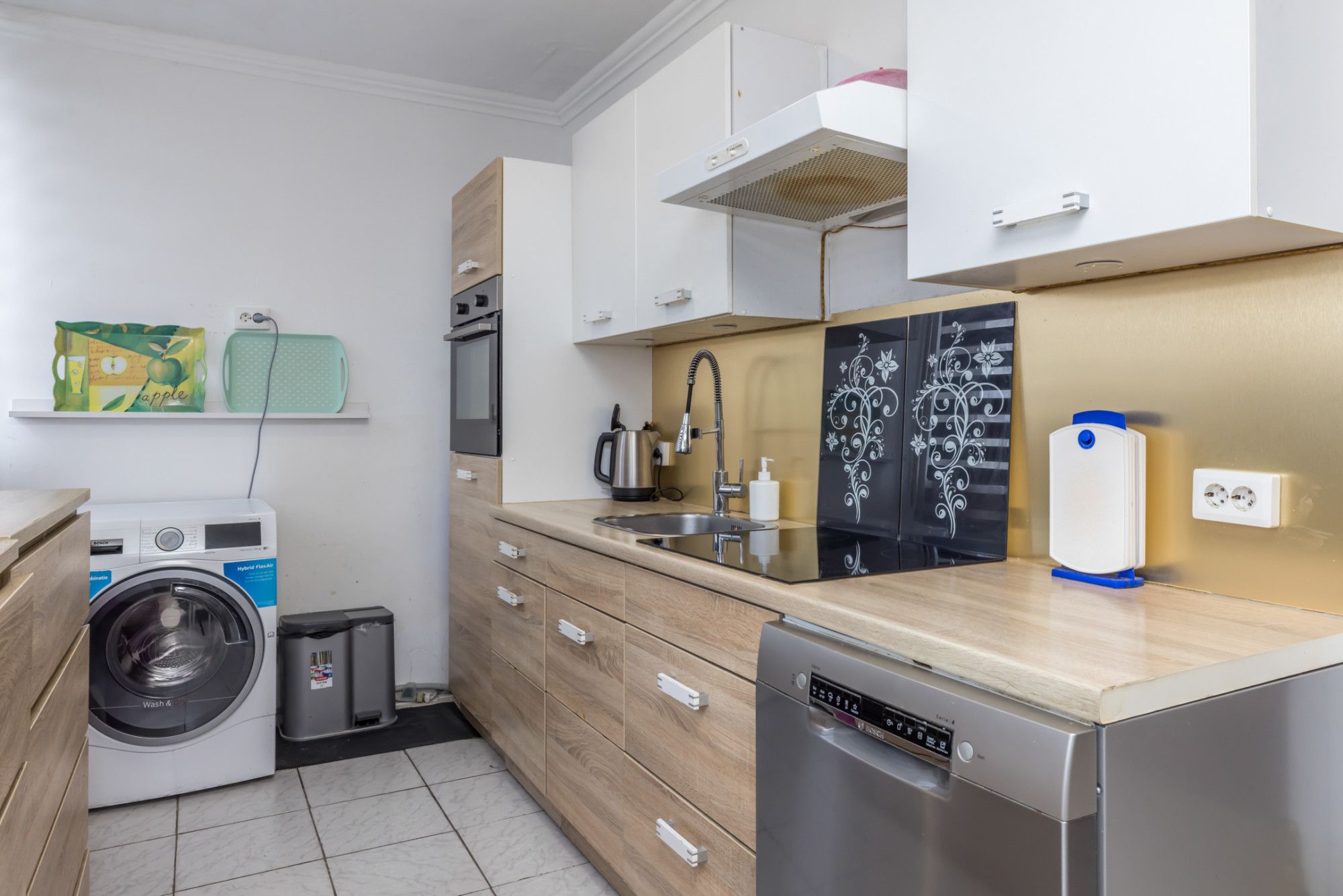 Voorgelegen gesloten keukenruimte met eenvoudige inbouwkeuken voorzien van apparatuur, te weten: 4 zones inductie kookplaat / afzuigkap / elektrische oven / separate koelkast (ter overname) en wasbak.