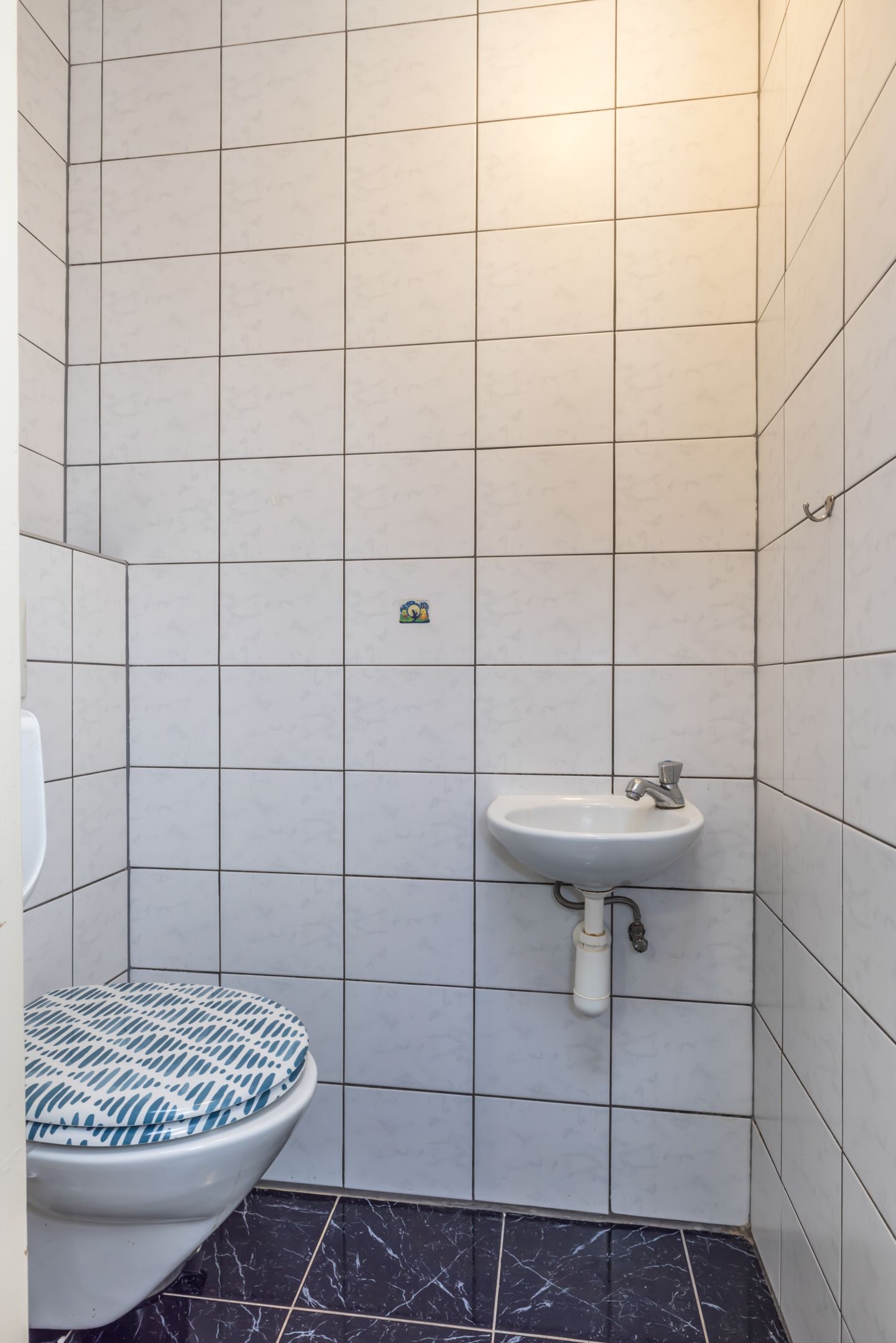 Overloop met trappenhuis naar de verdieping, geheel betegeld gastentoilet met zwevend closet en fonteintje. Er is een muurkast met bergruimte.