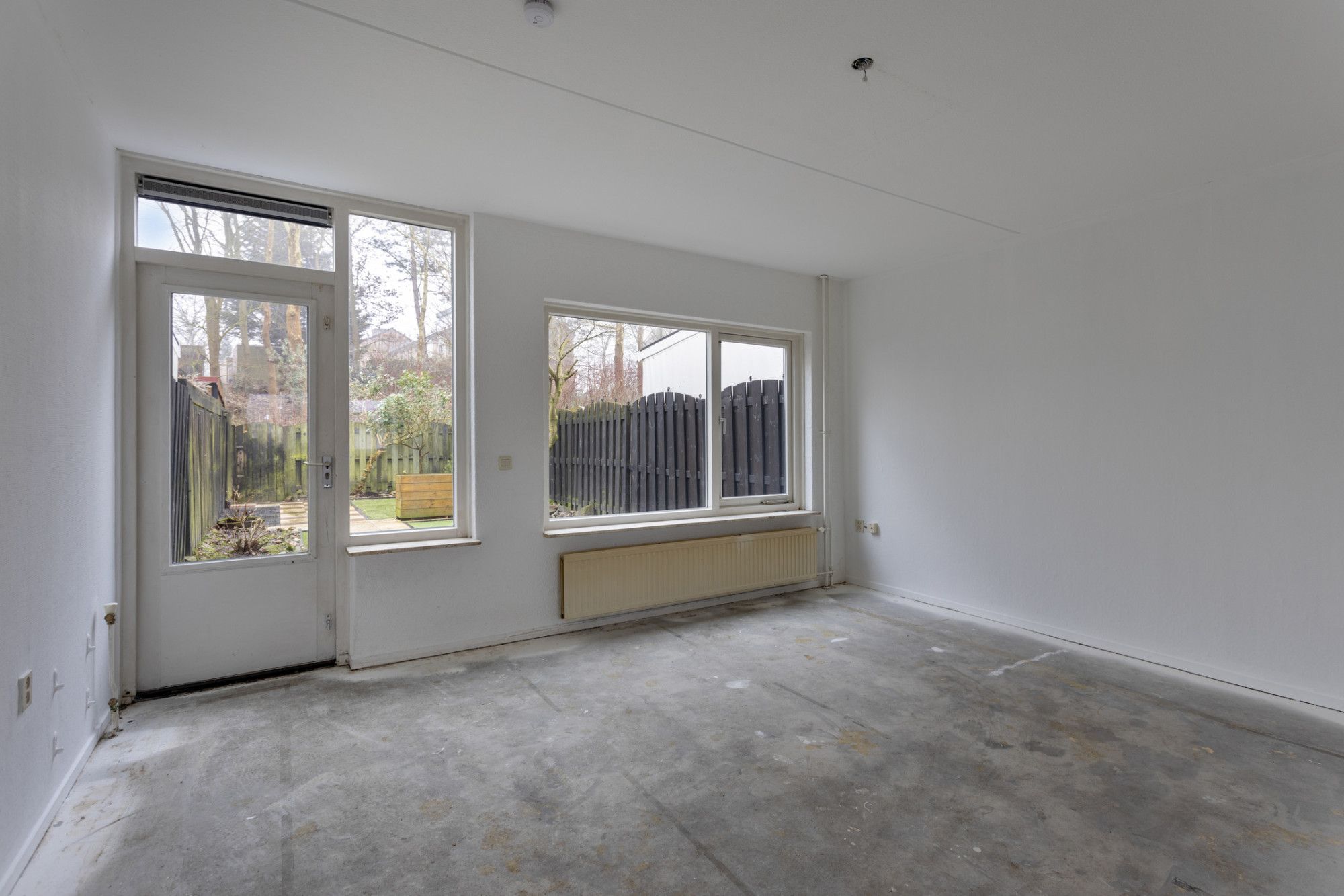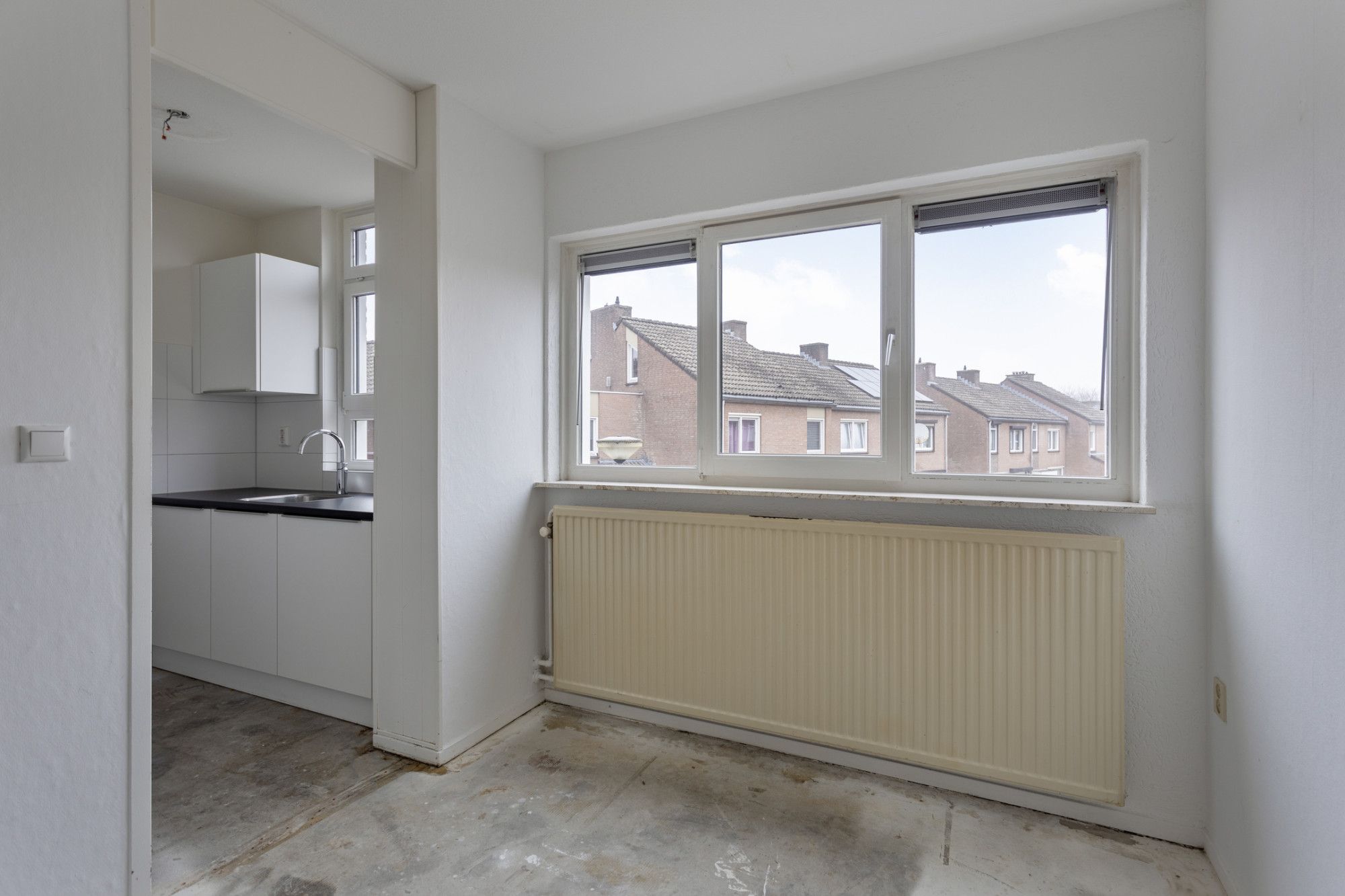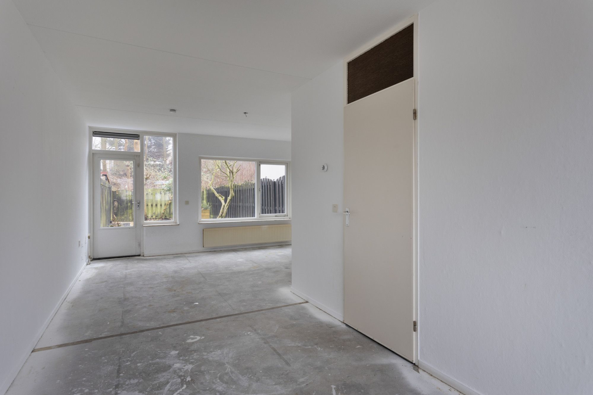 Overloop met toegang toiletruimte. Woonkamer met toegang naar de achtertuin, die op het zuiden is gelegen. Aan de voorzijde bevindt zich de moderne keukeninstallatie.