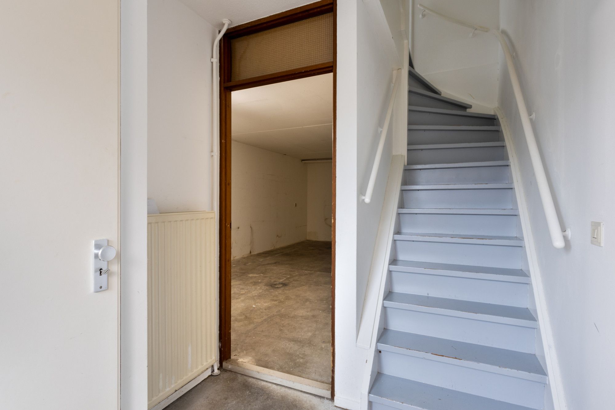 Oprit met toegang naar ruime garage. Hal met meterkast en verdiepingstrap. Inpandig is vanuit de hal ook de garage te bereiken.