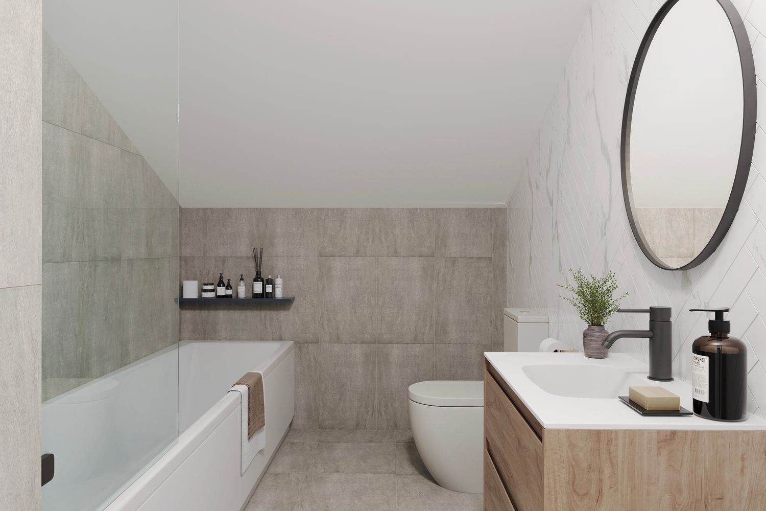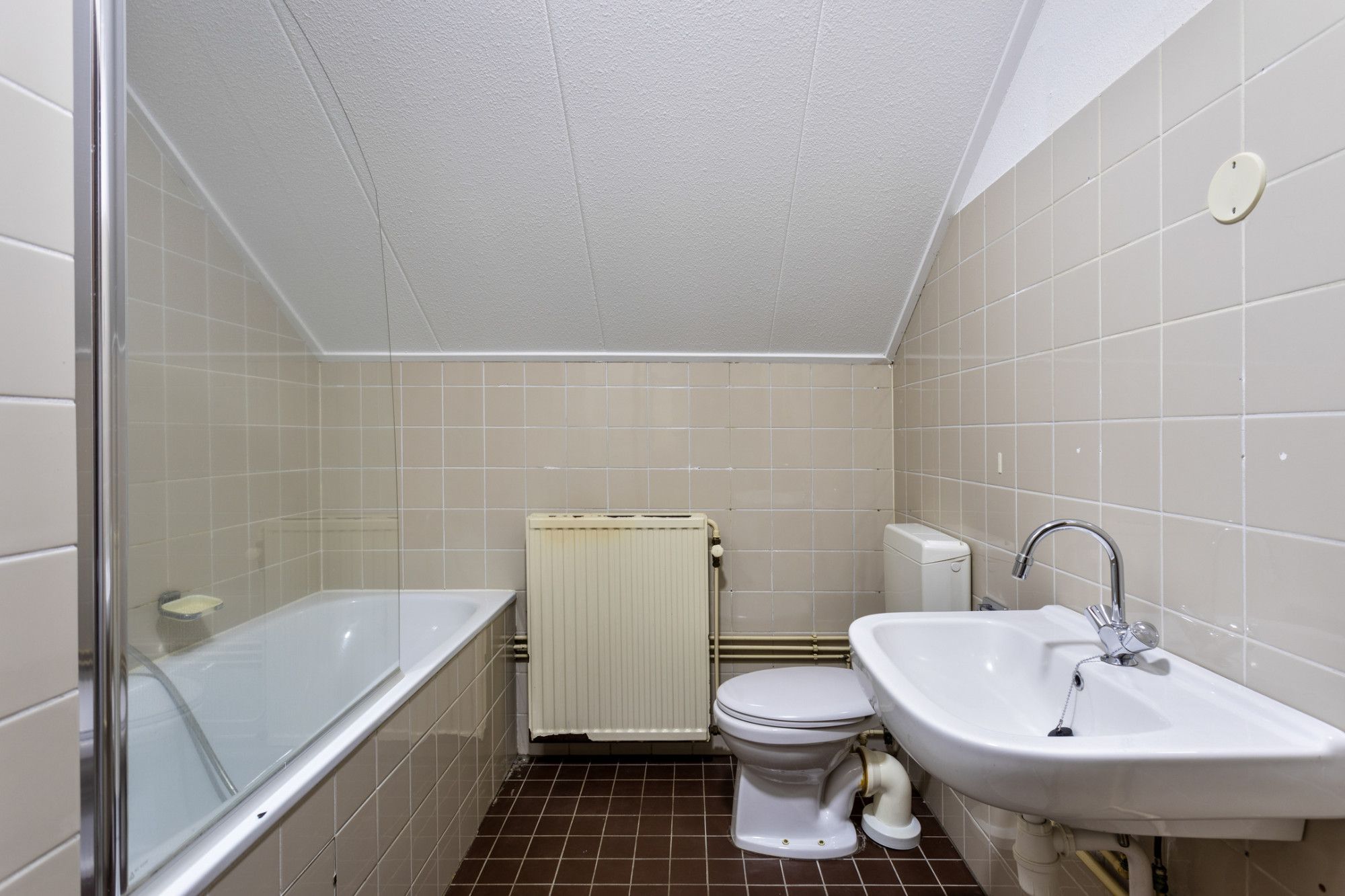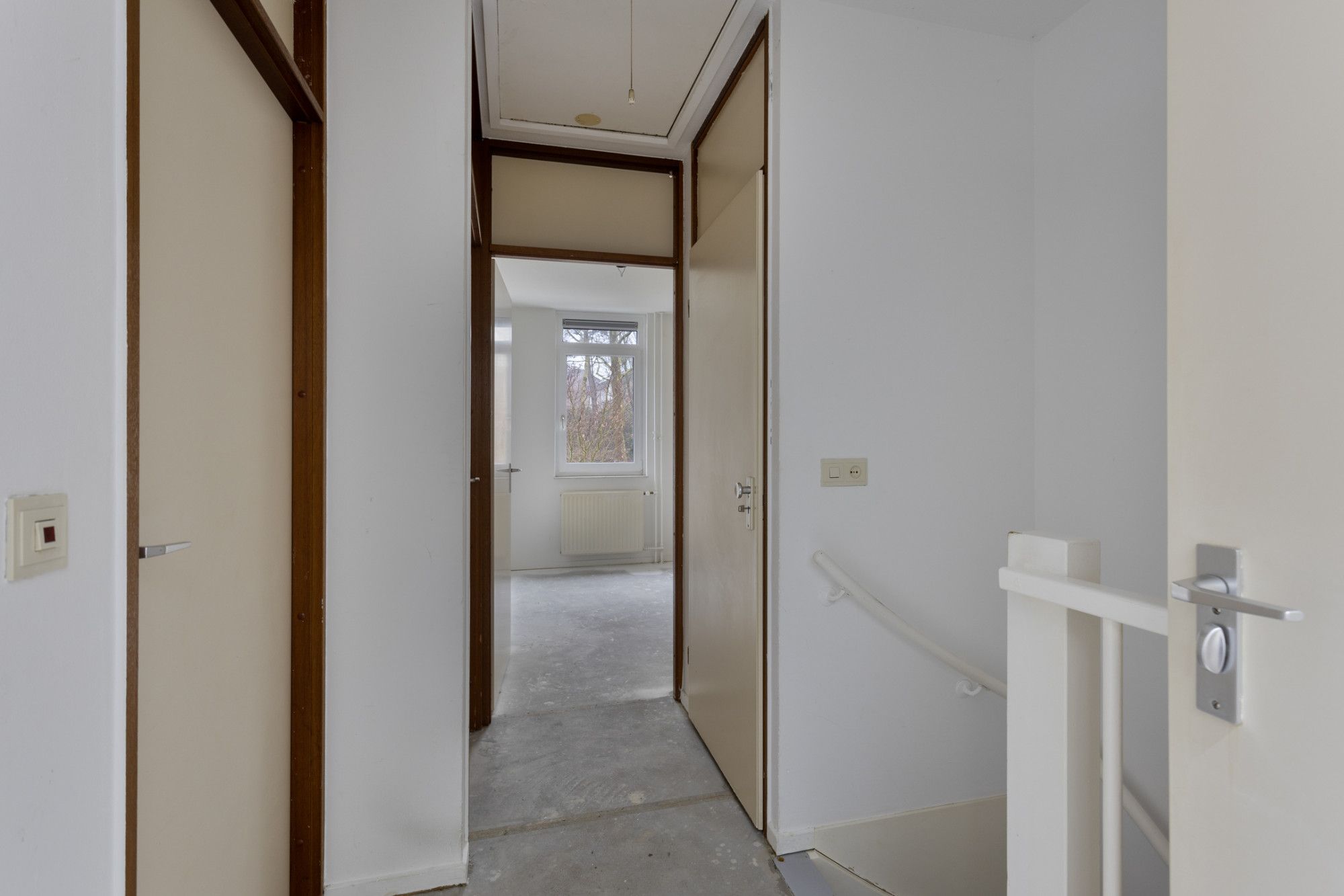 Overloop met toegang naar 3 slaapkamers. Badkamer met ligbad, toilet en wastafel.