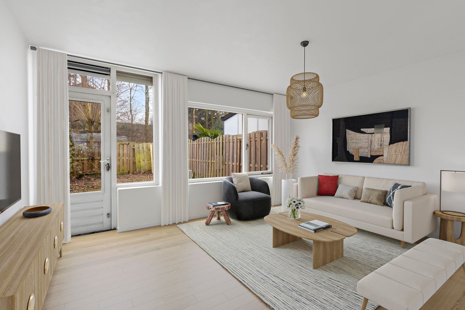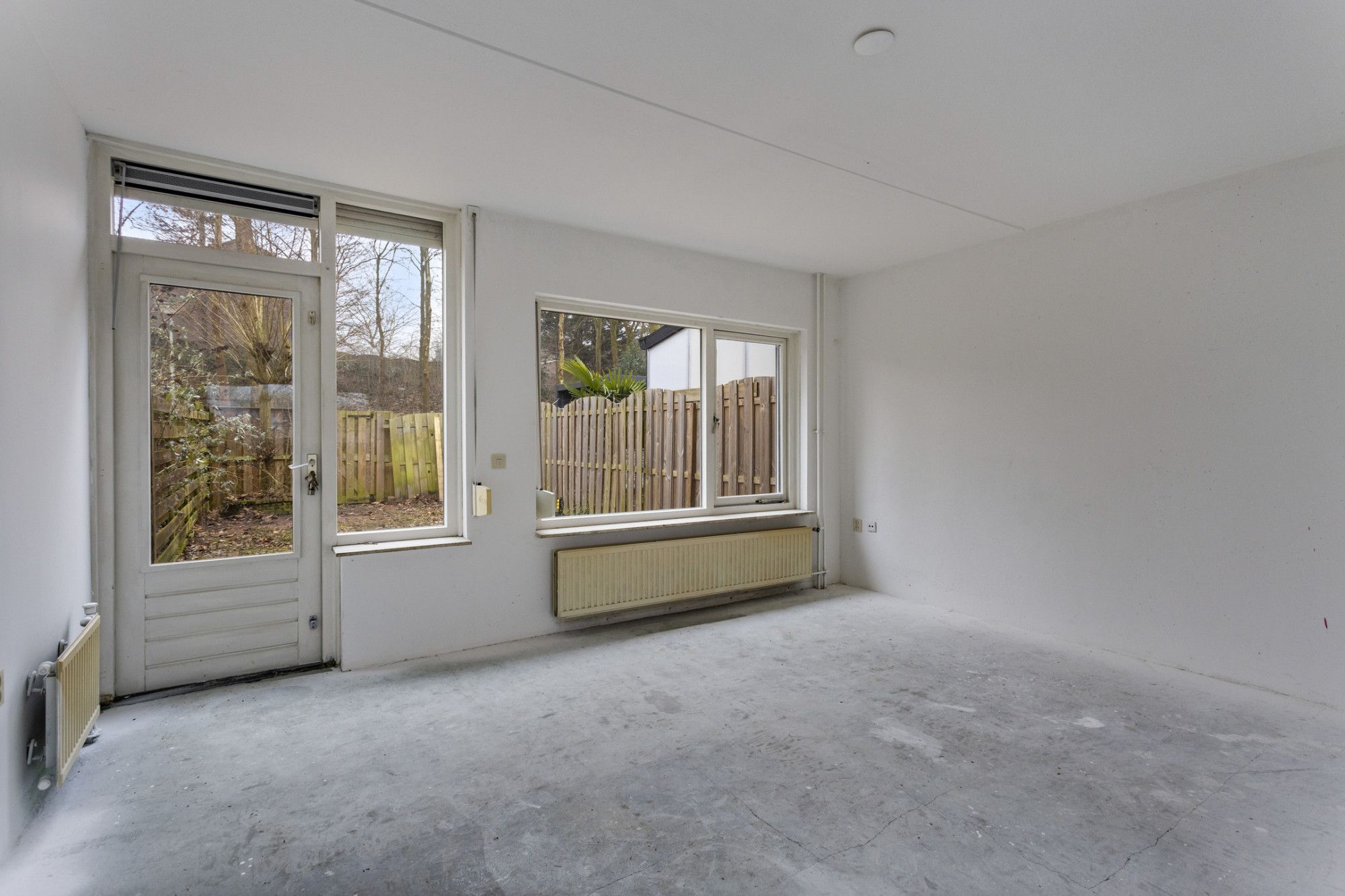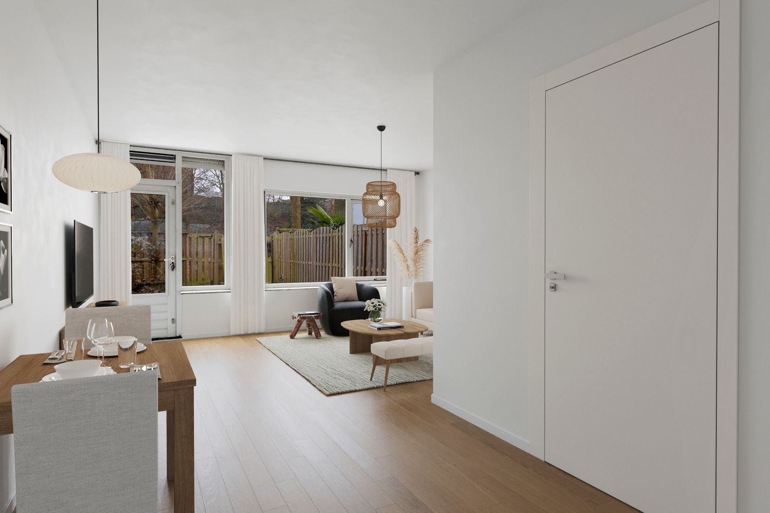 Overloop met toegang moderne toiletruimte. Woonkamer met toegang naar de achtertuin, die op het zuiden is gelegen. Aan de voorzijde bevindt zich de moderne keukeninstallatie.
