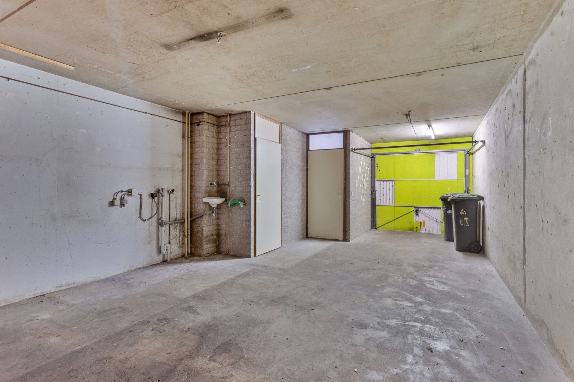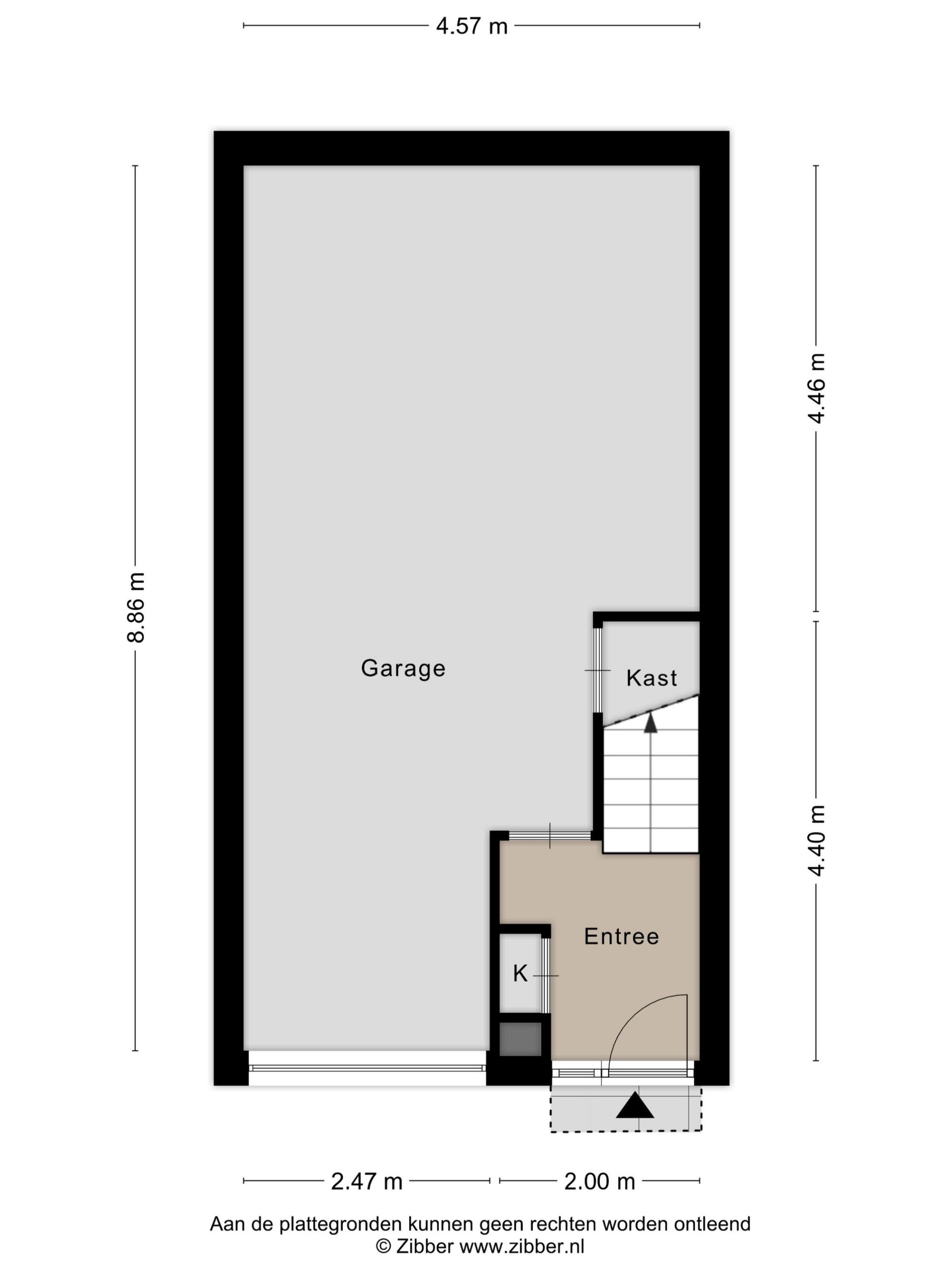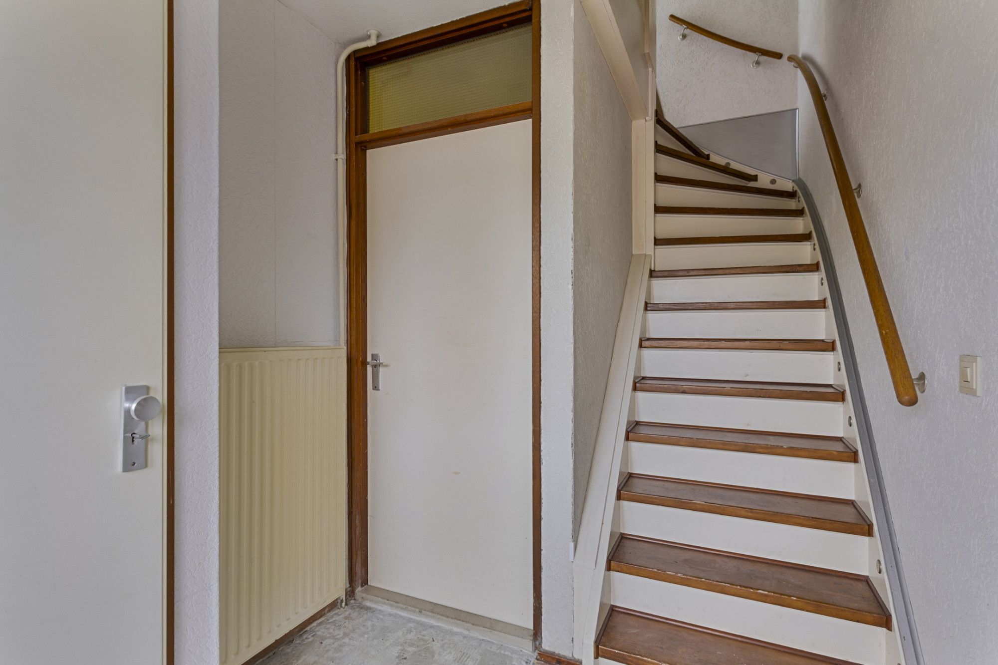 Oprit met toegang naar ruime garage. Hal met meterkast en verdiepingstrap. Inpandig is vanuit de hal ook de garage te bereiken.