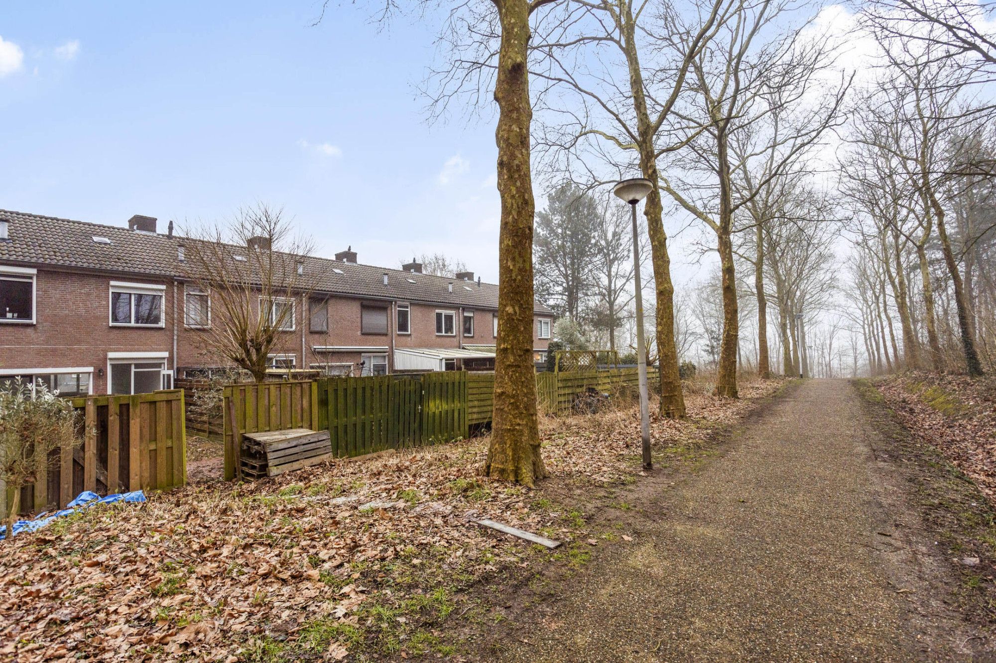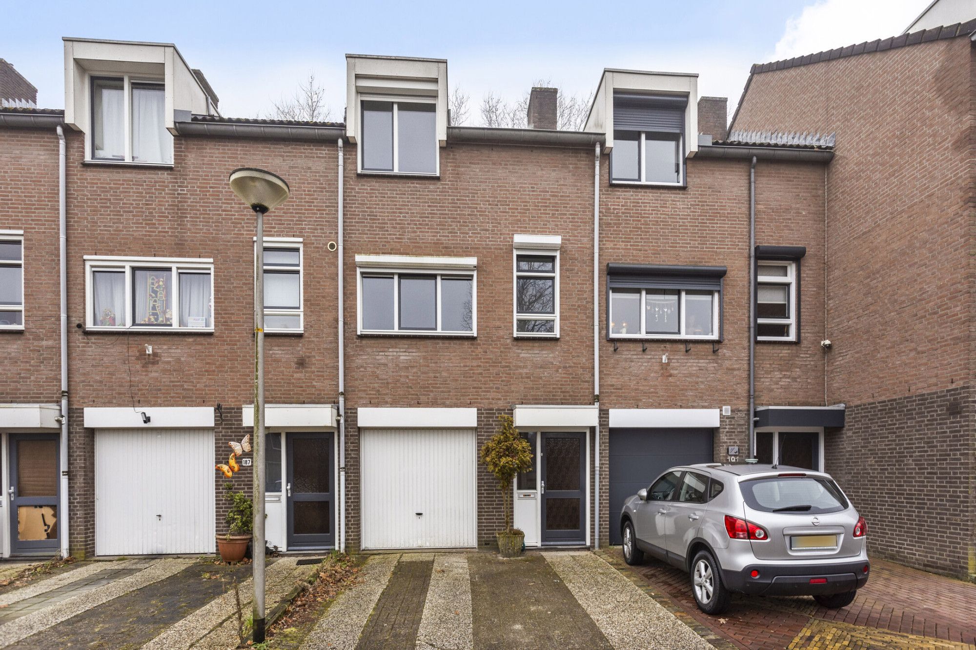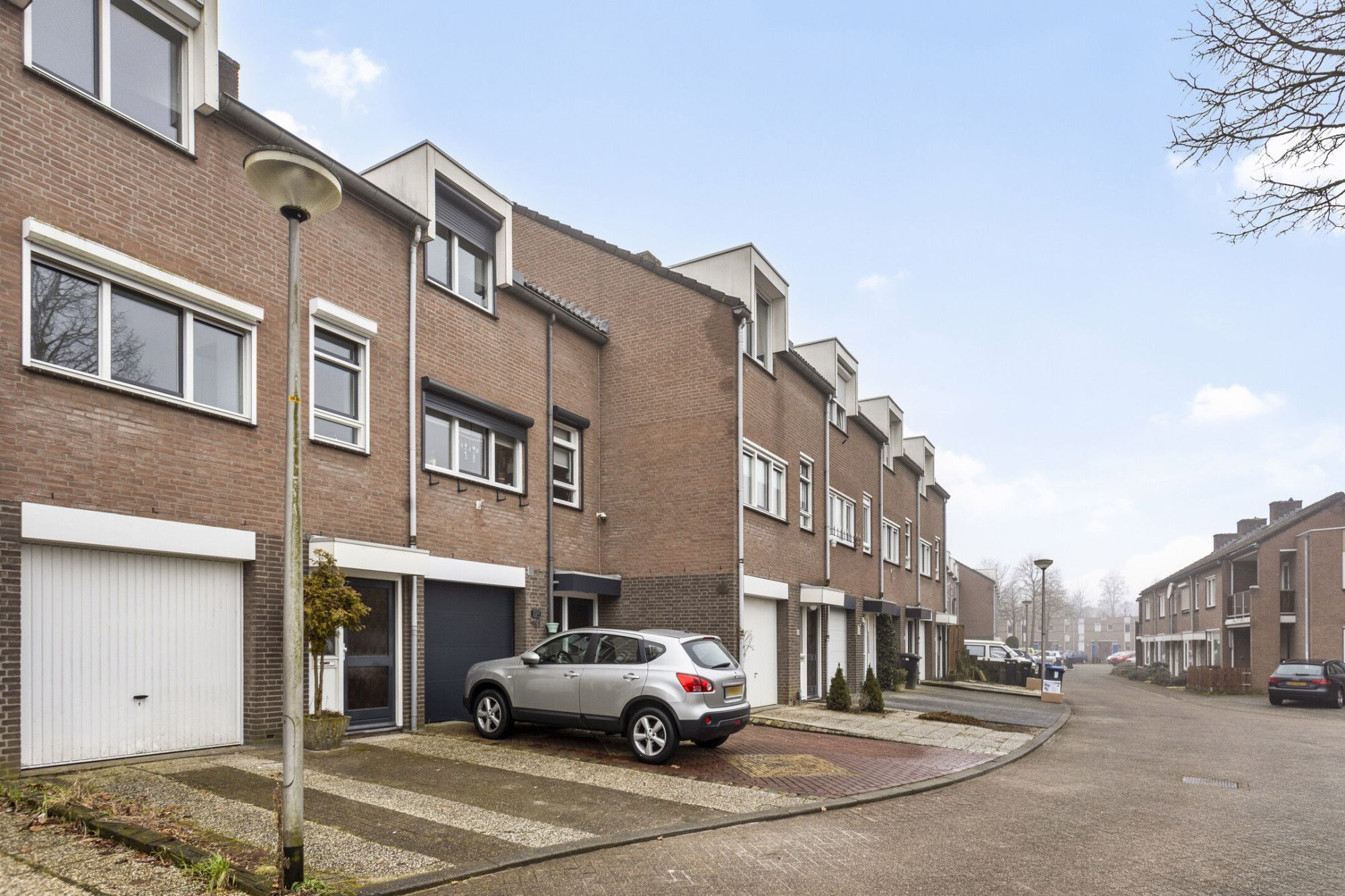 Oprit met toegang naar ruime garage. Hal met meterkast en verdiepingstrap. Inpandig is vanuit de hal ook de garage te bereiken.