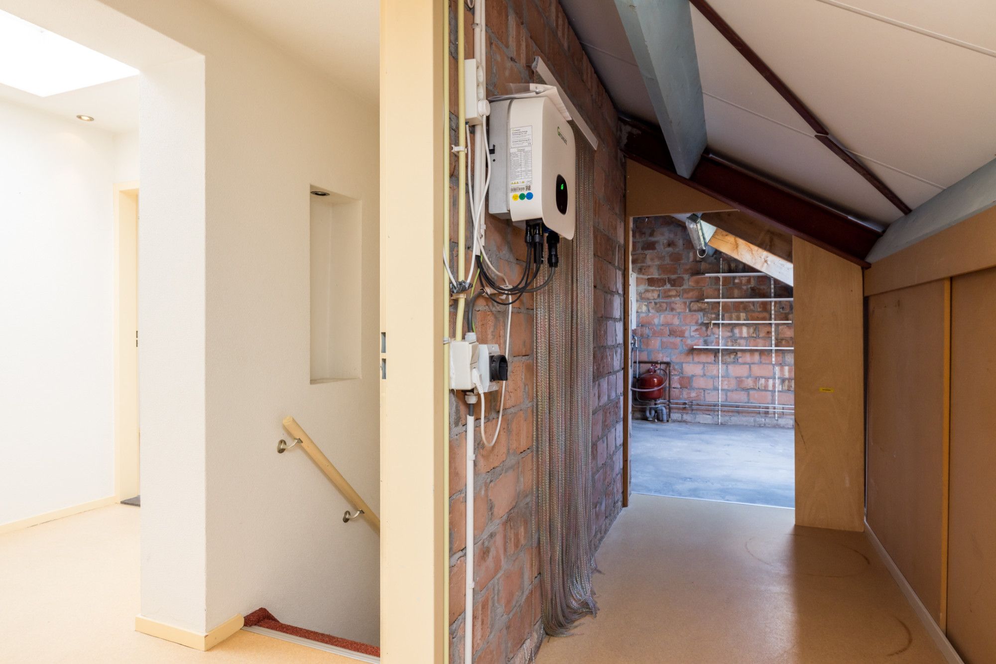Verder in de gang bevindt zich nog een bergkast en de trap naar de verdieping. Ook de garage is via deze gang bereikbaar. De inpandig te bereiken garage (5,25m x 4,91m) is v.v. een elektrische poort en heeft een deur naar het overdekt terras en de tuin.