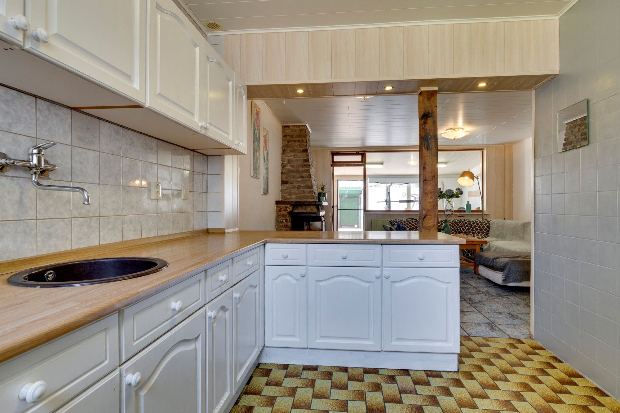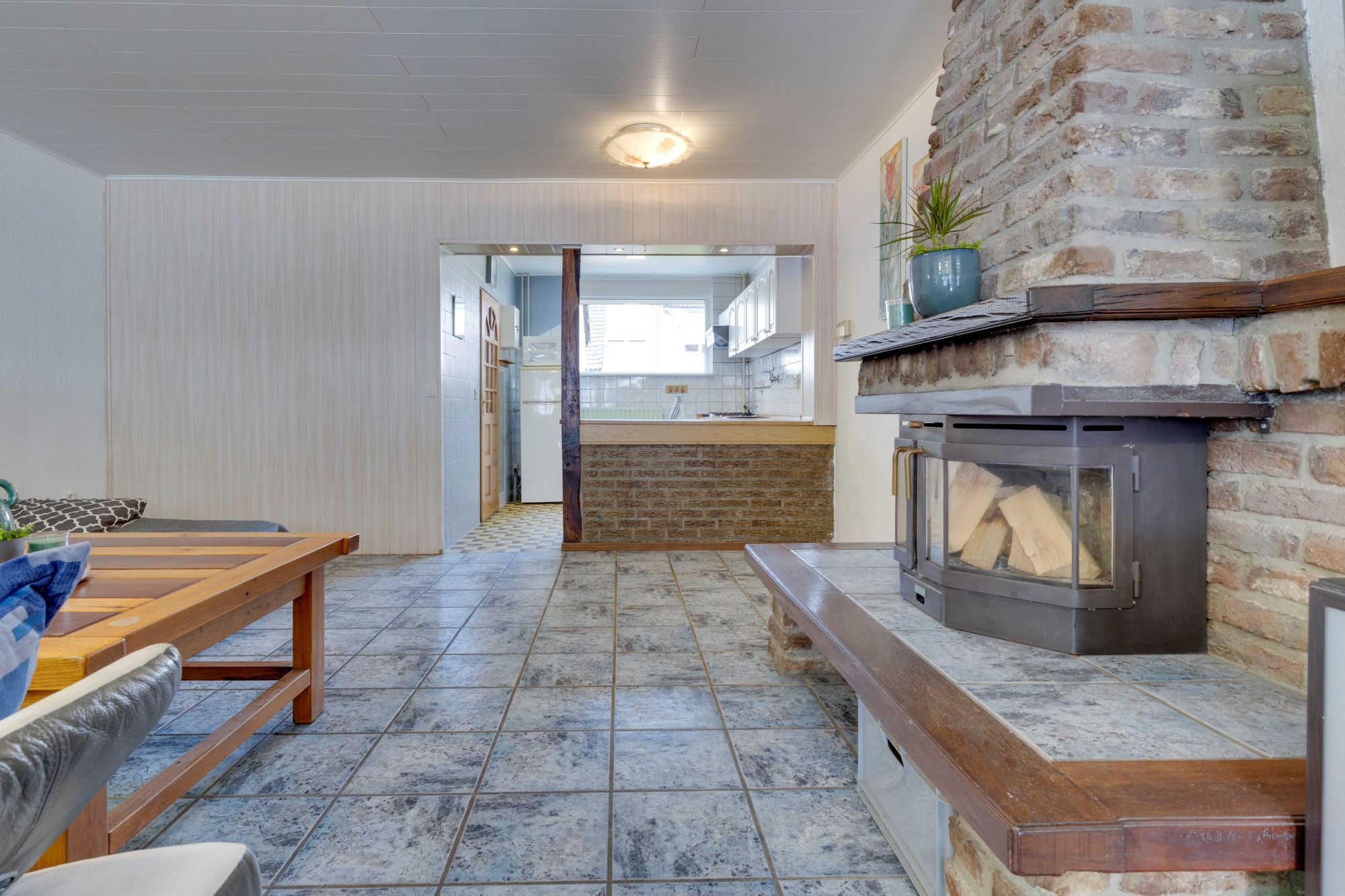 Via de hal bereikt u de ruime open keuken v.v. tegelvloer en aanbouwinstallatie incl. apparatuur, te weten, gaskookplaat, wasemkap, oven en losse koelkast. Royale woonkamer met plavuizenvloer en open haardpartij. Via de woonkamer heeft men toegang tot de serre (eenvoudig).