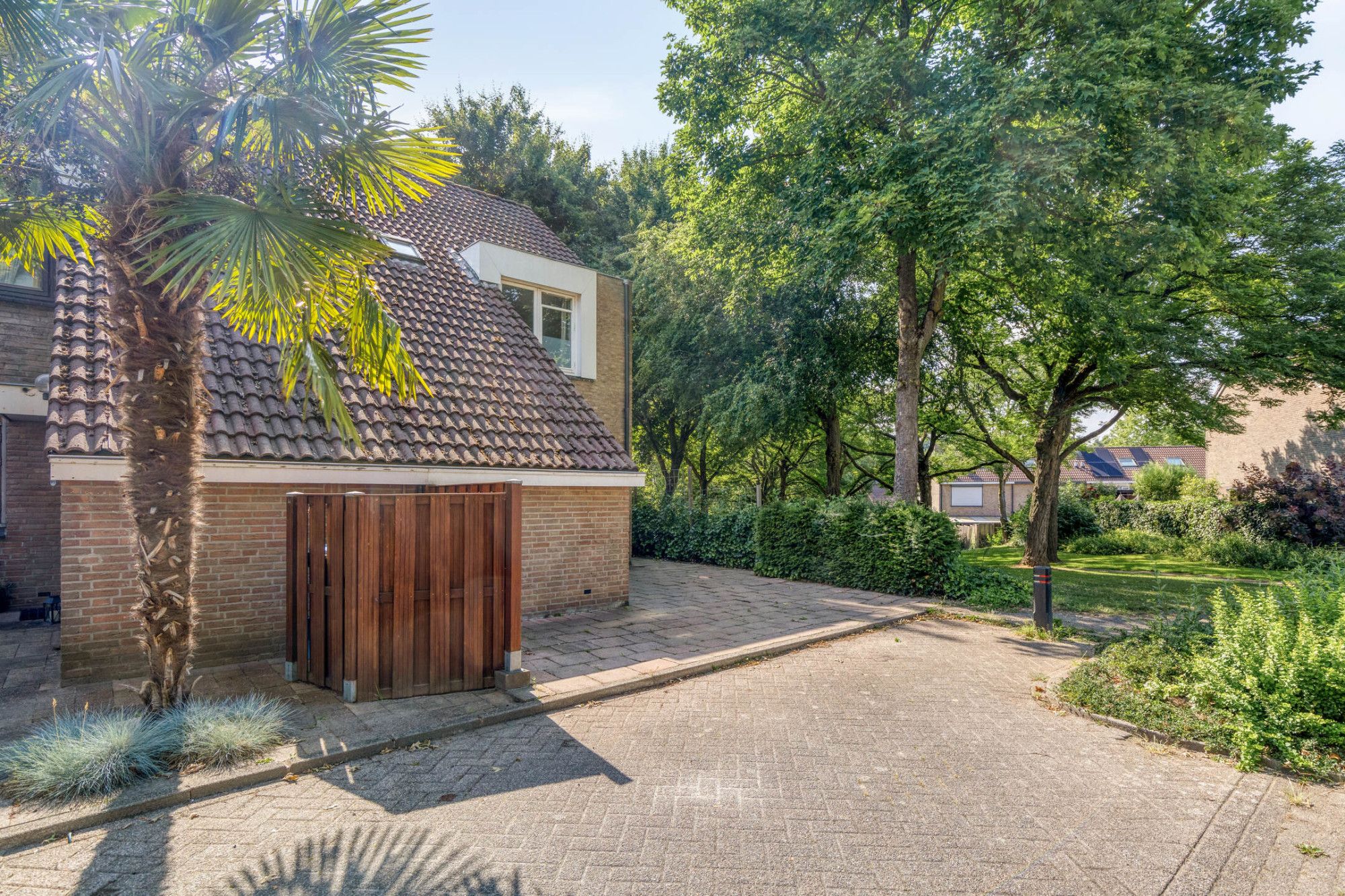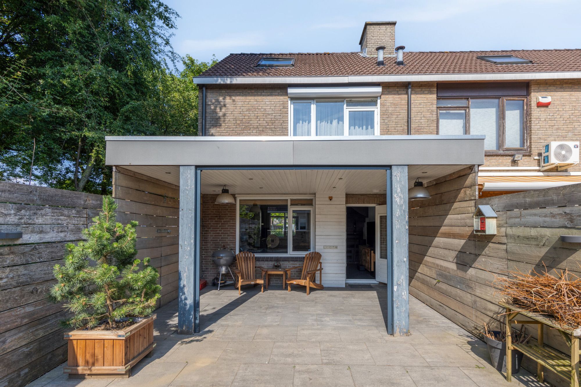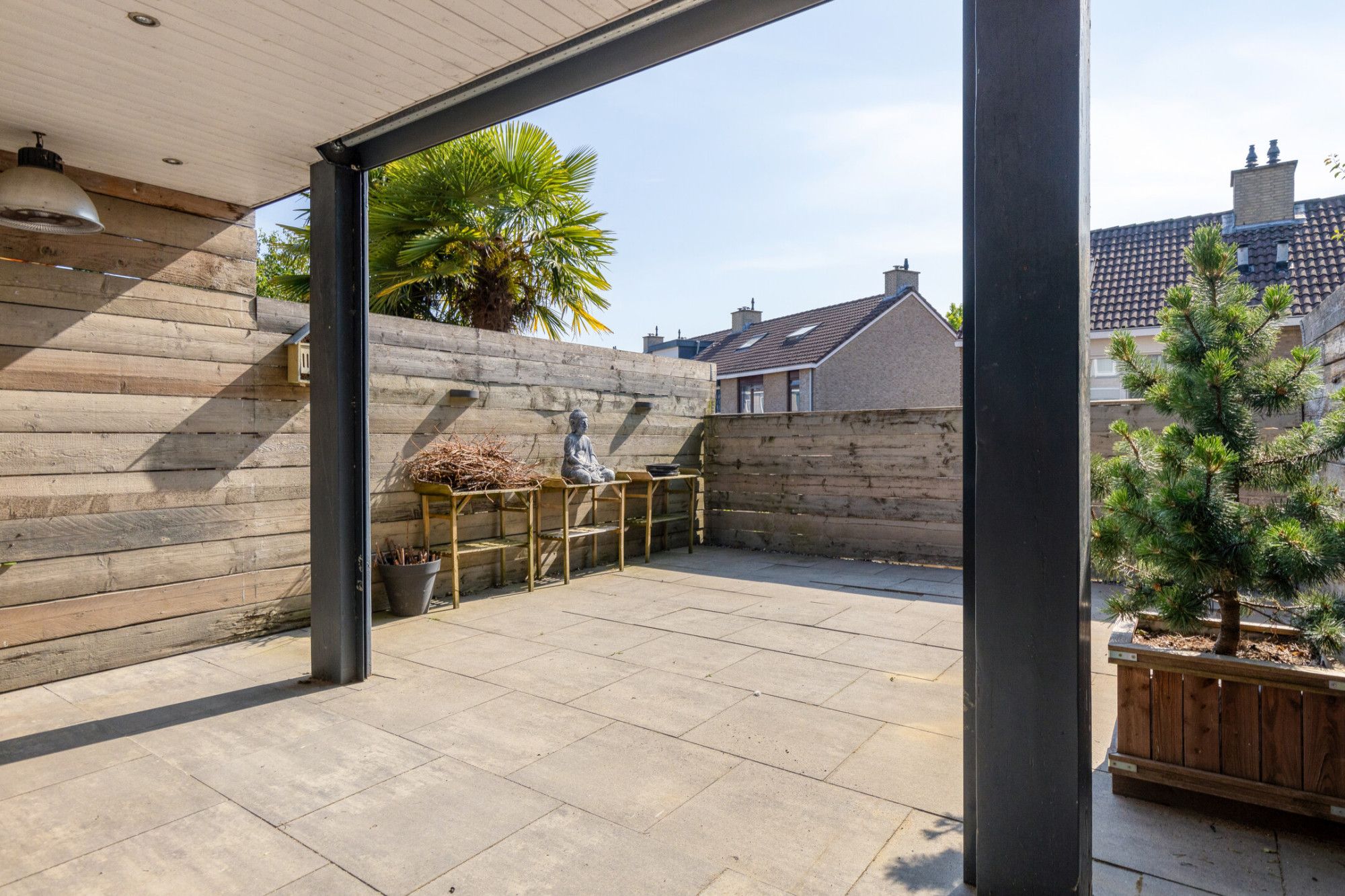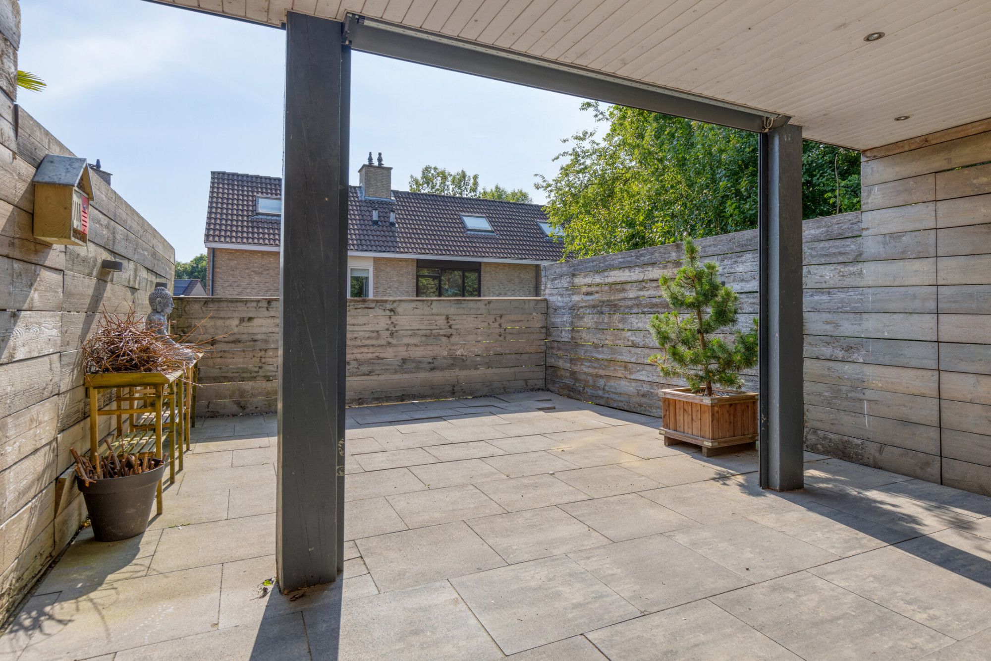 De achtertuin is geheel bestraat en voorzien van een terrasoverkapping en een zij-ingang.