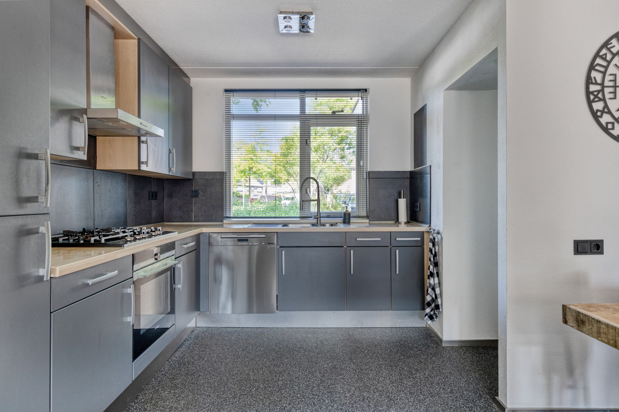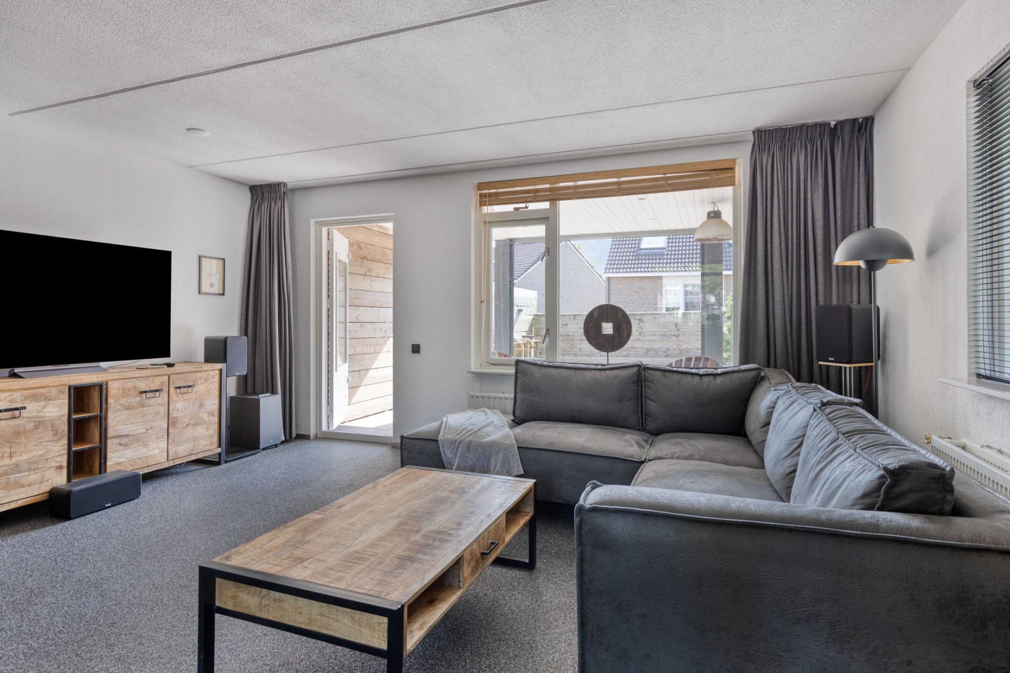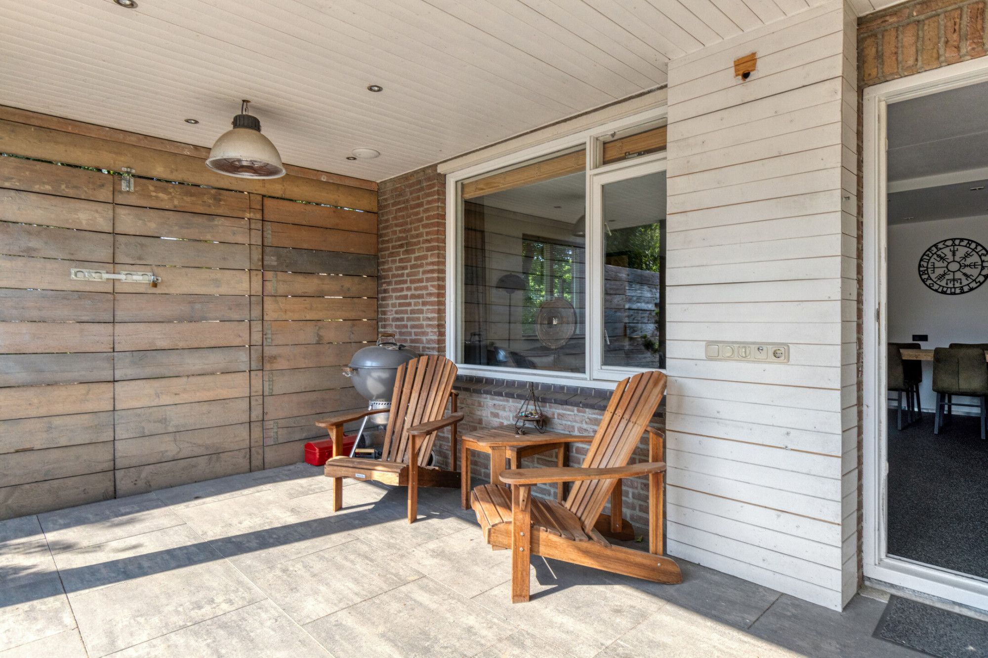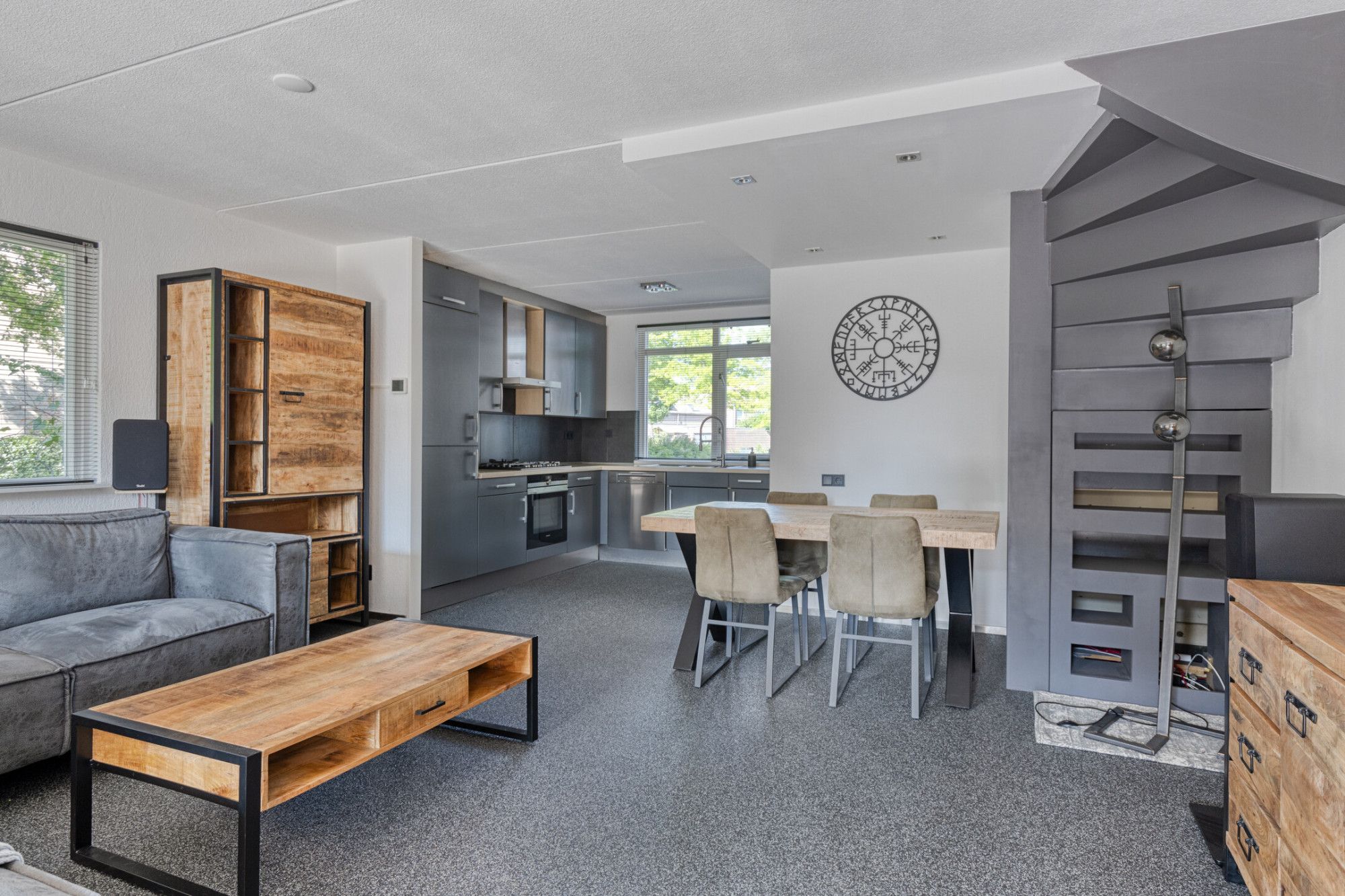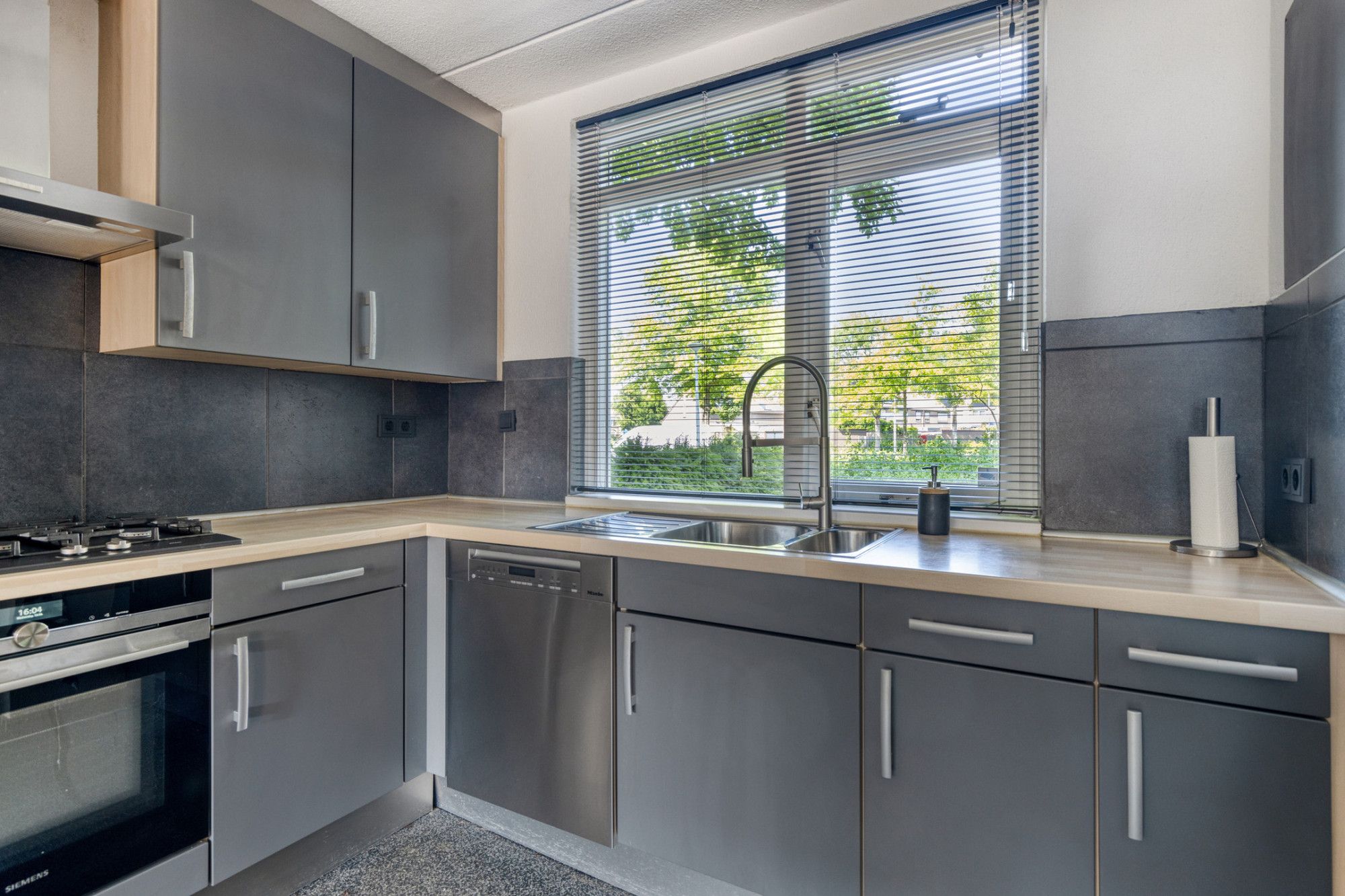 Voortuin. Aan de straatzijde zijn er parkeermogelijkheden. Hal met meterkast en toiletruimte voorzien van hangend toilet en fonteintje. Woonkamer voorzien van siergrindvloer en toegang naar overkapt terras en achtertuin. Aan de voorzijde van de woning is de keuken gesitueerd. De keuken is in hoekopstelling en beschikt over diverse inbouwapparatuur.
