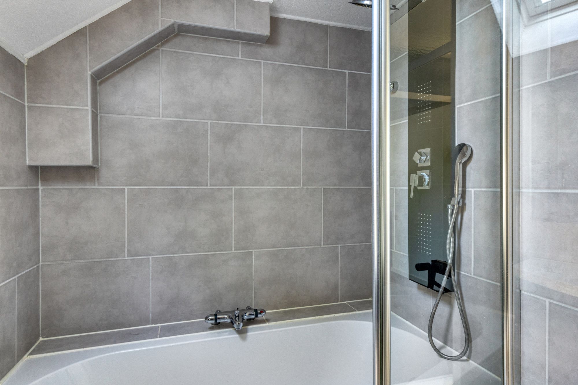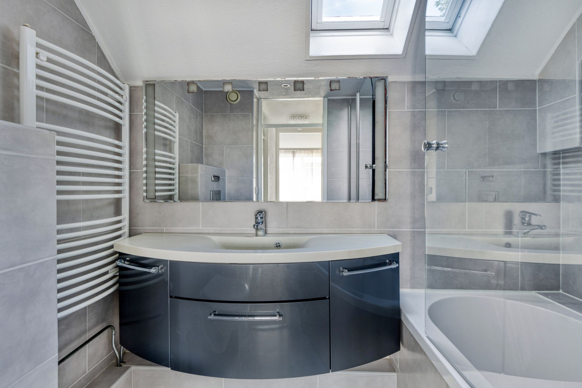 Overloop met toegang naar 2 ruime slaapkamers. Badkamer voorzien van ligbad met douchescherm, wastafelmeubel en 2e hangend toilet.