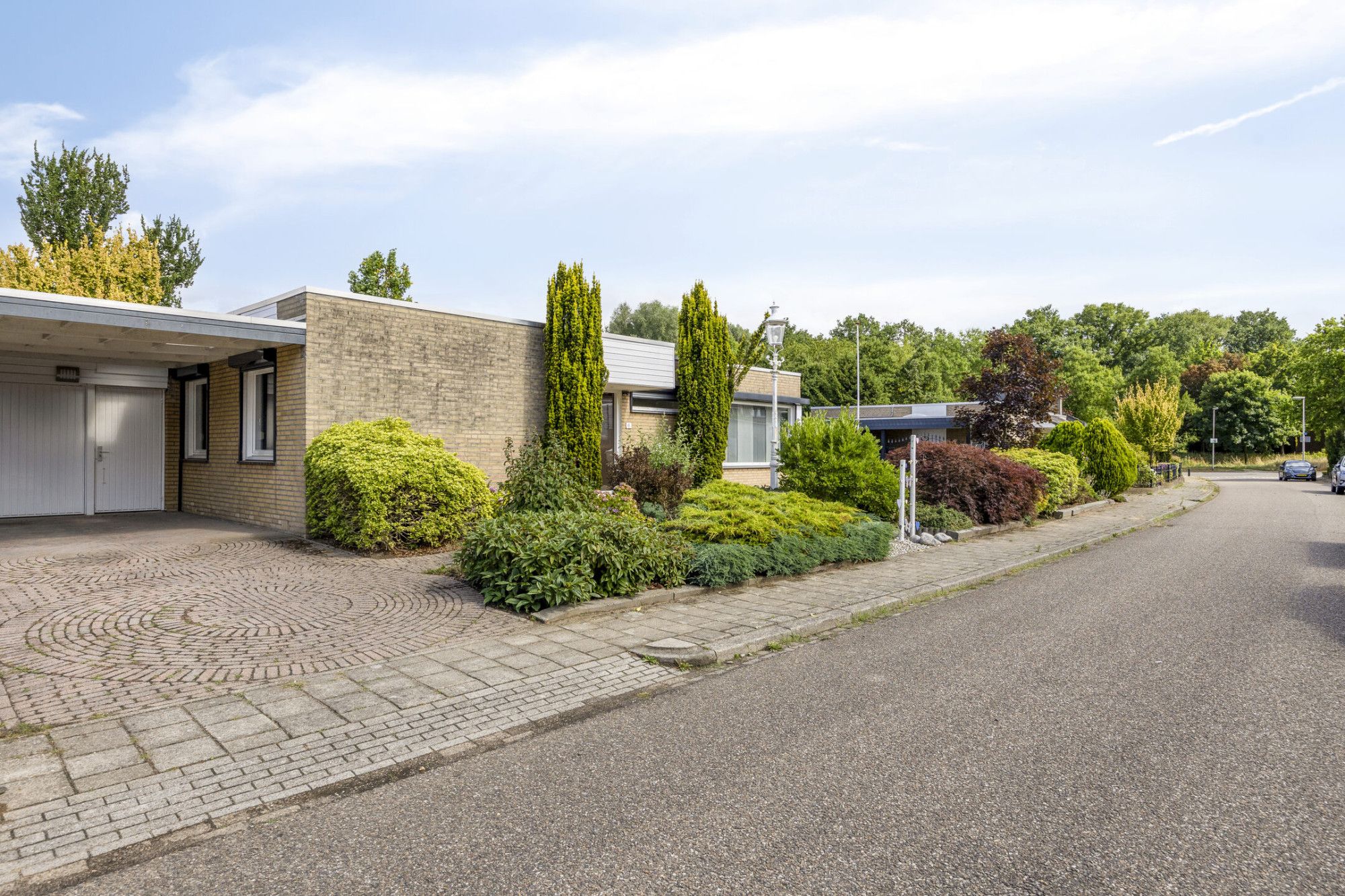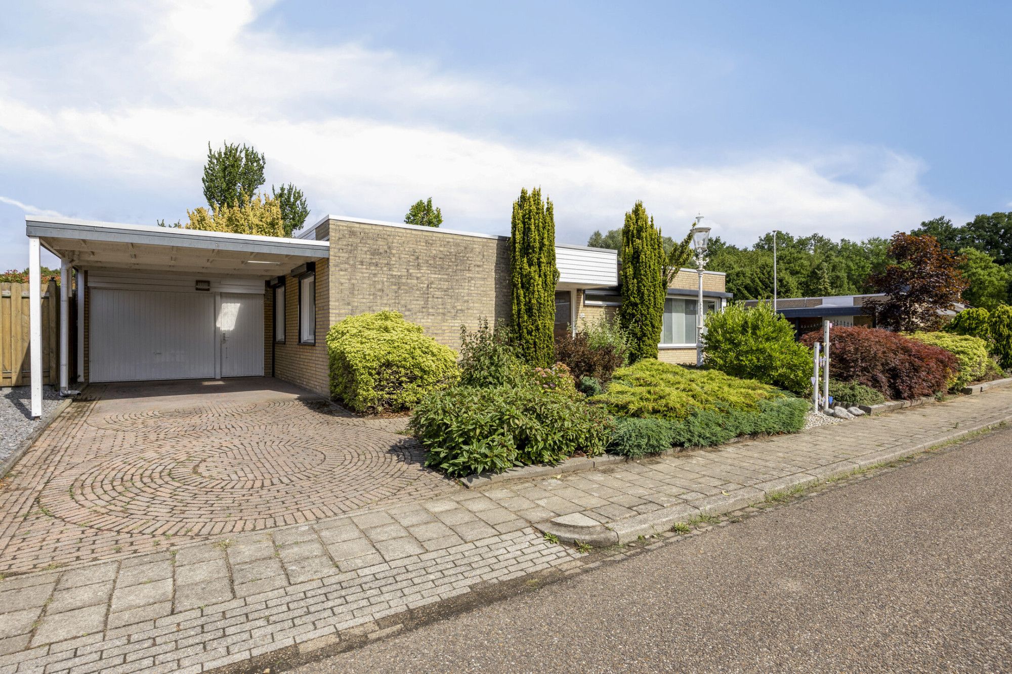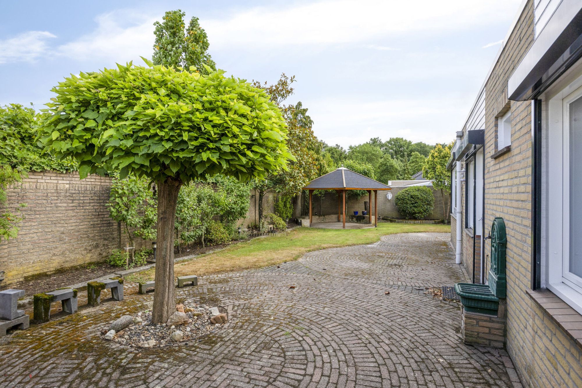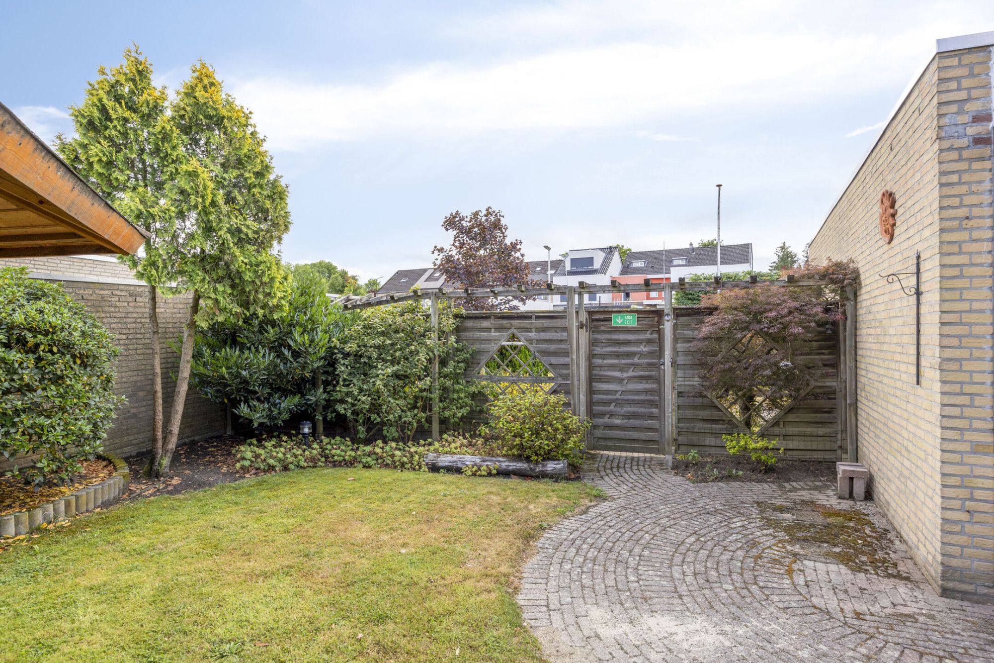 Voor- en zijtuin met royale oprit en garage. Aan de andere zijde van de zijtuin is er een looppoortje naar de achtertuin.