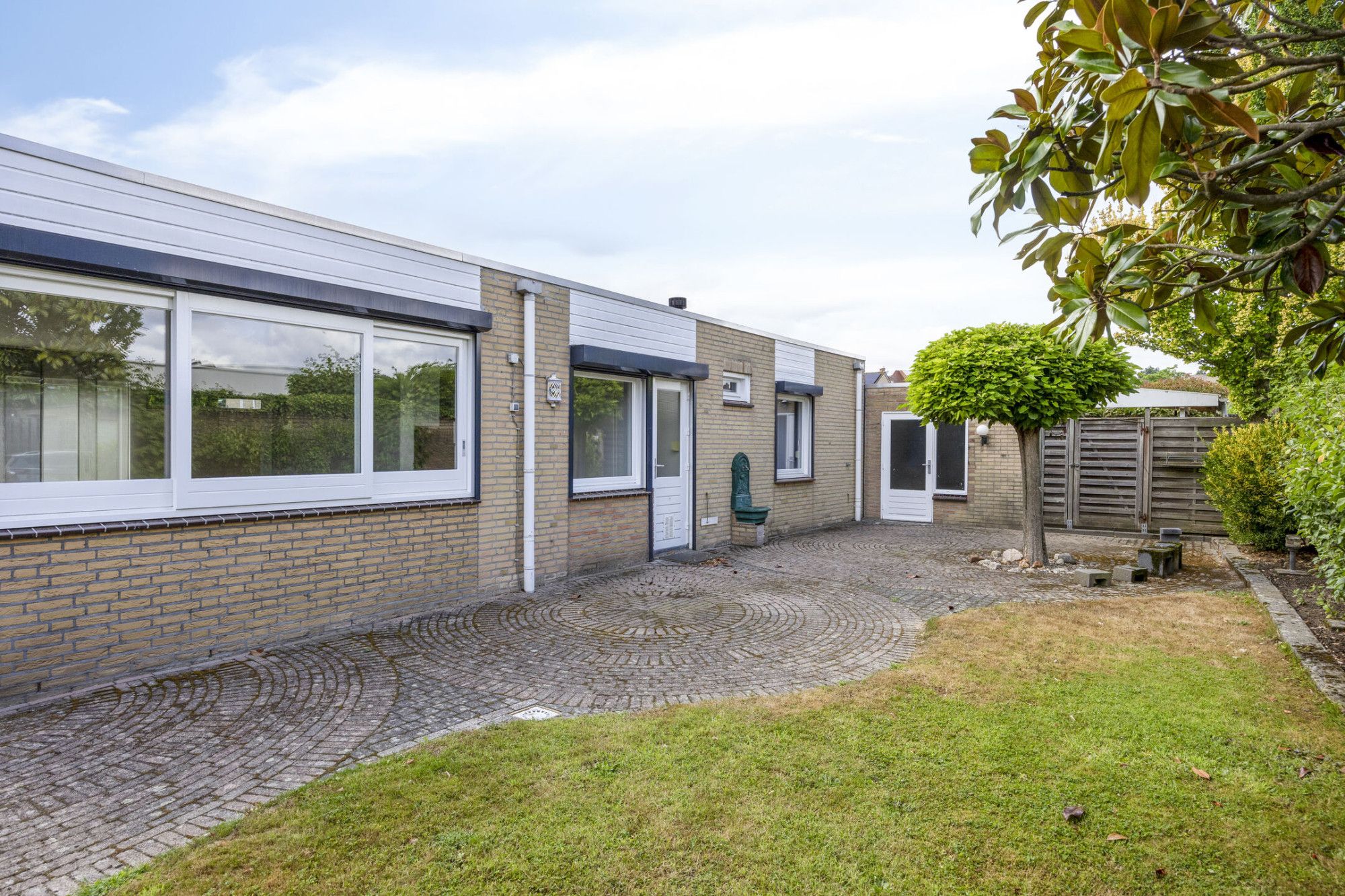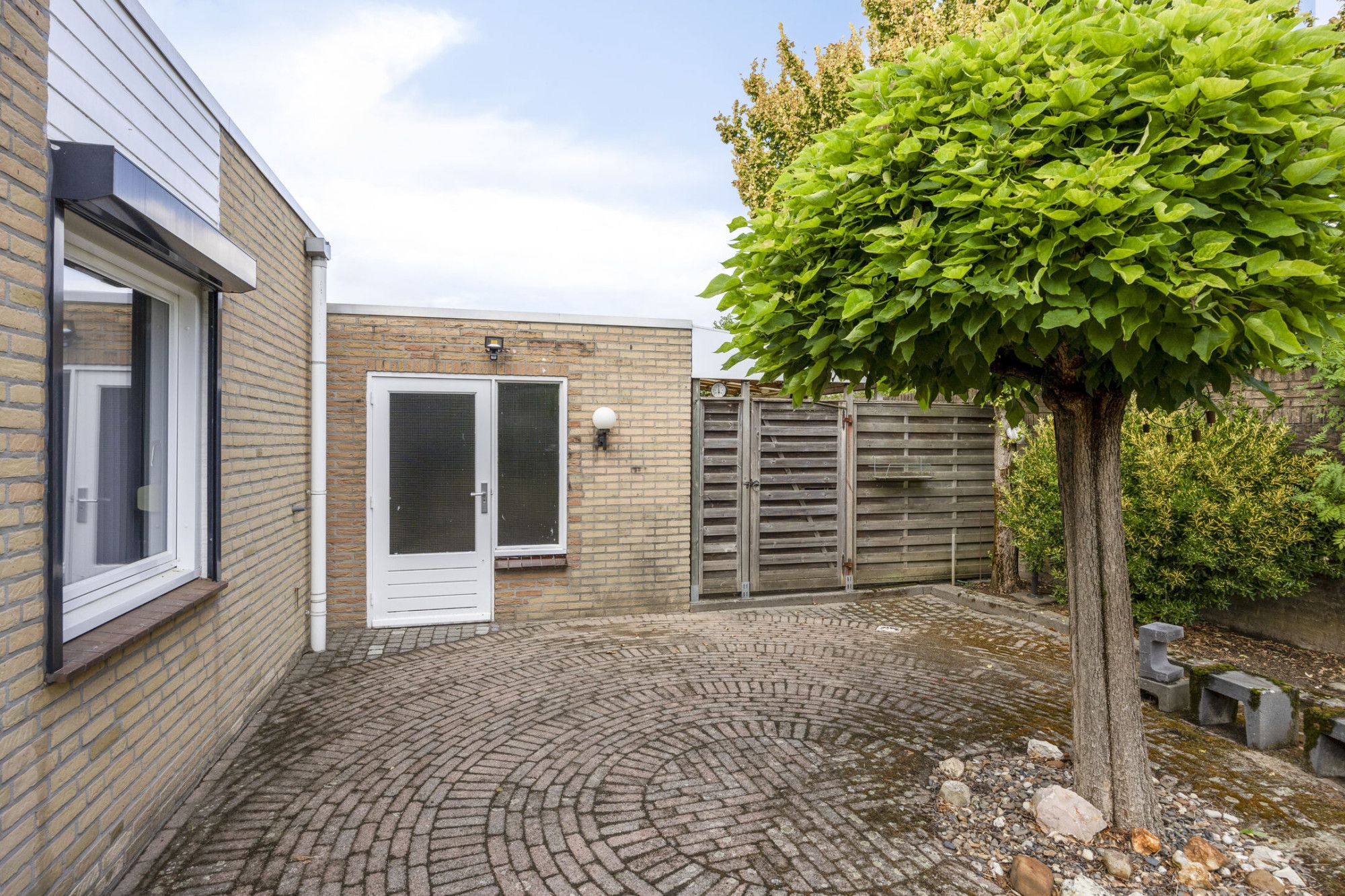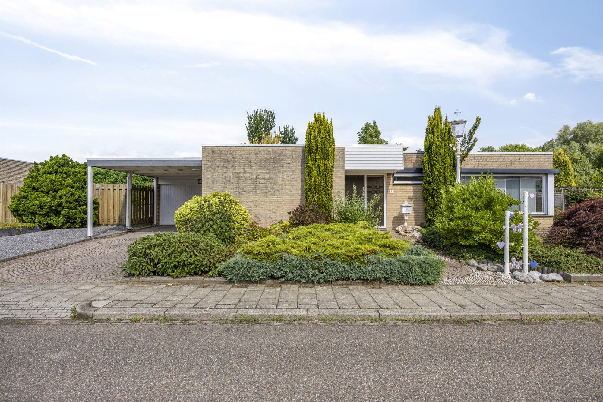 Voor- en zijtuin met royale oprit en garage. Aan de andere zijde van de zijtuin is er een looppoortje naar de achtertuin.