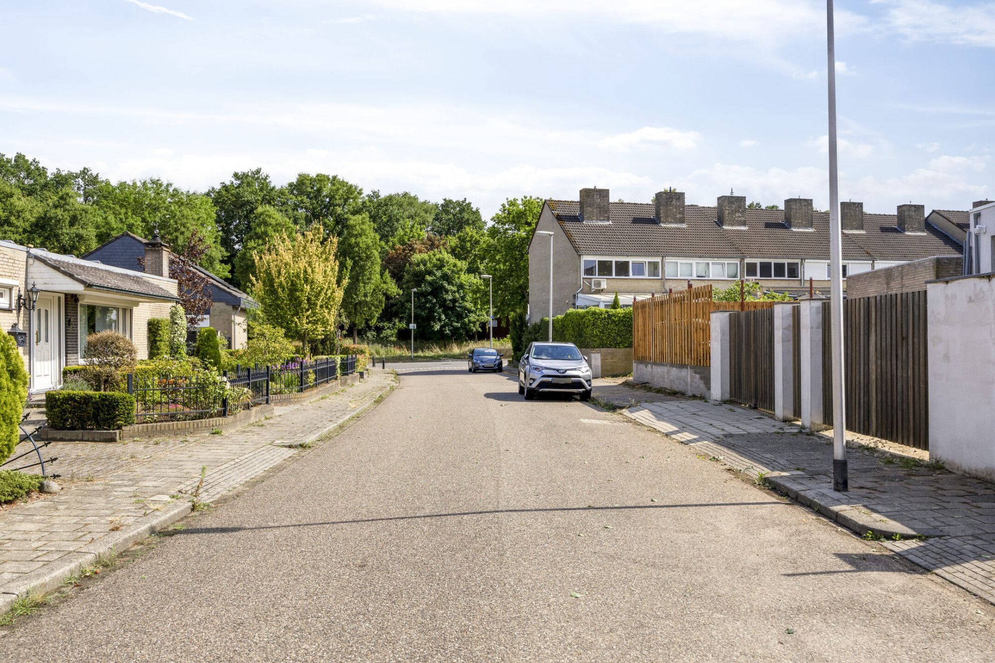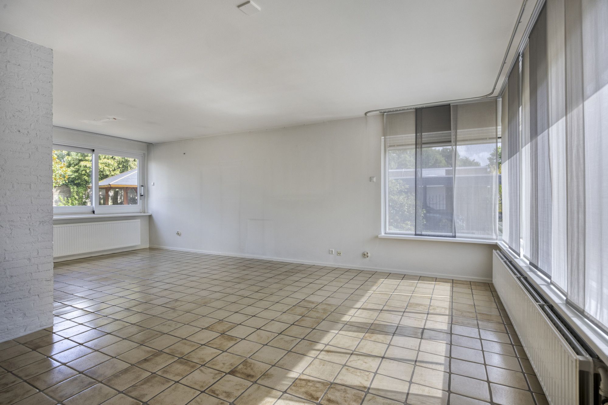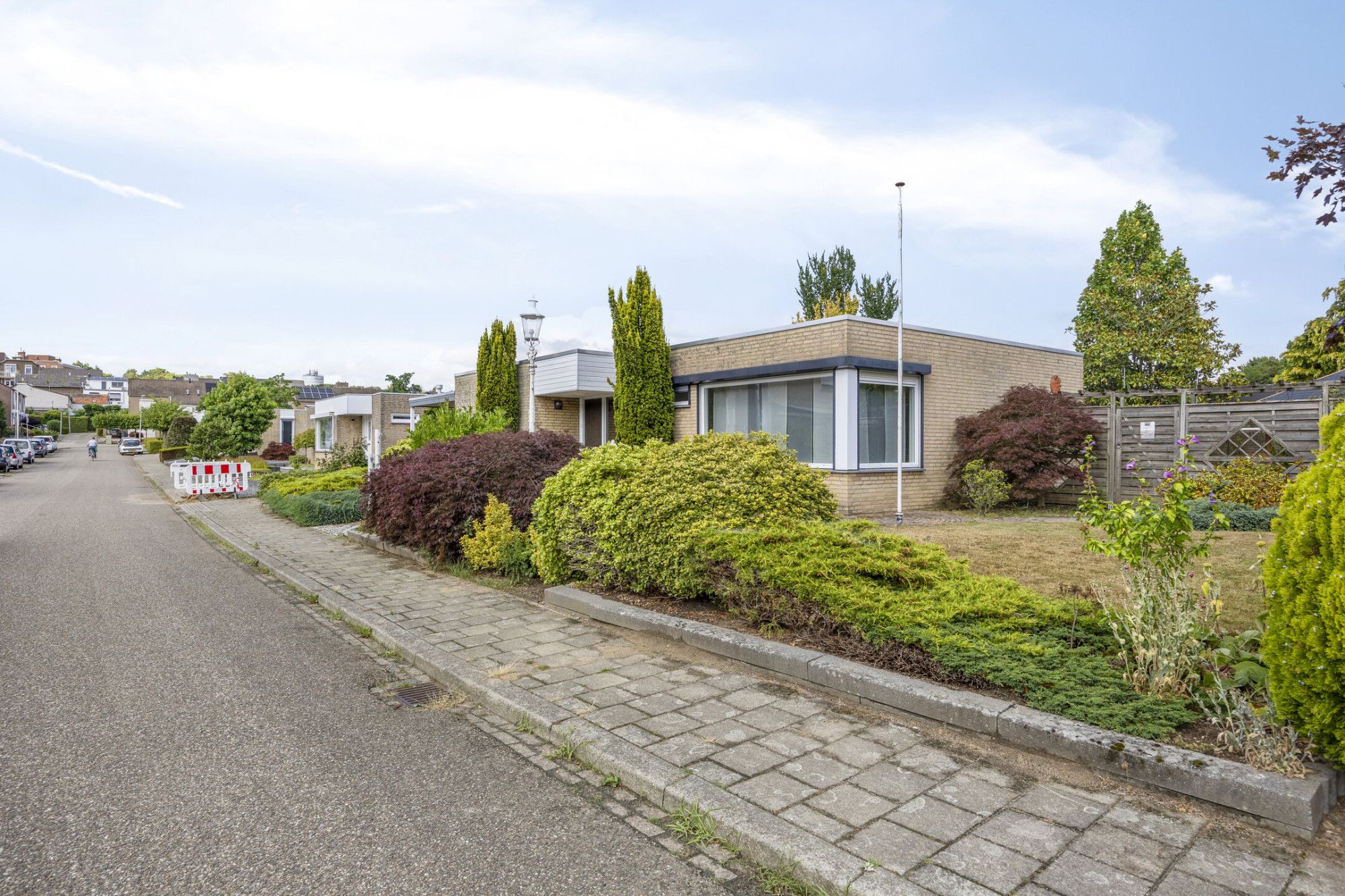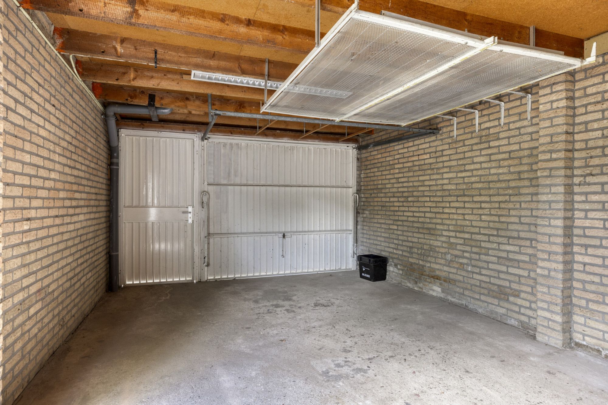 Voor- en zijtuin met royale oprit en garage. Aan de andere zijde van de zijtuin is er een looppoortje naar de achtertuin.