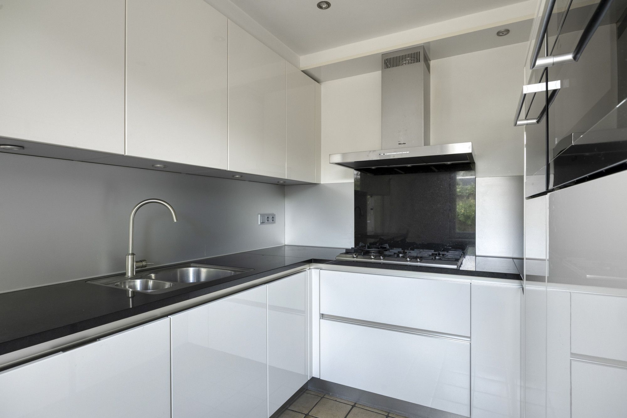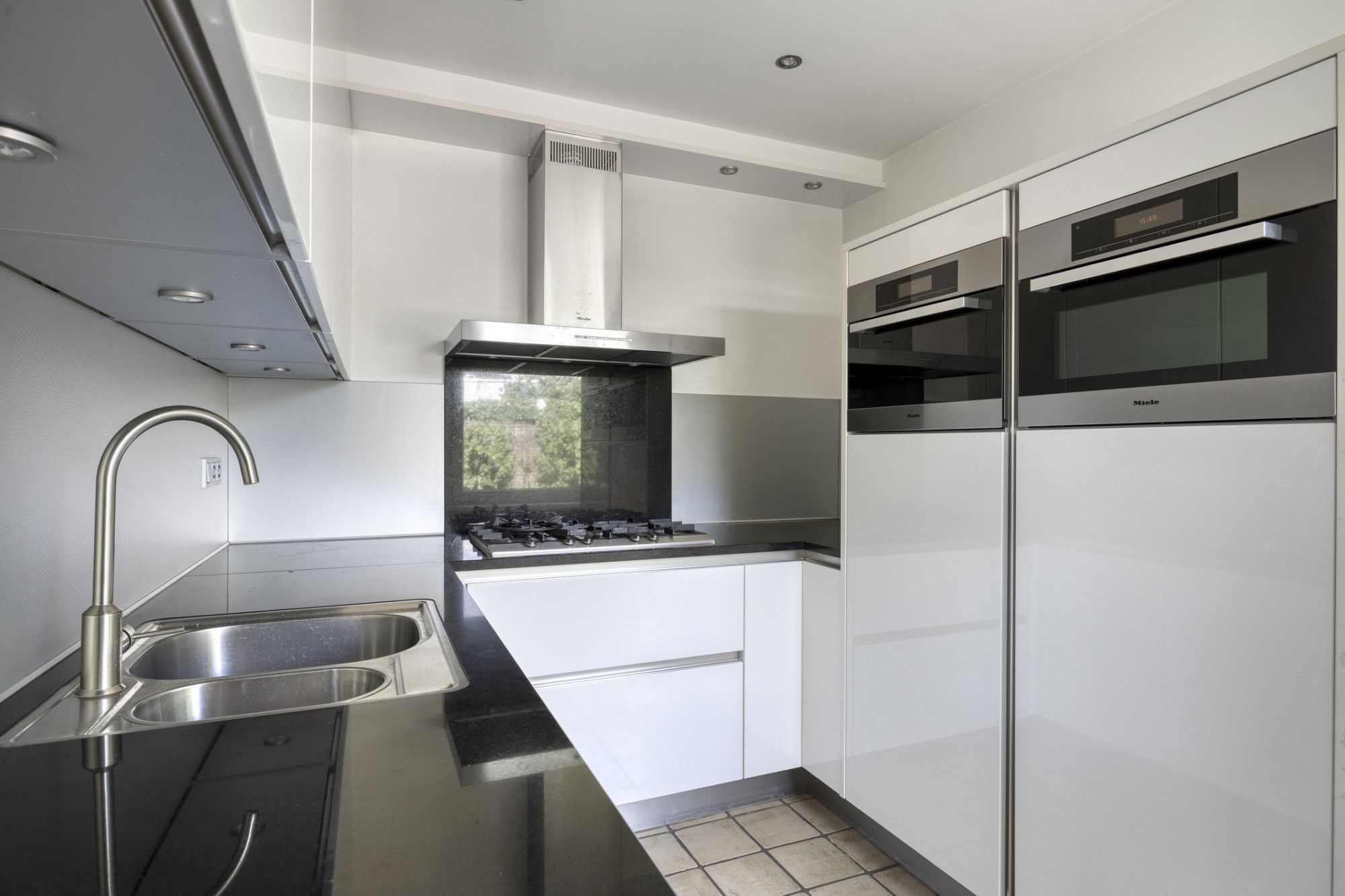 Overdekte entree. Hal met meterkast, washok, toiletruimte voorzien van zwevend closet en fonteintje. Vanuit hal toegang naar de L-vormige woonkamer met grote raampartijen aan de voor- en achterzijde. Halfopen keuken (2008) in U-opstelling voorzien van granieten aanrechtbladen, veel kastruimte en keukeninstallatie met diverse inbouwapparatuur, zoals een Miele combimagnetron en stoomoven. Portaal met cv installatie ( Nefit HR, eigendom) en toegang naar de achtertuin.