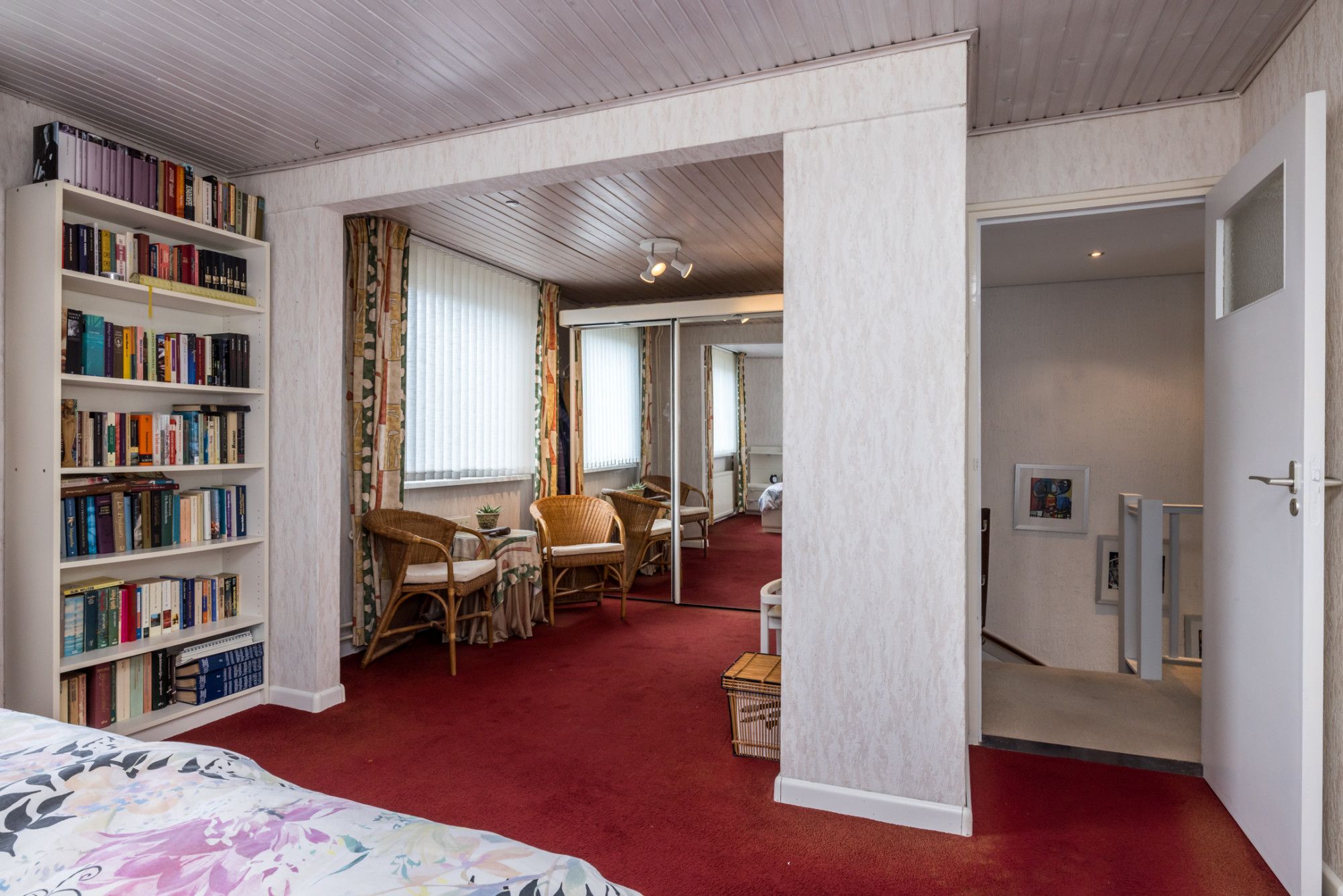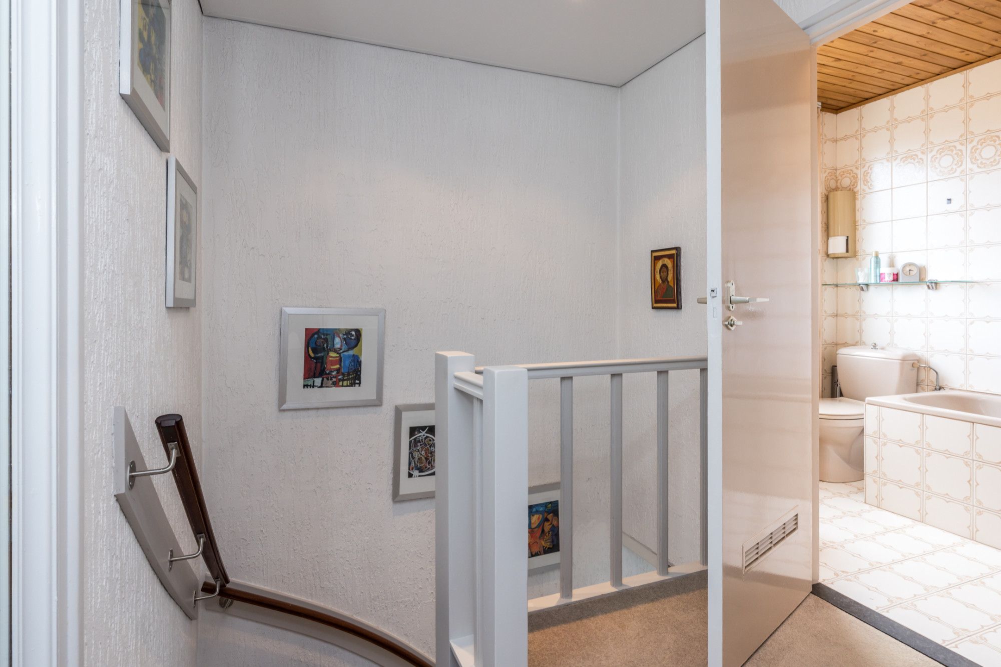 Overloop met toegang naar twee slaapkamers en de badkamer. Aan de achterzijde is de royale ouderslaapkamer gesitueerd. In de basis zijn dit twee aparte slaapkamers. Met een relatief kleine ingreep kunnen deze twee slaapkamers weer in ere worden hersteld. De badkamer is uitgerust met een ligbad (incl. douchefunctie), toilet en wastafel.